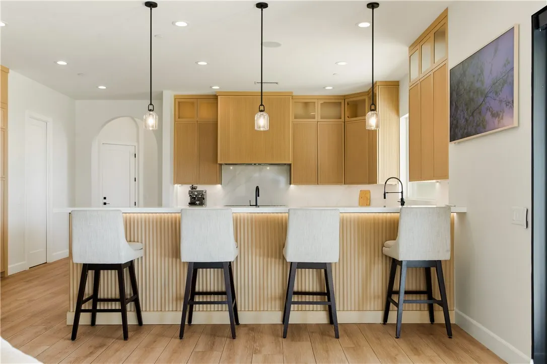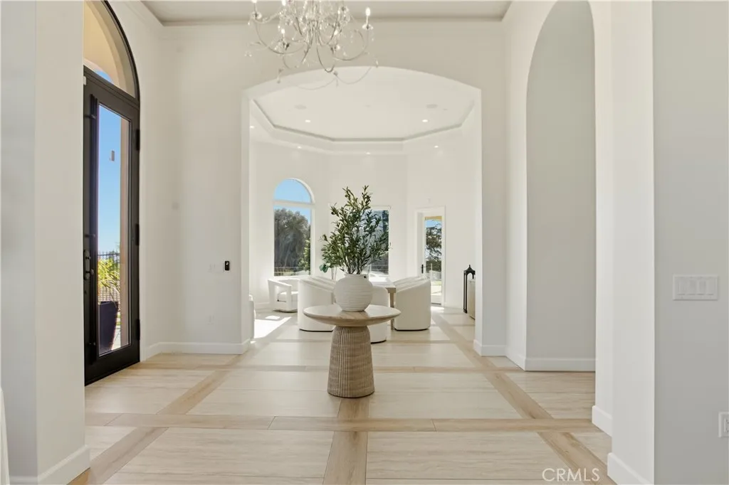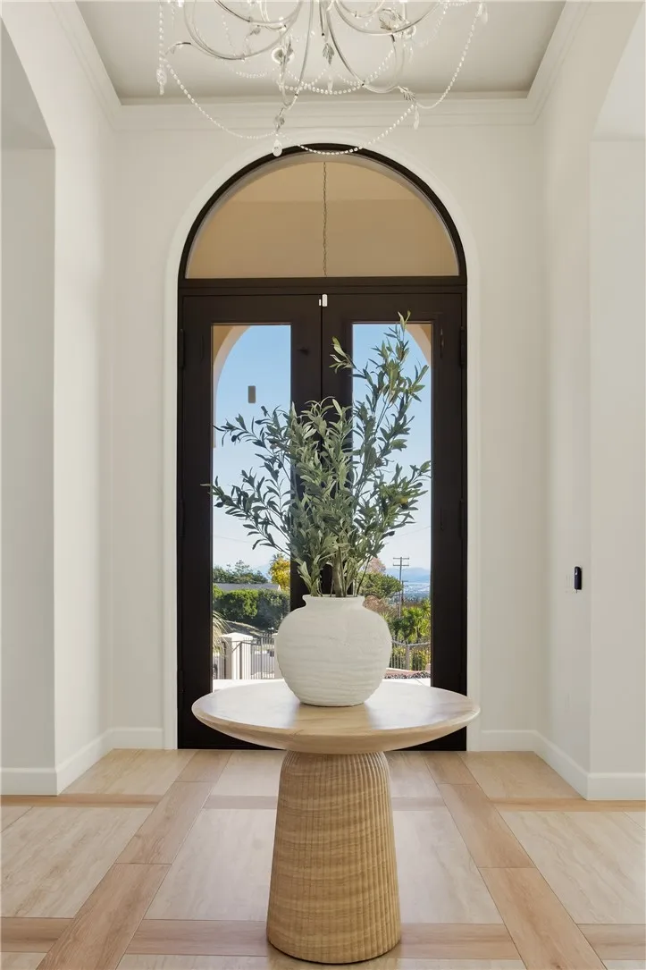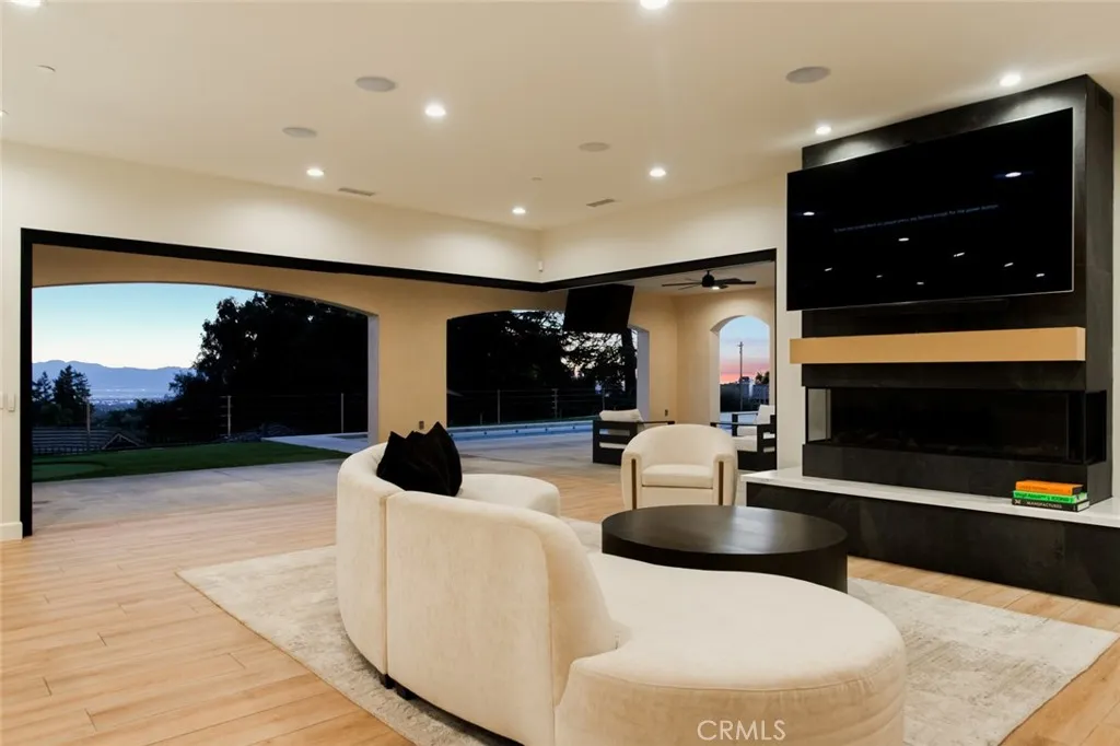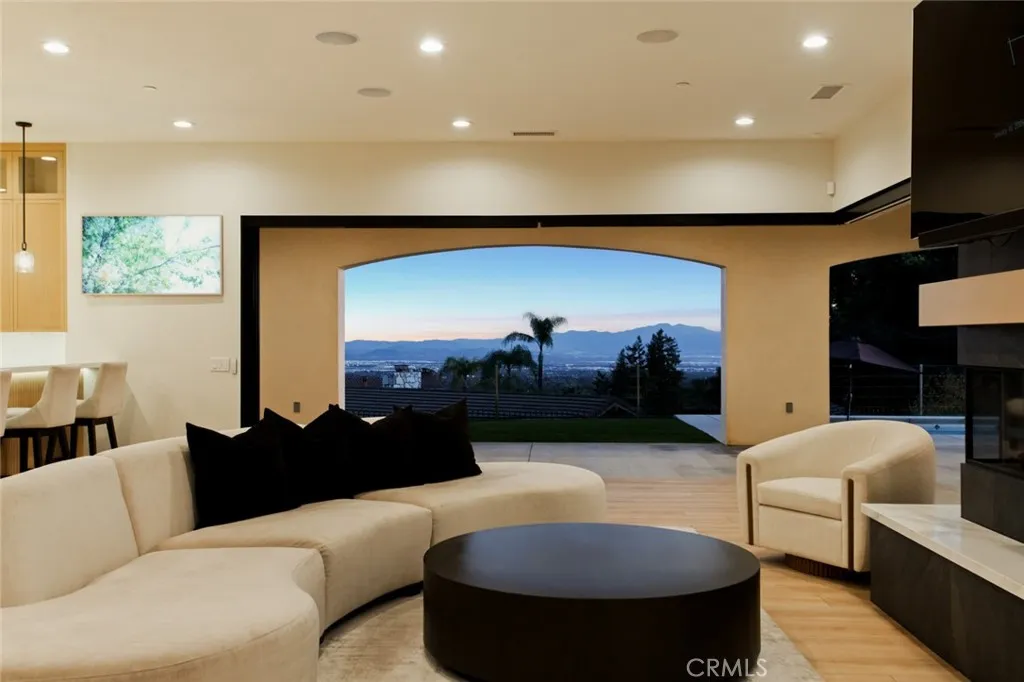 Custom-built single-story residence situated within a private gated setting in San Antonio Heights, positioned to capture sweeping valley and mountain views. This 5,200 sq ft, home features 4 ensuite bedrooms and 6 bathrooms, designed with a strong emphasis on scale, flow, and privacy. The residence showcases refined Mediterranean-inspired architecture paired with a sophisticated, modern interior. A striking entry with oversized double doors opens to expansive ceiling heights, arched windows, and a light-filled open floor plan. Elevated positioning enhances the sense of privacy while providing unobstructed views rarely found in single-level estates. Formal living and dining rooms provide elegant yet functional spaces for entertaining, while the central living area is designed for seamless indoor-outdoor living. The kitchen features Thermador professional appliances, extensive counter space, custom cabinetry, and a large breakfast bar, opening to a grand great room with fireplace. Retractable glass doors lead to approximately 1,730 sq ft of covered outdoor living, including a spacious loggia overlooking the pool, putting green, and expansive valley backdrop. The primary suite offers a serene retreat with panoramic views, fireplace, generous walk-in closet, and a spa-like bath featuring dual vanities, a freestanding soaking tub, and a separate walk-in shower. One bedroom has been configured as a private studio with kitchenette and bathroom, offering flexibility for guests, multigenerational living, or extended stays. The property also includes whole-house LED lighting, an integrated audio system, security cameras, solar panels, electric vehicle charging, and a gated drive with RV parking. The grounds provide ample space for recreation, entertaining, or pets, all within a secure and private setting. A rare opportunity to own a gated, single-level estate in San Antonio Heights with commanding views, architectural refinement, and modern amenities.