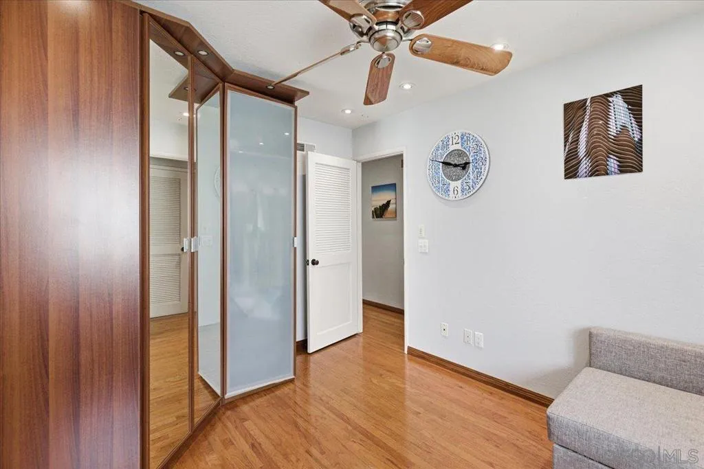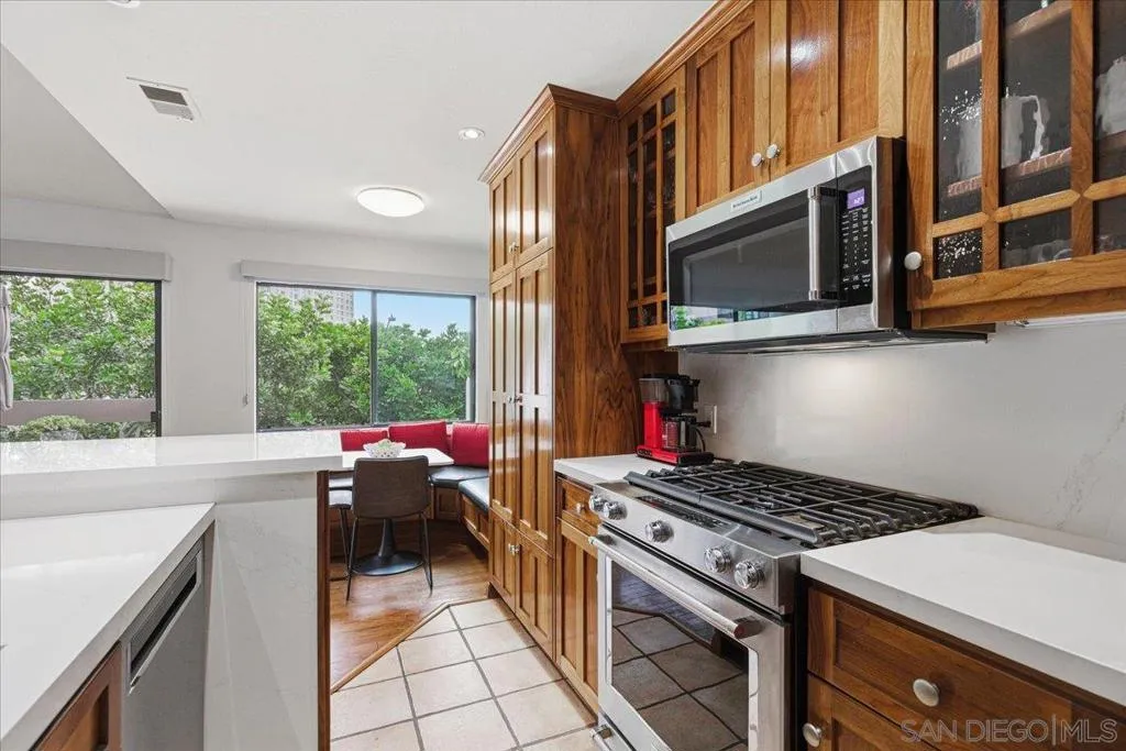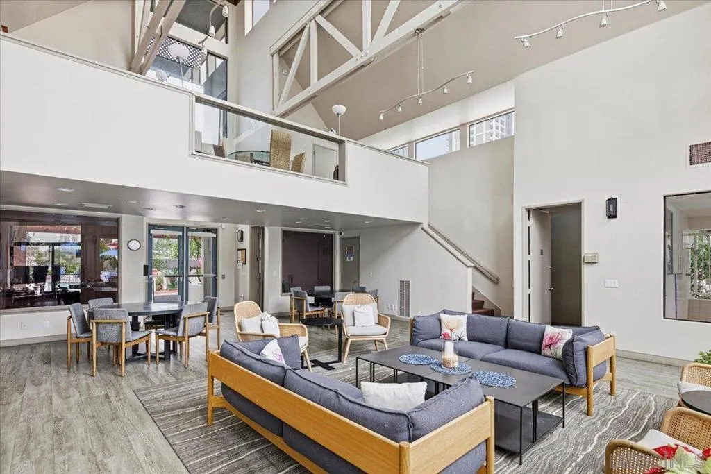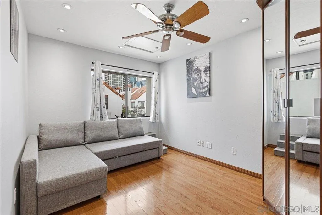 Experience elevated townhome living in the heart of Downtown’s prestigious Marina District within the coveted Park Row community. This exceptional second-story residence welcomes you with rich hardwood floors, soaring ceilings, and an airy open-concept design that blends sophistication with warmth. The expansive living room is illuminated by oversized windows and skylights, while a striking walnut-trimmed fireplace with art tile detailing creates an elegant focal point. A versatile dining area flows seamlessly into the timeless kitchen, thoughtfully appointed with custom black walnut cabinetry, quartz countertops, gas cooking, and refined finishes throughout. Oversized sliding glass doors extend the living space outdoors to a private balcony, where city views stretch toward Seaport Village and the Bay, an ideal setting for effortless indoor-outdoor entertaining. A custom-designed staircase leads to a bright, architectural loft featuring a built-in executive office for two (or bedroom), complete with solid wood desks, extensive bookcases, and integrated storage. A second set of sliding doors opens to an exclusive rooftop deck—perfect for sunset views and starlit evenings above the city. The private primary suite offers a tranquil retreat with a generous jetted soaking tub and a recently remodeled spa-inspired shower. Additional highlights include central air conditioning, in-unit laundry, recessed lighting, and abundant storage. Park Row residents enjoy lush park-like grounds adorned with sparkling fountains, a resort-style pool and spa, secured underground parking, 24-hour gated security, and ample guest parking, all just moments from waterfront dining, Seaport Village, The Rady Shell, Petco Park, the Gaslamp Quarter, the Convention Center, Balboa Park, and San Diego International Airport. A rare opportunity to enjoy refined townhome living in one of Downtown’s most distinguished locations.