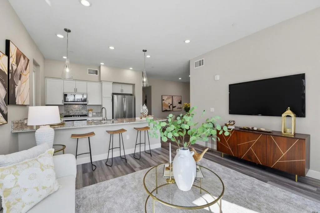 Immaculate and Impeccable Condition! Welcome to this impressive corner 3-bedroom, 2-bath residence in the Latitude community at Communications Hill. Designed for modern living, this end-unit home features an airy open-concept layout filled with natural light streaming from multiple directions. Recessed lighting, expansive windows create a bright, inviting atmosphere throughout. The contemporary kitchen is a true centerpiece, offering a generous island, sleek quartz counters, and premium stainless steel appliances ideal for home chefs and entertainers alike. Step outside through the sliding doors to a private balcony and take in sweeping views of the city and surrounding hills. The primary suite delivers comfort with a spacious walk-in closet and a refined ensuite bath, while additional bedrooms provide flexibility for guests or a home office. Smart touches such as powered window shades and energy-efficient design add everyday convenience. Enjoy the walking trails, nearby Lewis Manly Park, and quick access to shopping, dining, and major commuter routes.