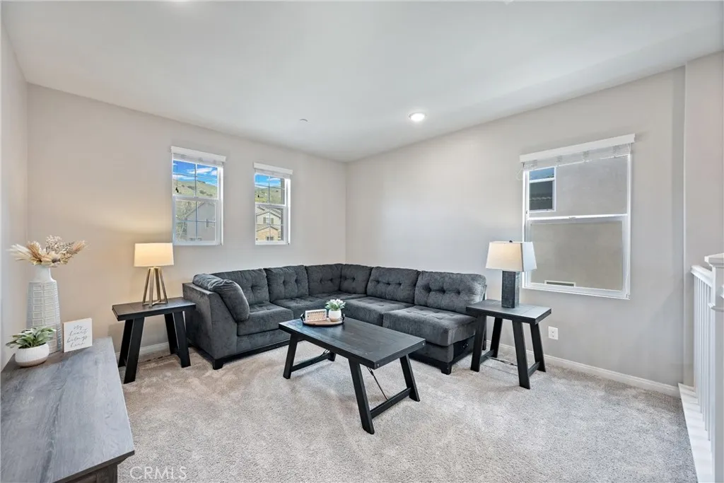 3 BED + OVERSIZED LOFT + DEN | GORGEOUS BUILDER UPGRADES| GOLF CART COMMUNITY | GATED + GUARDED | TURNKEY & MOVE-IN READY | Welcome to this stunning home in the highly desirable Terramor community, where elevated living meets resort-style amenities. A charming front porch sets the tone for the warmth and elegance found throughout. Step inside a formal entry highlighted by luxury plank flooring & abundant natural light that flows effortlessly into the open-concept living space. The heart of the home is the Chef’s Kitchen, thoughtfully designed with an oversized island, breakfast bar seating, quartz countertops, stainless steel appliances, dedicated coffee bar, ample cabinetry, pantry & custom lighting. The adjacent Dining Room creates seamless indoor-outdoor living with impressive accordion folding doors that open to the backyard, making entertaining effortless. Built-in speakers throughout the living room, kitchen, dining room, & backyard create the perfect ambiance for gatherings both inside and out. Upstairs, the spacious Primary Suite offers a private retreat featuring an Ensuite Bathroom with dual-sink quartz vanity, a deep soaking tub, walk-in shower, and privacy door. The Primary Bedroom also includes built-in speakers, allowing you to unwind in comfort with your favorite music. Bedrooms #2 & #3 are generously sized and ideal for family or guests. Bathroom #2 includes dual-sink vanity with quartz countertops, a shower/tub combination, & its own privacy door. An oversized Loft provides flexible space for a media room or play area, while a separate Laundry Room with shelving & storage adds everyday convenience. Downstairs, an oversized Den offers the perfect setting for a home office or additional entertaining space, complemented by a well-appointed Powder Room. The backyard is truly an entertainer’s dream, showcasing full-wall accordion doors that extend your living space into a beautifully designed California Room, enhanced by integrated outdoor speakers for the ultimate hosting experience. A two-car garage + ample street parking make hosting holidays & gatherings easy. ENERGY EFFICIENCY: Solar, recessed lighting, & artificial turf in the backyard allow modern comfort and savings. AMENITIES: Enjoy a resort-style pool, parks, dog parks, clubhouse, & guarded entry. LOCATION: Nearby find shopping, restaurants, cinemas & quick access to OC via 15/91 Expressways & 241 Toll. This is more than a home—it’s a lifestyle of comfort, elegance, and community.