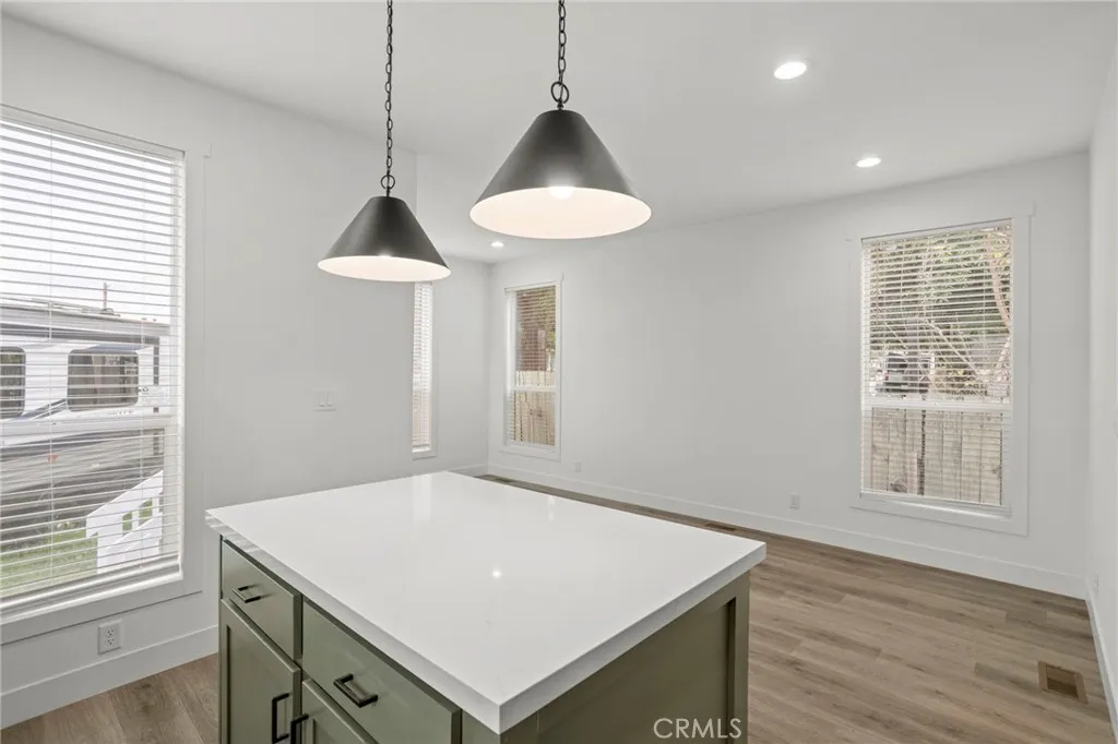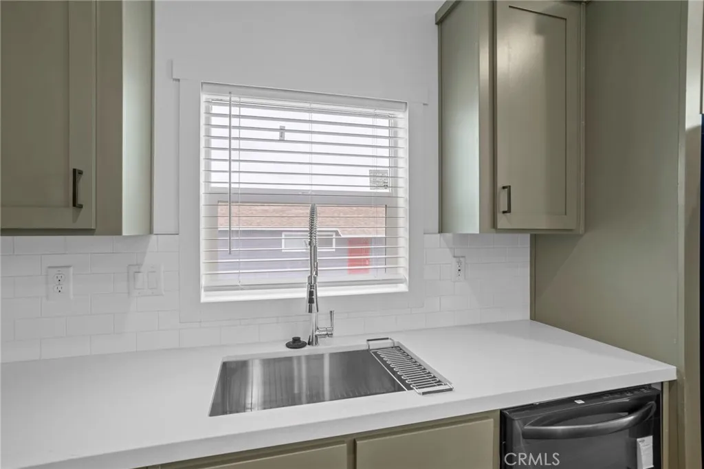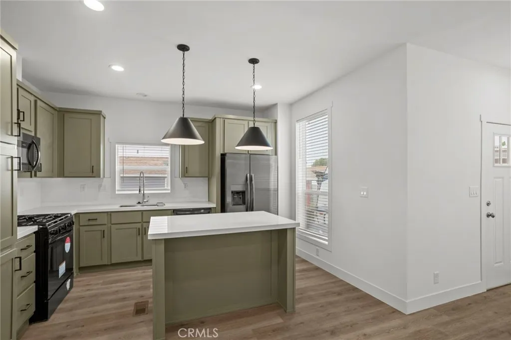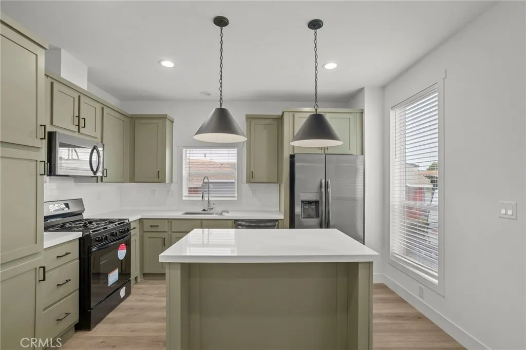 The interior features high ceilings, recessed lighting, and durable laminate flooring throughout the main living areas. The bright living room flows seamlessly into the kitchen, creating an open-concept feel that is ideal for everyday living. The kitchen is equipped with quartz-style countertops, shaker cabinetry in a contemporary Clover finish, a subway tile backsplash, and stainless steel appliances, including a gas range, dishwasher, and refrigerator, along with a deep farmhouse-style sink.