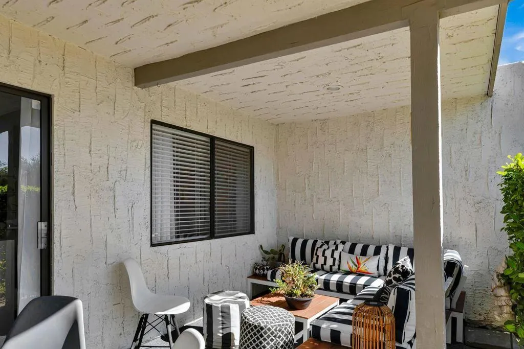 Reduced price. Move-in-ready single-story 3BD/2BA home, designed by Hugh Kaptur, only attached at the garage. Like a single-family home! Located in the gated community of Sunshine Villas in south Palm Springs, the 1.342 sq. ft. corner-lot home offers privacy, abundant natural light, expansive mountain views, and easy indoor-outdoor flow. The setting is exceptionally convenient, positioned across from Sunrise Park, the City pool, and skate park, with quick access to shopping, dining, and downtown. Inside, the home has been extensively updated with a newer HVAC system, water heater, flooring, baseboards, and electrical outlets. The kitchen features a white quartz waterfall island and backsplash, along with stainless steel appliances. Both bathrooms have been refreshed with modern vanities and touchscreen-lit mirrors. The home has been freshly painted museum white, including the garage, and complemented with new lighting, including two Italian designer modern fixtures. The garage and back patio are finished with commercial-grade carpeting, and a separate covered patio provides a private space for outdoor dining or morning coffee. Sunshine Villas offers four pools and spas, four newly painted pickleball/tennis courts, a bark park. This home has completed Phase 2 of the community's desert landscaping project, which has already reduced water bills and maintenance costs with upgraded irrigation. A significant advantage is that the Seller has paid all fees to extend the land lease to 2076 (51 years), with a unique successor land lease at $190 per month for the next 17 years, far lower than many newer leases in the area. Optional furnishings are available outside of escrow for buyers seeking a more turnkey home. This renovated Kaptur-designed home combines architectural appeal, modern updates, and a central Palm Springs location, ideal for full-time living, seasonal use, or as an investment property. This one you will want to see!