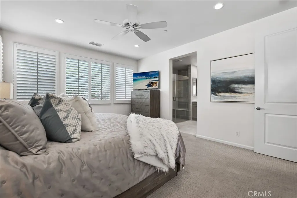 The kitchen is both refined and functional, featuring dove-gray cabinetry, quartz countertops, a large center island with storage and seating, and a walk-in pantry. The primary and secondary suites are positioned on opposite ends of the main level for privacy. The primary suite includes plush carpeting, plantation shutters, a ceiling fan, custom walk-in closets, and a spa-like bath with a tiled walk-in shower, bench seating, dual-sink vanity, quartz counters, and a dedicated powder area. The secondary suite features an attached bath with walk-in shower, bench, tile flooring, and quartz-topped vanity.