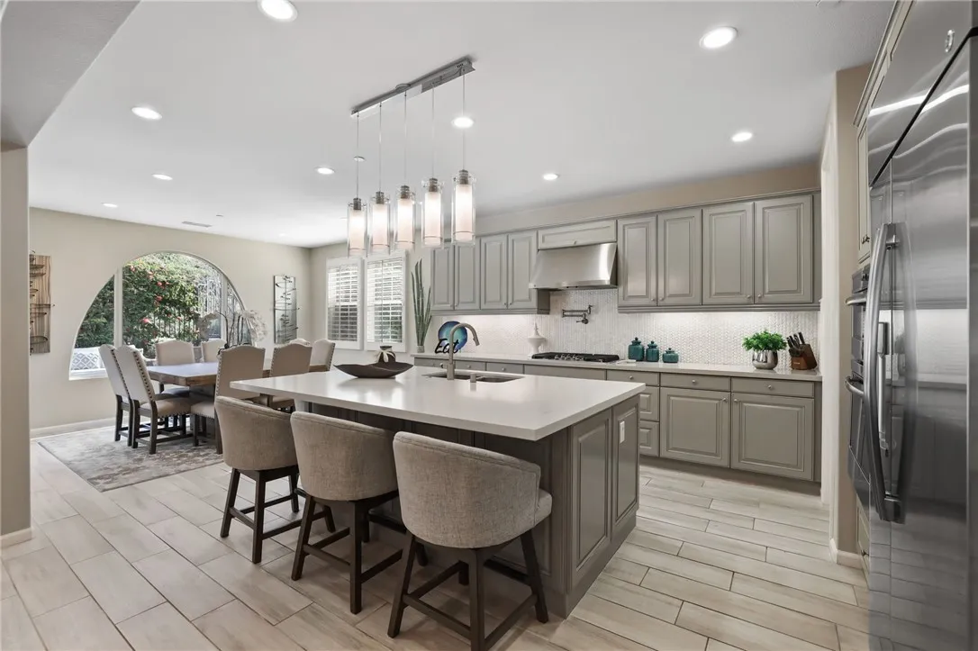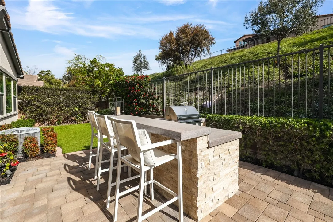 The main living level features wood-look tile plank flooring and an open, light-filled layout connecting the living, dining, and kitchen spaces. Recessed lighting, a custom built-in media center, and a four-panel stacking sliding door create a seamless indoor-outdoor flow. The backyard is designed as a true extension of the home, ideal for entertaining or unwinding. A covered patio with recessed lighting and ceiling fans anchors the space, complemented by expansive pavers, a gas fire pit with tumbled stone surround, and a built-in BBQ island with bar seating and concrete countertops. Artificial turf and three cascading fountains add a sense of calm and low-maintenance luxury.