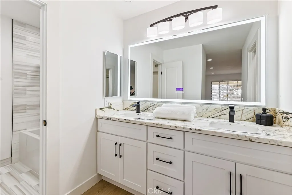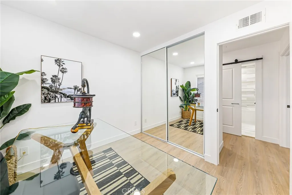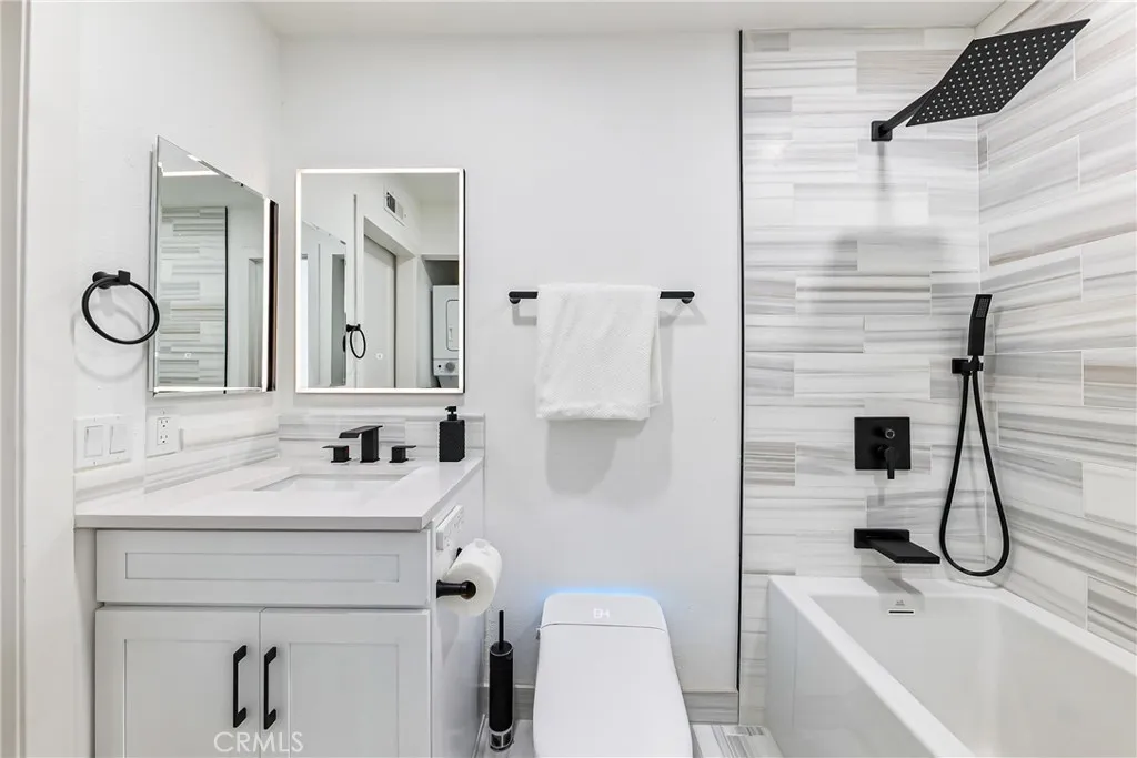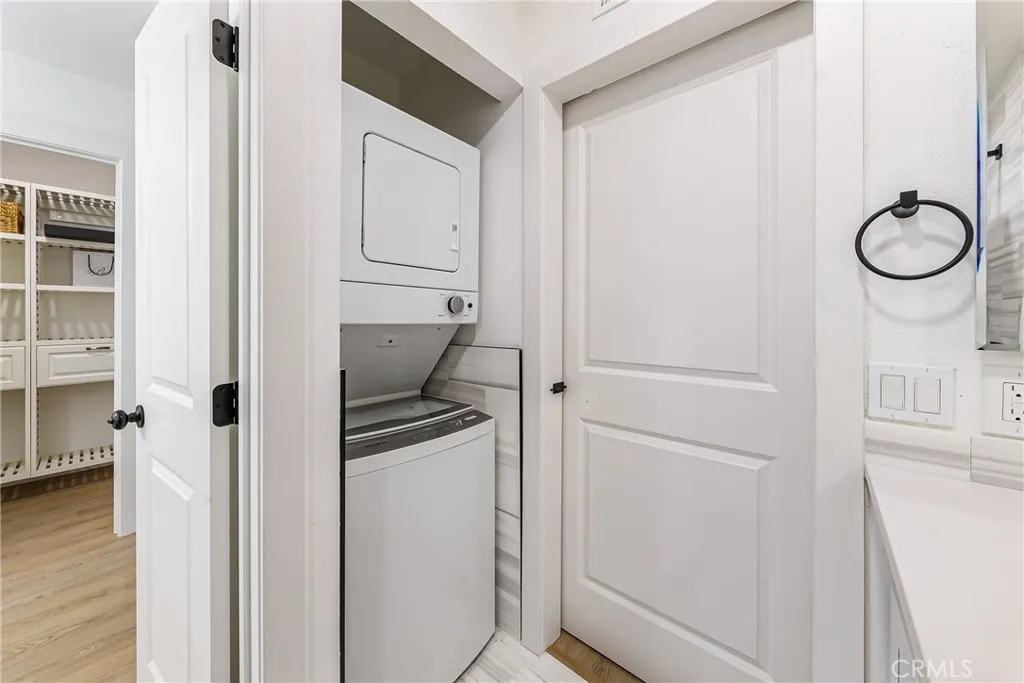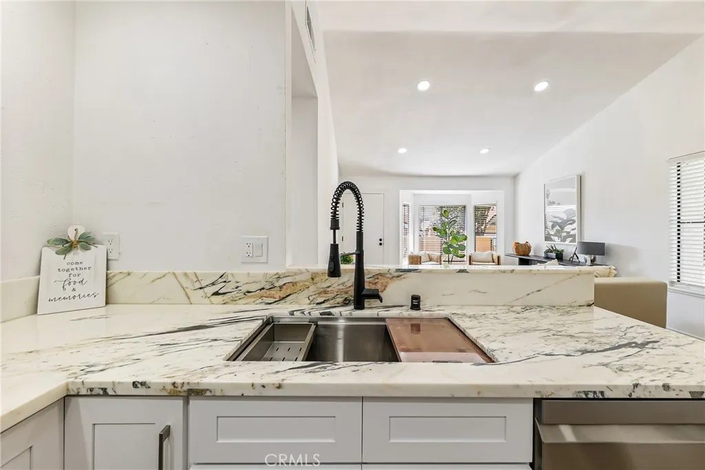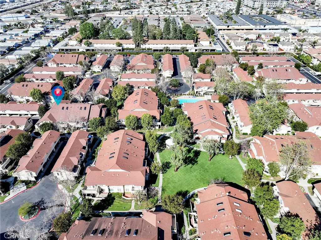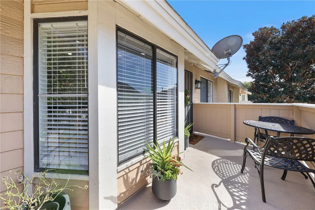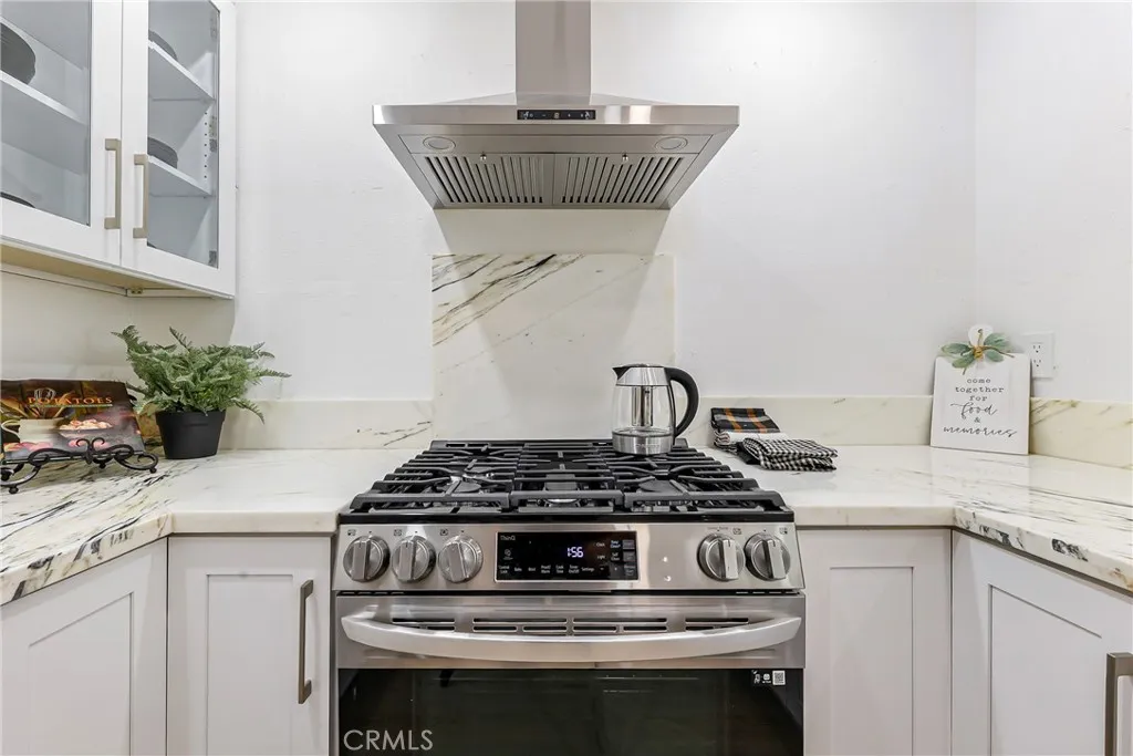 Gorgeous 2 bedroom home with vaulted ceilings. This home features a new custom kitchen with Built-in China cabinet beveled glass and two built-in pantries with custom marble counters. New Stainless Steel LG appliance's included in sale. Gas range, refrigerator and dishwasher. Beautiful Custom Marble counters and cabinets in bath & main suite. All new plumbing fixtures. Large deep custom tub with rain shower. Lighted mirrors with WIFI. Mirror wardrobe, large walk-in closet with built-ins. Washer/Dryer included in sale. Recessed lighting in all rooms with dimers. Waterproof laminate flooring. This pristine condo offers privacy, convenience, and true turnkey living. Completely remodeled throughout, New outside decking just completed. Central heating & air-conditioning. New thermostat. Freshly painted with all new door hardware. This is a true modern upgraded home to enjoy and entertain your guests. A safe and Guard gated community. Freestanding Electric Fire Place included. Within 1 minute walking distance of the pool & jacuzzi. Knott's berry Farm, and several entertainment and restaurant's facilities close by. Easy and close commute to 405/22 freeways, many restaurants & entertainment close by. Close to the pool and other amenities. One covered assigned parking space with plenty of guest parking spaces. This home is Pride of Ownership.