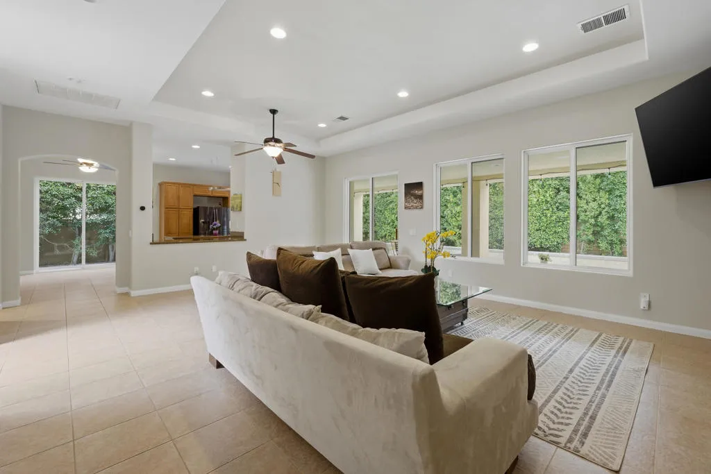 Fabulous Desert Cove Entertainer. Private Quarter Acre Oasis with Resort Living. Don't miss this exceptional opportunity to own a stunning Desert Cove home designed for effortless indoor outdoor living on a rare and highly desirable quarter acre lot. Surrounded by mature landscaping and exceptional privacy, the property feels like your own secluded oasis while still being less than six minutes from town, dining, and shopping. Located in one of La Quinta's lowest HOA gated communities, you will enjoy security, value, and peace of mind. Offering five bedrooms and five bathrooms, the home includes four bedrooms in the main residence plus a spacious detached casita that is ideal for guests, multigenerational living, or a private retreat. Inside, tile flooring flows through the main living areas with updated waterproof laminate flooring in all bedrooms and the casita. LED lighting, soaring 10ft ceilings, and an open great room create a bright and welcoming atmosphere. The space is anchored by a custom stone surround fireplace, expansive windows, and sliding glass doors that connect seamlessly to the backyard. The family style kitchen is perfect for gatherings and features an oversized island, GE Profile stainless steel appliances, double ovens, built-in microwave, beverage cooler, filtered water system to the sink and Samsung refrigerator, plus a French door leading outdoors. A charming breakfast nook with sliding doors opens to the side yard for relaxed mornings and evening breezes.The primary suite offers a peaceful retreat with dual closets, a soaking tub, glass enclosed shower, dual vanities, a towel warmer, and direct access to the pool terrace.Step outside to the private courtyard with a custom Breeo hardwood cooking fire pit and grill, creating the perfect setting for memorable dinners under the stars.The resort style backyard, features a custom pool and spa (installed in 2020) with a tanning shelf, bond beam, two water features, Pentair WhisperFlo pump, saltwater system, Pentair MasterTemp heater, WiFi app automation, LED color changing lights, a custom gas fireplace, extensive concrete decking, sidewalks, and professional landscaping with exterior LED lighting. The oversized lot provides space, serenity, and privacy that is rarely found in the neighborhood. Additional highlights include a three car garage. The double garage is finished with epoxy flooring, and the third garage features laminate flooring and offers flexible space.