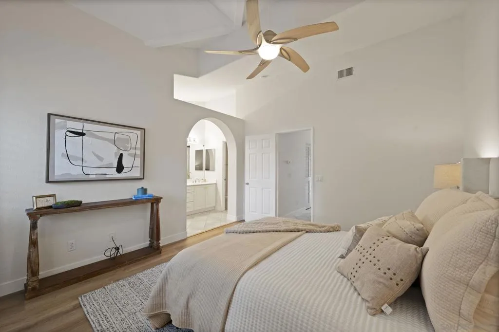 Highly desirable and centrally located in the heart of 92130—one of San Diego’s most sought-after zip codes, known for its top-rated schools! This bright and airy home in Crest at Del Mar features vaulted ceilings in the living room, two primary suites with en-suite bathrooms, and a convenient half bath on the main level. Enjoy a charming balcony off the breakfast nook and an open-concept space that seamlessly combines dining and a flexible workspace. The attached two-car garage offers oversized additional storage space. Recent upgrades include fresh interior paint and new luxury vinyl plank (LVP) flooring. The chef’s kitchen is beautifully appointed with quartz waterfall countertops, white shaker cabinetry, stainless steel appliances, and a designer tile backsplash. Residents enjoy resort-style amenities, including a swimming pool, spa, and fitness center. The low HOA fee covers water and trash. Ideally located near premier dining, shopping, and entertainment at Del Mar Highlands Town Center, One Paseo, and San Diego’s world-famous beaches.