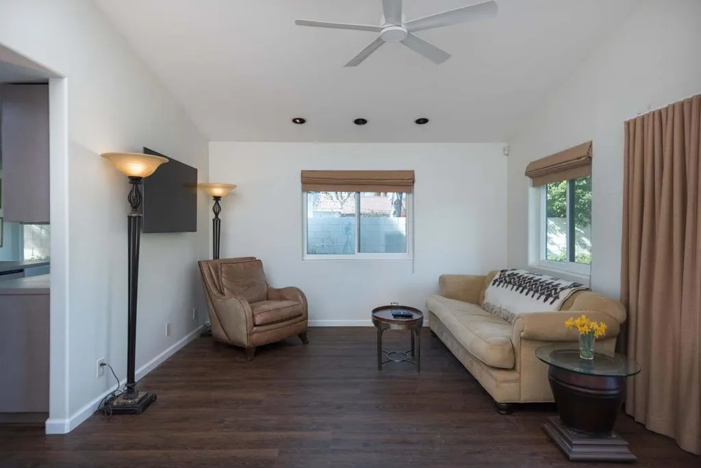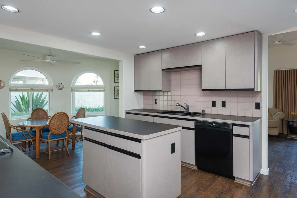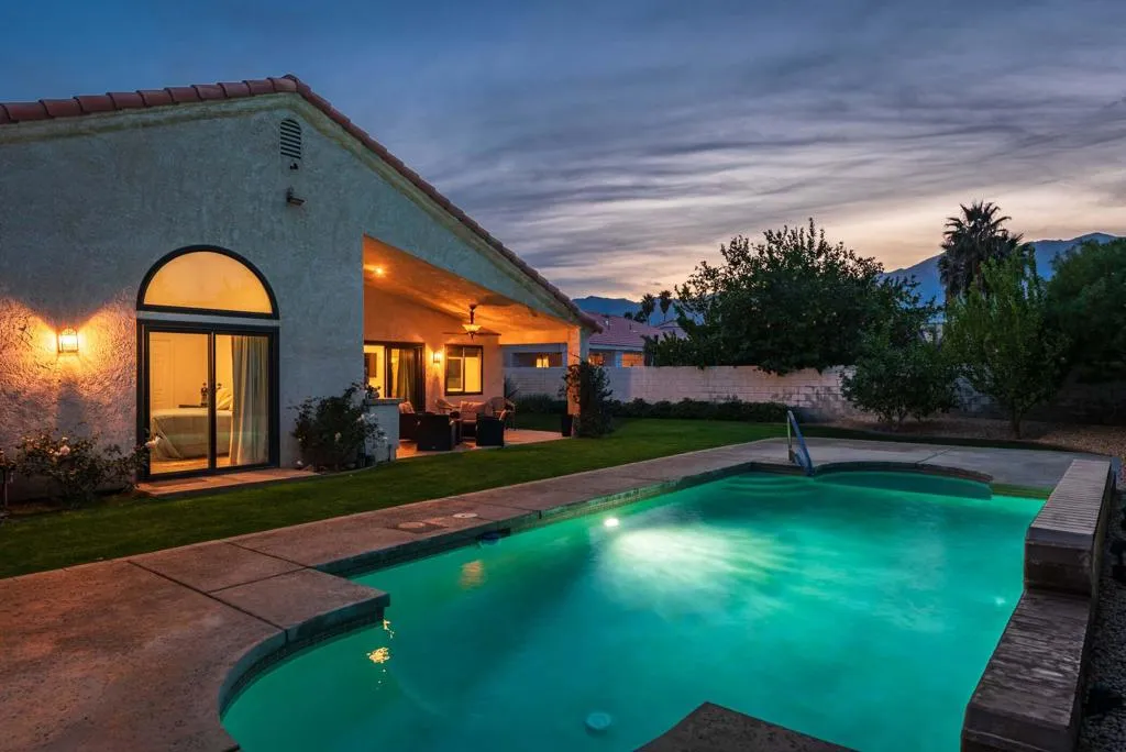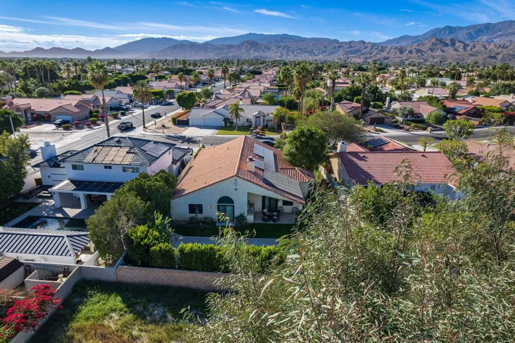 Classic desert glamour meets spacious, light filled living on fee land (that you own). Double doors open to a vaulted ceiling living room with a gas fireplace, flowing into the kitchen with a charming breakfast nook featuring curved windows that create an easy indoor-outdoor feel, and a family room with a second fireplace and direct backyard access. The primary suite is a serene retreat with vaulted ceilings, dual walk-in closets, newer sliders to the backyard and pool, and an updated en suite bath with a newer vanity and walk in shower. Outdoors, enjoy mountain views, an oversized private saline pool, and a covered patio with built in BBQ designed for relaxed desert entertaining. Notable features include OWNED SOLAR with 32 panels, newer energy efficient windows, newer flooring, dual AC zones, and a three car garage.