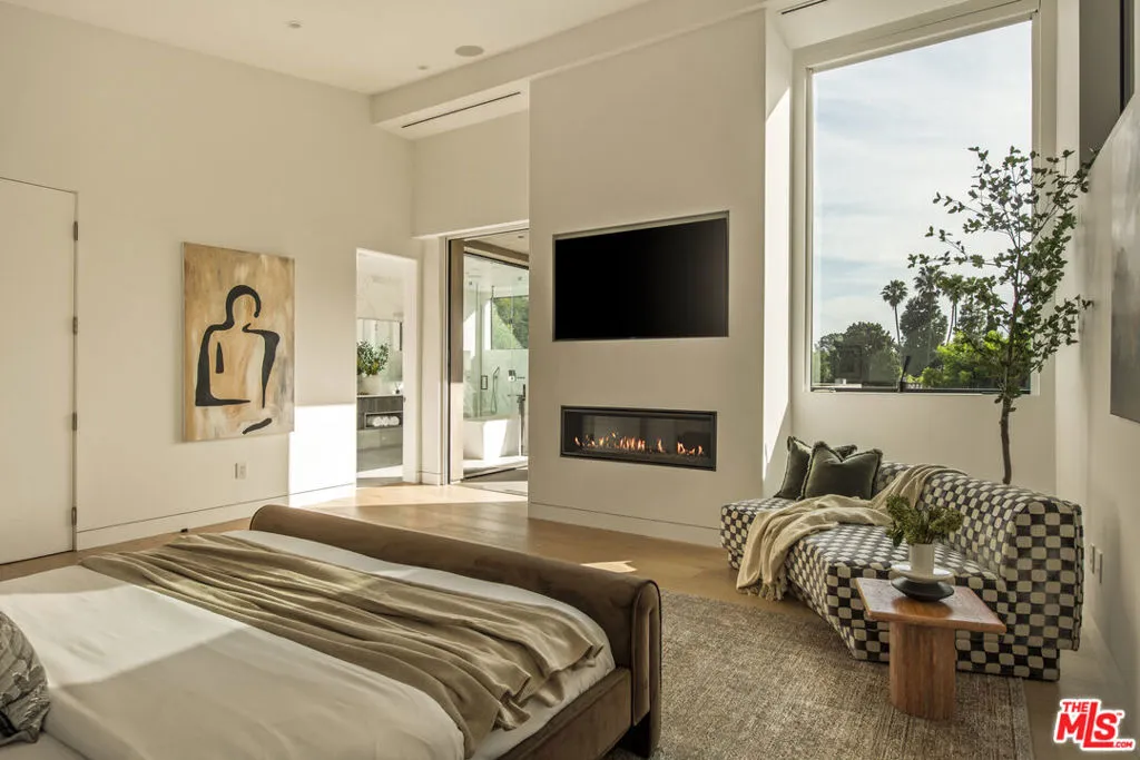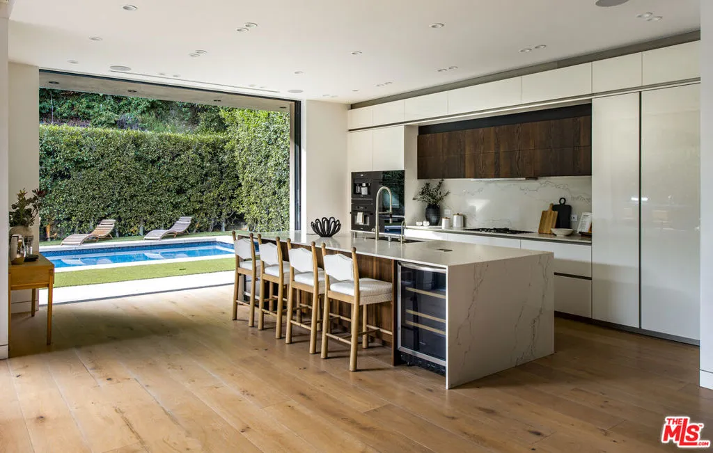 Perfectly positioned behind towering privacy hedges in Beverly Hills, this modern oasis sets a new standard of contemporary living, blending elevated design with the quintessential California lifestyle. A luminous open floor plan is framed by soaring ceilings and expansive gallery-style windows. Retractable Fleetwood walls-of-glass dissolve the boundary between inside and out. Wide-plank oak floors, a sleek fireplace, open dining area, and stylish powder room anchor the main living spaces. The European-inspired chef's kitchen is appointed with waterfall countertops, Miele appliances, wine storage, and refined custom finishes. The primary suite is scenic, with a spa-like bathroom and private balcony. Three additional ensuite bedrooms, along with multiple bonus/flex rooms are ideal for an office, den, gym, or maid's quarters. Designed for elevated entertaining, the lower level hosts a lounge with two bars, powder room, and a state-of-the-art screening room. Outdoors, an expansive patio overlooks a secluded, resort-style backyard complete with a sparkling pool and spa, outdoor kitchen, and fire pit. Crowning the residence is a stylish rooftop deck with fire pit, offering city and canyon views. Additional highlights include automated smart-home technology, surround sound, elevator, gated entry with circular driveway, and a two-car garage. Just minutes from the heart of Beverly Hills, this exceptional Modern estate presents a rare opportunity to own a feature-rich, design-forward home.
