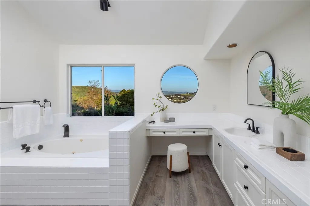 First time on the market set within the prestigious 24hr. Guard-Gated Community of Highland Light Estates. This spectacular upgraded residence is perched on a Premium oversized flat lot with breathtaking canyon vista's, city lights and peek-a-boo ocean views. Offering 4 bedrooms and 3 full sized bathrooms - including a main-level bedroom offering flexibility for guests or office use. Upon entry you will be in awe of the soaring ceilings, floor to ceiling windows and brand new premium wood style vinyl flooring throughout. The grand picture windows bring light and views through the formal living and dining spaces creating a Wow factor as you entertain next to the grand fireplace. The chefs kitchen has Quartz countertops, double ovens, 5 burner island cooktop stove, walk-in pantry and plenty of counter space and storage with the wrap around cabinetry - perfect for entertaining with the adjacent wet bar. The light filled family room has a beautiful fireplace and sliding doors to the incredible .26 acre backyard with multiple lounge and entertaining areas for sunset gatherings of any size or a quiet space to unwind and take in the ocean breezes. The full sports court is complete with a Basketball hoop and half court, next to a putting green with turf grass for a low maintenance environment. Leading up the circular staircase you will find the enormous primary suite with high beamed ceilings, a step-up retreat with a cozy fireplace and an oversized balcony with ocean and Canyon Vistas. The en-suite bath has dual walk-in closets with custom built-in organizers, dual sinks, vanity area, jetted tub and a separate walk-in shower. Across the hall you will find 2 large secondary bedrooms with high ceilings, peek-a-boo ocean views and an adjoining full sized bathroom.