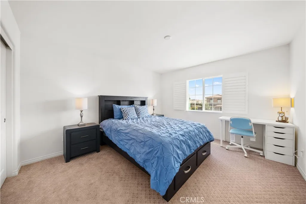 The interior features tile flooring on the first level and premium carpet upstairs, upgraded windows with elegant wood shutters, and a kitchen finished with quartz countertops. Professionally designed front and backyard landscaping create inviting and functional outdoor spaces.
