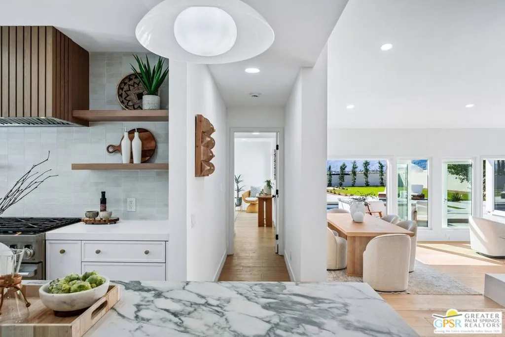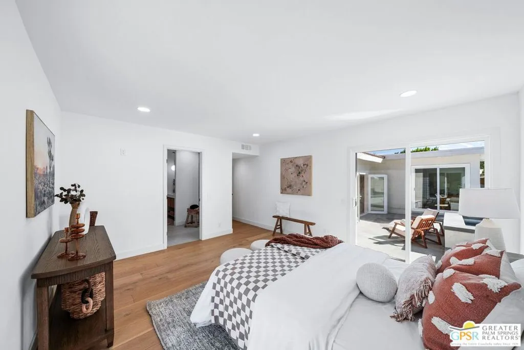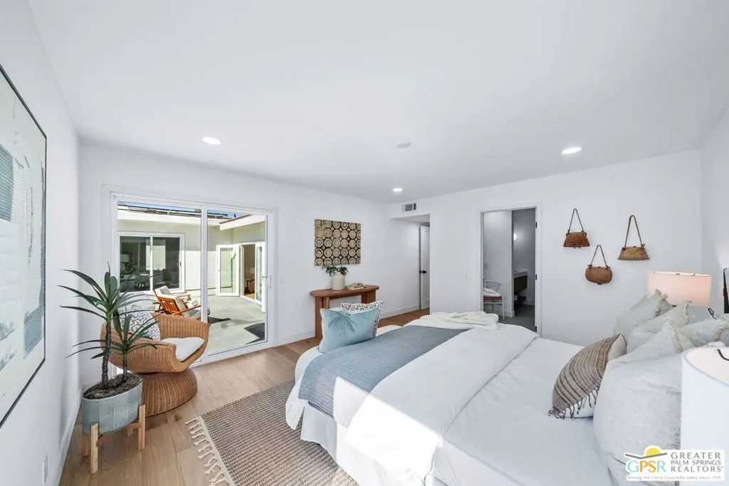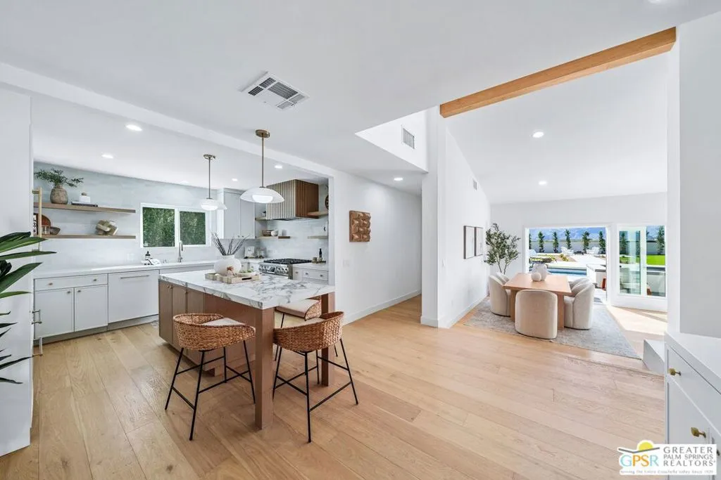 Set against a panoramic backdrop of Mount San Jacinto, this beautifully reimagined Palm Springs luxury retreat delivers the desert's most sought-after combination: a true private resort setting, dramatic sit-down views, and a rare double-lot opportunity approximately .45 acre of outdoor living, entertaining, and future potential. Renovated from top to bottom with a refined, design-forward palette, the home features engineered white oak flooring and a showpiece great room with soaring vaulted ceilings and white-oak wrapped beams, anchored by a striking fireplace. Oversized picture windows and French doors create an effortless connection to the outdoors, with pool, spa, and mountain views enjoyed right from the living room the quintessential "view-side" experience. At the heart of the home, the chef's kitchen impresses with custom cabinetry, built-in Signature appliances, and an expansive island designed for gathering. A separate dining area and wine bar complete the entertaining flow, all finished with clean lines, warm wood accents, and elevated hardware/lighting. Designed for comfort and privacy, the residence offers three luxe suites plus a fourth bathroom, each finished with spa-level style and designer tile from Bedrosians Tile & Stone. One suite features a true resort-inspired bath with a dedicated shower-and-soaking-tub room, while the remaining baths showcase beautiful walk-in showers crisp, modern, and impeccably detailed. Two suites open directly to the pool deck for seamless indoor-outdoor living; the third suite opens to its own private patio with easy access to the resort yard. Step outside to your own desert oasis: a sparkling heated pool and spa (fully renovated with Pebble Tec finish and new equipment), a bocce ball court, and expansive grounds framed by fresh hardscape and landscape improvements ideal for sun, stars, and unforgettable gatherings. Additional upgrades include multi-zone air conditioning, a custom courtyard entry, custom garage door, EV charging in the garage, and owned solar paid in full (not leased) for modern efficiency. Rare double-lot offering: Two residential lots sold as one offering exceptional flexibility for a future second residence or potential lot split. And for year-round livability, the home's orientation captures the magic of desert light winter sun and bright interiors while keeping the summer months comfortable.