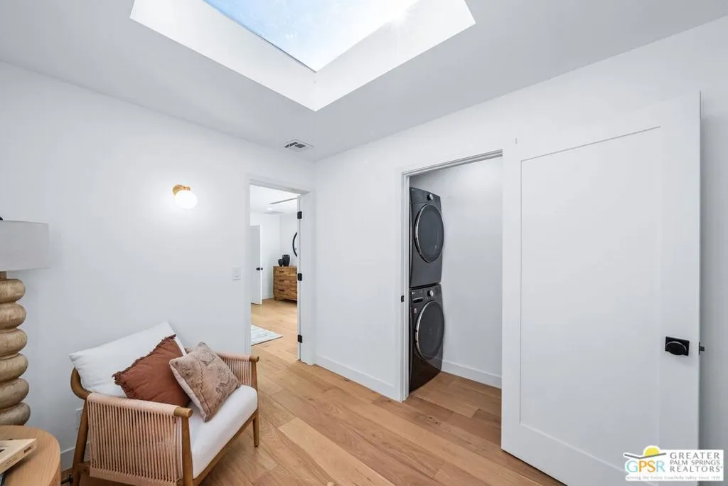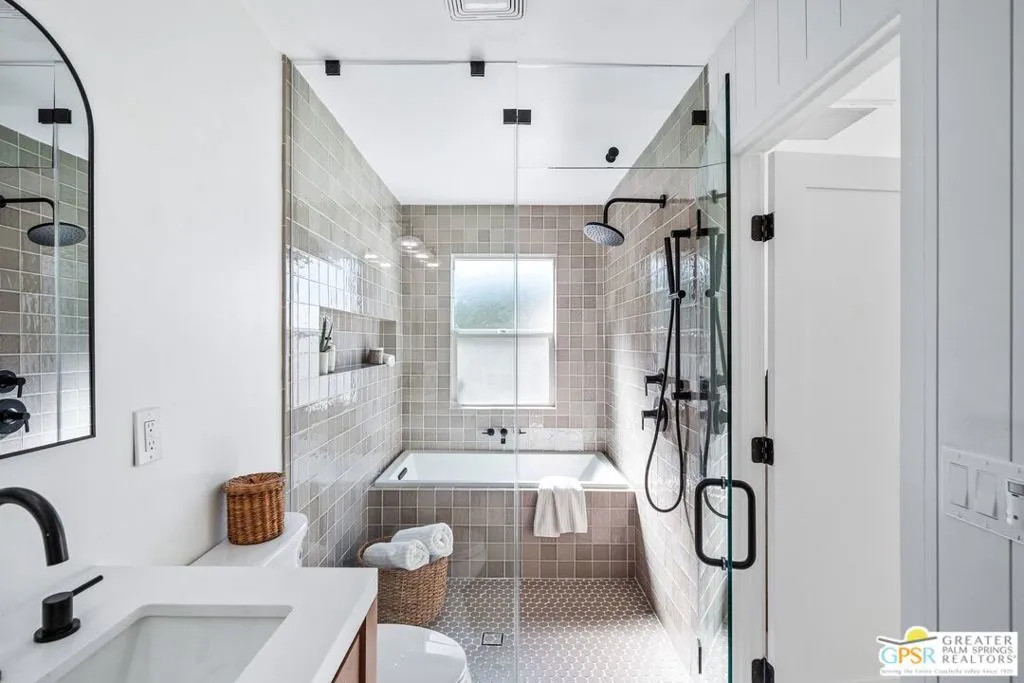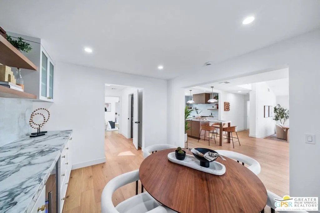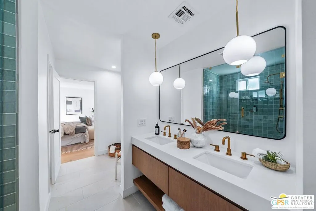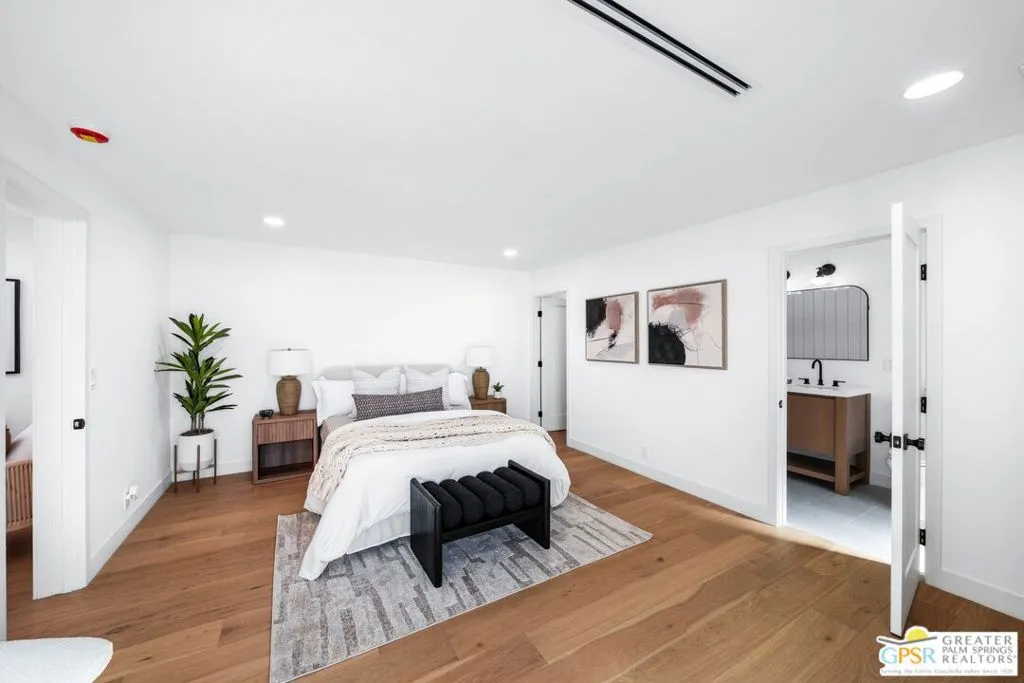 Set against a panoramic backdrop of Mount San Jacinto, this beautifully reimagined Palm Springs luxury retreat delivers the desert's most sought-after combination: a true private resort setting, dramatic sit-down views, and a rare double-lot opportunity approximately .45 acre of outdoor living, entertaining, and future potential. Renovated from top to bottom with a refined, design-forward palette, the home features engineered white oak flooring and a showpiece great room with soaring vaulted ceilings and white-oak wrapped beams, anchored by a striking fireplace. Oversized picture windows and French doors create an effortless connection to the outdoors, with pool, spa, and mountain views enjoyed right from the living room the quintessential "view-side" experience. At the heart of the home, the chef's kitchen impresses with custom cabinetry, built-in Signature appliances, and an expansive island designed for gathering. A separate dining area and wine bar complete the entertaining flow, all finished with clean lines, warm wood accents, and elevated hardware/lighting. Designed for comfort and privacy, the residence offers three luxe suites plus a fourth bathroom, each finished with spa-level style and designer tile from Bedrosians Tile & Stone. One suite features a true resort-inspired bath with a dedicated shower-and-soaking-tub room, while the remaining baths showcase beautiful walk-in showers crisp, modern, and impeccably detailed. Two suites open directly to the pool deck for seamless indoor-outdoor living; the third suite opens to its own private patio with easy access to the resort yard. Step outside to your own desert oasis: a sparkling heated pool and spa (fully renovated with Pebble Tec finish and new equipment), a bocce ball court, and expansive grounds framed by fresh hardscape and landscape improvements ideal for sun, stars, and unforgettable gatherings. Additional upgrades include multi-zone air conditioning, a custom courtyard entry, custom garage door, EV charging in the garage, and owned solar paid in full (not leased) for modern efficiency. Rare double-lot offering: Two residential lots sold as one offering exceptional flexibility for a future second residence or potential lot split. And for year-round livability, the home's orientation captures the magic of desert light winter sun and bright interiors while keeping the summer months comfortable.