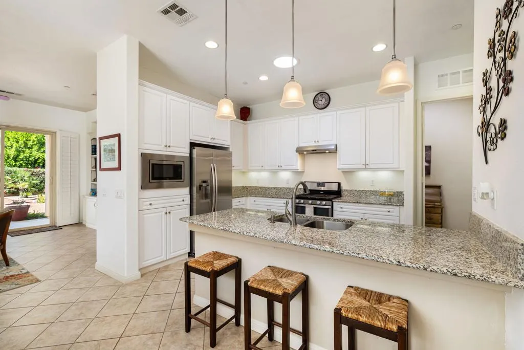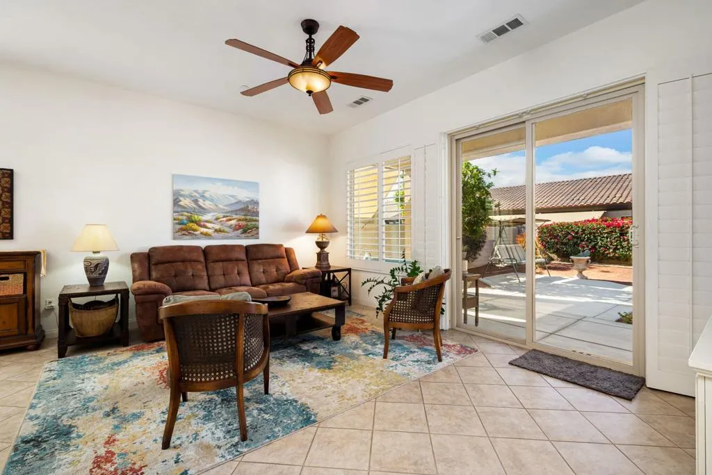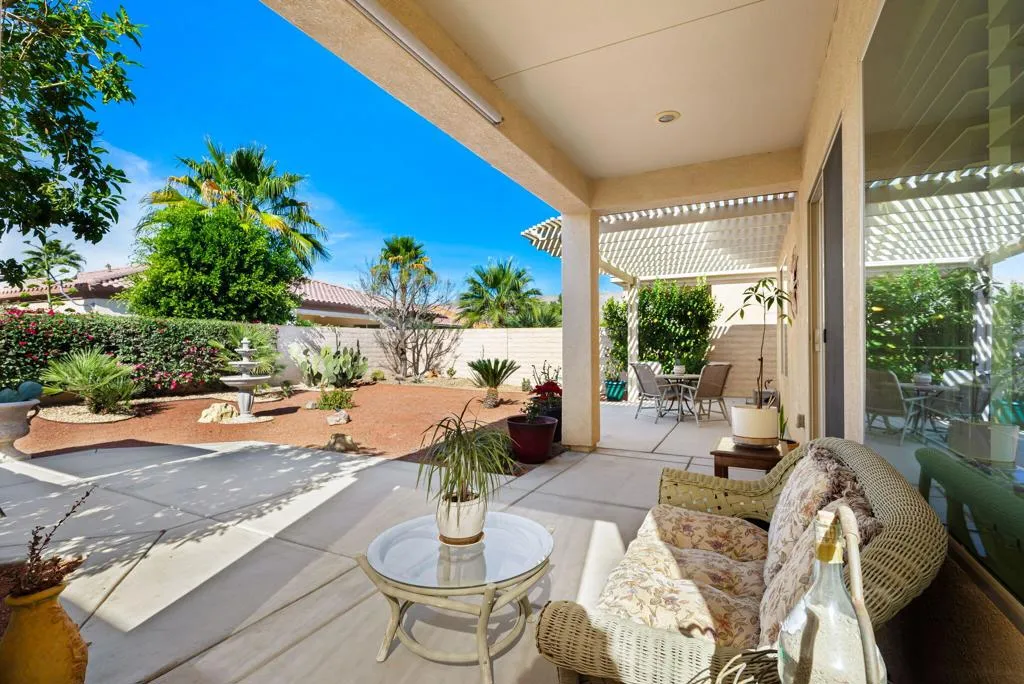 Welcome to easy, elevated living in the guard-gated 55+ resort community of Sun City Shadow Hills. This beautifully maintained Embark floor plan offers 2 bedrooms, 2 bathrooms, and a thoughtfully designed layout that blends comfort, style, and effortless indoor-outdoor living. Offered FURNISHED with only a few exclusions, this home is MOVE-IN READY and shows beautifully. Step inside to discover tile flooring set on the diagonal throughout the main living areas, creating an open and inviting flow. The spacious great room is filled with natural light from a picture window and a sliding glass door that seamlessly connects to the backyard retreat. A built-in media center adds functionality, while the adjacent dining area provides the perfect setting for intimate dinners or casual gatherings with friends. The kitchen is designed for both everyday living and entertaining, featuring granite slab countertops, stainless steel appliances, and a generous breakfast bar with stainless steel sink and three stylish pendant lights overhead. A built-in desk with upper cabinetry near the entry offers a convenient workspace for hobbies, planning tee times, or staying connected. Three SOLAR TUBES enhance the home with additional natural light in the kitchen, laundry room, and primary bedroom closet creating a bright and airy atmosphere throughout. The private primary suite overlooks the tranquil backyard through a picture window and includes an en-suite bath with dual sinks and a glass-enclosed shower with built-in seat. The guest bedroom is thoughtfully separated for privacy, with an adjacent bath featuring a shower/tub combination. Additional highlights include a laundry room conveniently located off the kitchen and an EXTENDED TWO-CAR GARAGE providing ample storage. Step outside to your own peaceful desert sanctuary. The expansive, low-maintenance backyard features an EXTENDED CONCRETE PATIO and a large covered seating area ideal for morning coffee or sunset gatherings. A three-tier concrete fountain serves as the focal point, surrounded by palm trees, a cactus garden, a mature shade tree, and blooming bougainvillea along the perimeter wall creating both beauty and privacy. Enjoy championship golf, clubhouses, pools, fitness centers, and an active lifestyle just minutes from Palm Springs, dining, and shopping.