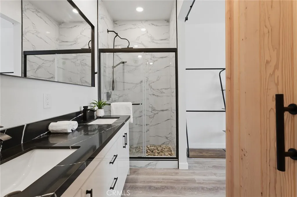 Meticulous and highly upgraded mid-century modern Charles Du Bois single level home with attached guest apartment with separate kitchen! The property sits elevated above the street on a sprawling 11k lot boasting almost 100 feet of frontage adorned with manicured front lawns and lush landscaping. An ascending stone pathway leads to the covered front porch cladded with original stone exterior. Step through double doors into the entry foyer that opens to expansive living & dining rooms each with tongue & groove wood beamed vaulted ceilings, original stone fireplaces, and glass sliders that open to the backyard for the perfect indoor/outdoor flow. The oversized remodeled kitchen boasts large island with breakfast bar seating, quartz counters with soft close custom cabinetry, wine fridge, and a suite of Forno gourmet stainless appliances including a 60” fridge/freezer and built-in range with double ovens and 8-burner stove with pot filler. The spacious primary suite features high vaulted ceiling, glass slider that opens to the yard, large walk-in closet, separate makeup vanity, and en-suite upgraded bathroom with dual sinks, spa tub, and separate walk-in shower. One bedroom wing has the primary suite and two additional secondary bedrooms each with high vaulted ceilings and they share a spacious remodeled bathroom with new vanity with stone counter, dual sinks, and walk-in shower. There is a separate wing/guest apartment of the home which has both interior and exterior access making it the ideal flex space for extended family, home office/studio space, or great rental income featuring two additional bedrooms, full kitchen with stainless appliances, full bathroom with dual sinks and walk-in shower, and fenced private yard with patio, grass lawn, and storage shed. The home also has a spacious laundry room with built-in storage. The entertainer’s backyard has a sweeping covered patio perfect for outdoor dining and lounging, lush grass lawn with mature trees, and large side yard with additional storage shed. Adjacent to dining/shopping at the Westfield Mall/Village, Calabasas Commons, local parks/hiking, & zoned for award-winning El Camino & Hale charter schools.