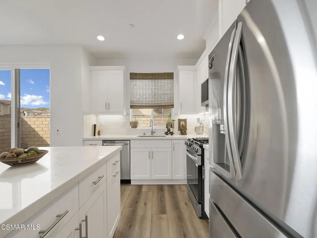 WELCOME TO SOL VISTA, a highly desirable enclave within the Anacapa Canyon community, offering the perfect combination of MODERN AMENITIES and RESORT STYLE LIVING. This BEAUTIFULLY upgraded 3-bedroom, 3-bathroom home features an OPEN-CONCEPT LAYOUT enhanced by soaring two-story ceilings and numerous tall windows that flood the interior with natural light while capturing serene MOUNTAIN VIEWS. Thoughtfully designed with WIDE-PLANK WHITE OAK INSPIRED FLOORING, recessed lighting, CUSTOM blinds, decorative lighting and expansive dual-pane windows, are just some of the things that make this home truly STAND OUT. The GORGEOUS KITCHEN showcases quartz countertops with a custom backsplash, abundant white shaker cabinetry with decorative hardware, a spacious CENTER ISLAND with a sit-up breakfast bar, and stainless steel LG appliances, all seamlessly opening to the EXPANSIVE family room and dining area, perfect for entertaining or casual living. The PRIMARY SUITE serves as a PEACEFUL RETREAT, featuring a large walk-in closet and an en-suite bath with dual-sink vanity, custom tile, an enlarged glass-enclosed shower with built-in bench, and a private commode. The sizable secondary bedrooms include ceiling fans and share a well-appointed hall bathroom. A conveniently located UPSTAIRS LAUNDRY ROOM with storage adds everyday functionality. Additional HIGHLIGHTS include a two-car, direct-access garage with finished flooring, large sliding doors leading to the spacious fully fenced backyard waiting for your personal touches and tasteful decorative finishes throughout. Residents of Sol Vista ENJOY RESORT-STYLE AMENITIES including swimming pools, spas, a kiddie pool, clubhouse, 24-hour fitness center, yoga studio, BBQ areas, fire pits, cabanas, basketball courts, playground, parks, plus much more. ENJOY a lifestyle where every day feels like a VACATION. Don't miss this incredible OPPORTUNITY to make this SPECIAL home your OWN!!!