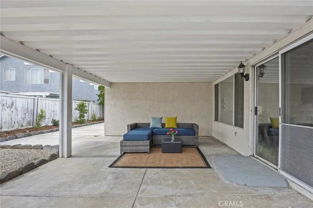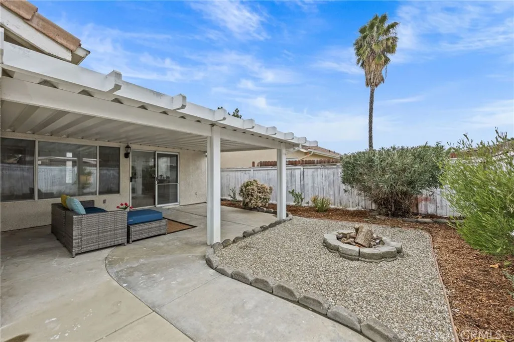 Enjoy outdoor living on the covered patio overlooking a serene backyard with refreshed landscaping and mature fruit trees, perfect for relaxing or hosting friends and family.