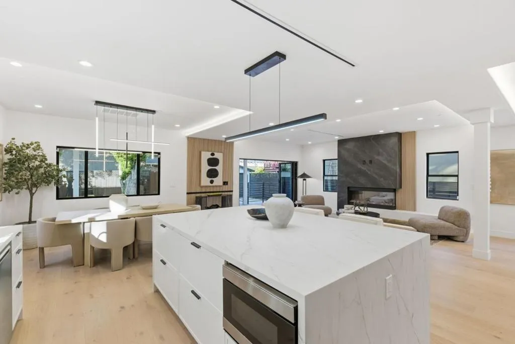 Fully renovated, this modern Burlingame home blends clean architectural lines with warm natural materials and thoughtful functionality. A floating staircase, white oak flooring, and custom linear lighting set the tone for open-concept living spaces that flow effortlessly to the outdoors. The chefs kitchen features porcelain slab surfaces, a waterfall island, dedicated pantry, and a full suite of Miele appliances. Sliding glass doors connect the living area to a private rear deck and landscaped yard, ideal for indoor/outdoor living. The main level includes a guest ensuite bedroom and stylish powder room. Upstairs, a flexible loft space is perfect for an office or lounge. The primary suite offers a private balcony, custom walk-in closet, freestanding soaking tub, oversized shower, and dual vanities with heated and lighted mirrors. Two additional ensuite bedrooms and an upstairs laundry room complete the upper level. Additional features include central heating and cooling, tankless water heater, energy-efficient upgrades, and a detached two-car garage. Located on a tree-lined street close to parks, schools, shops, and dining, this is modern Burlingame living at its finest.