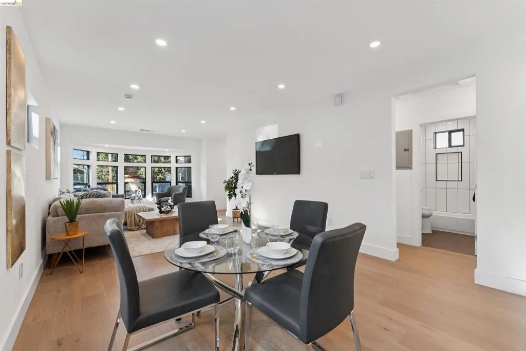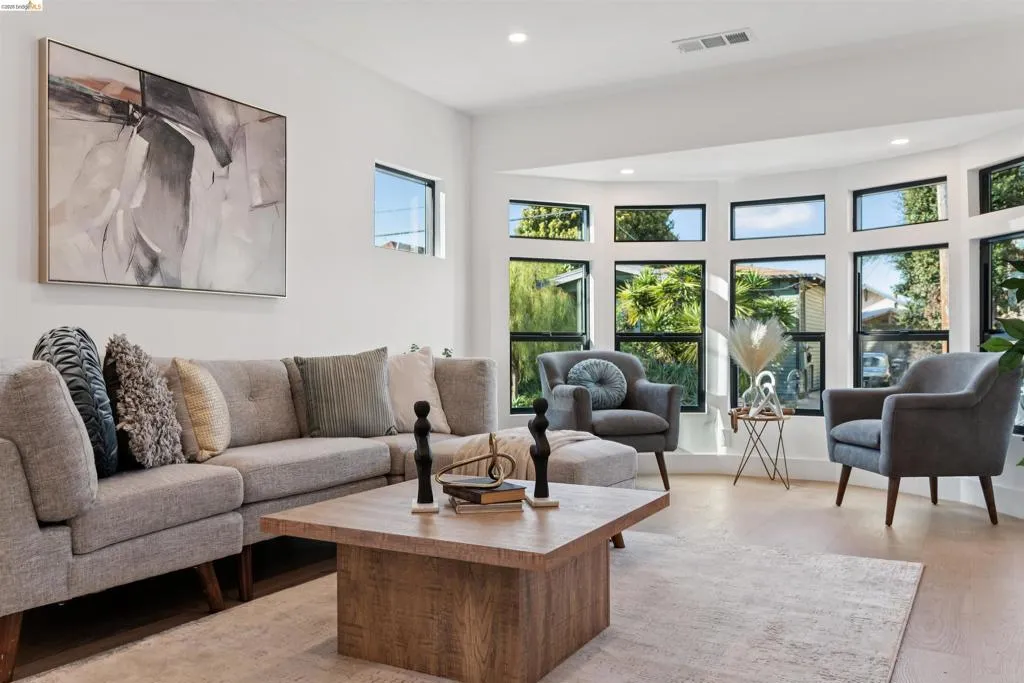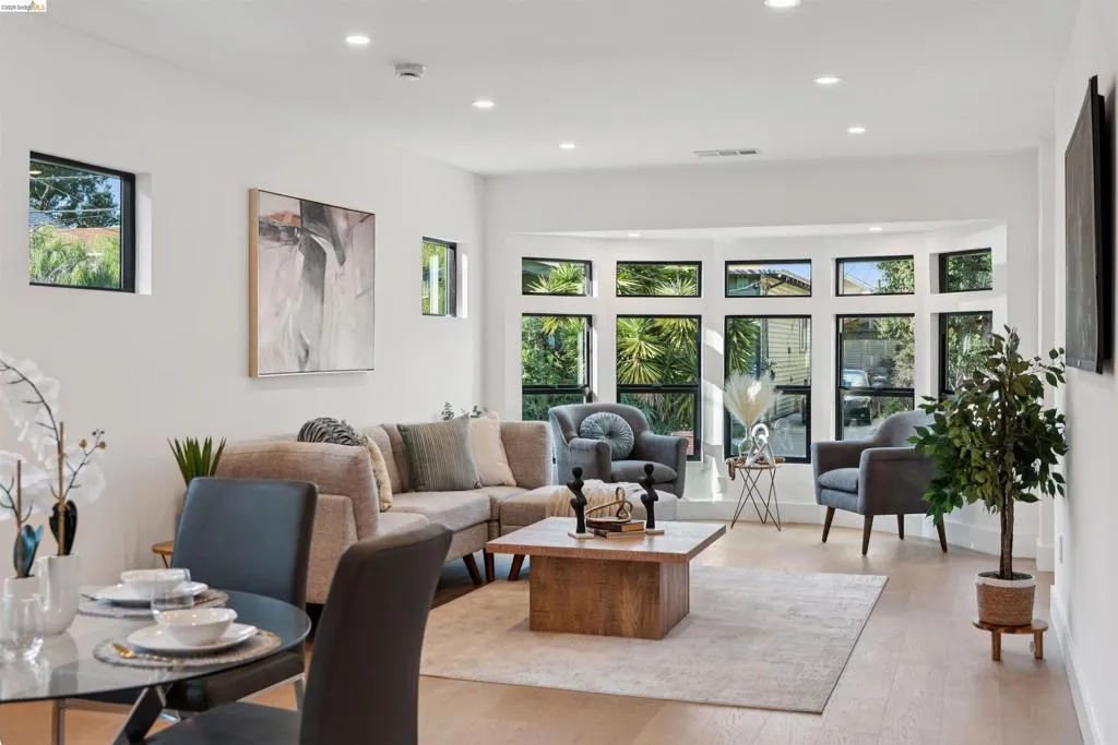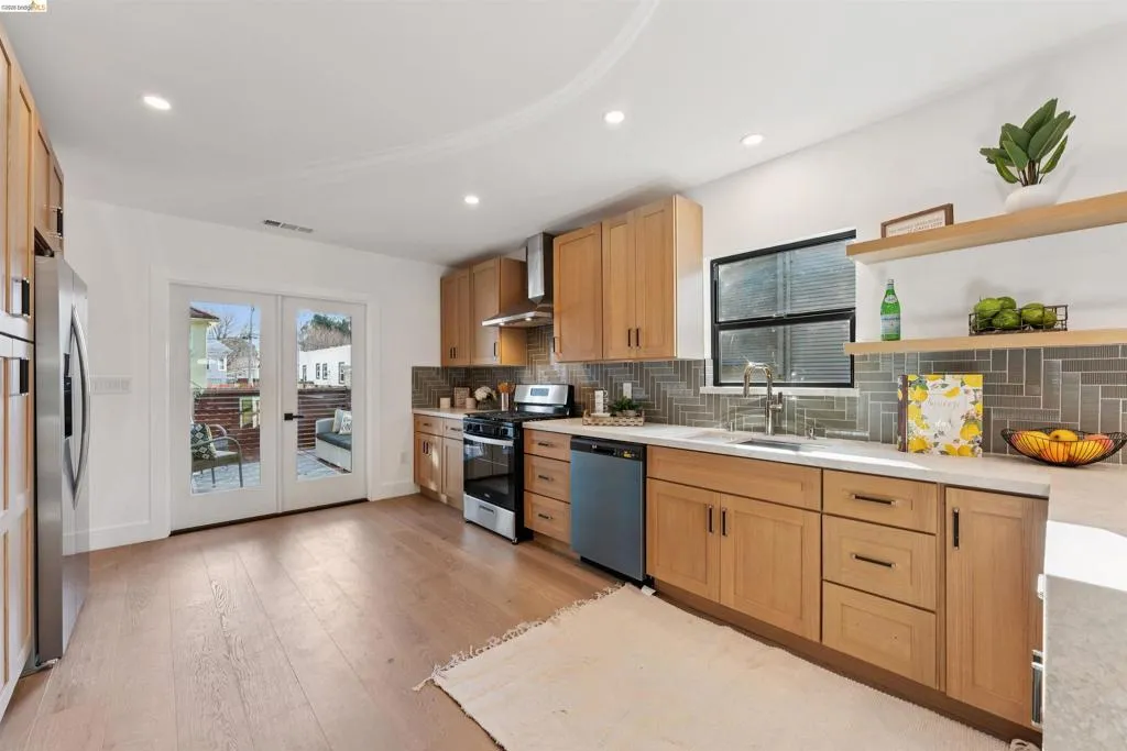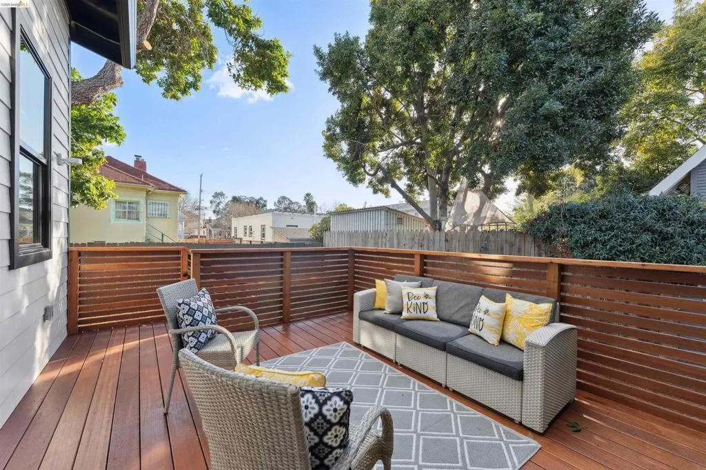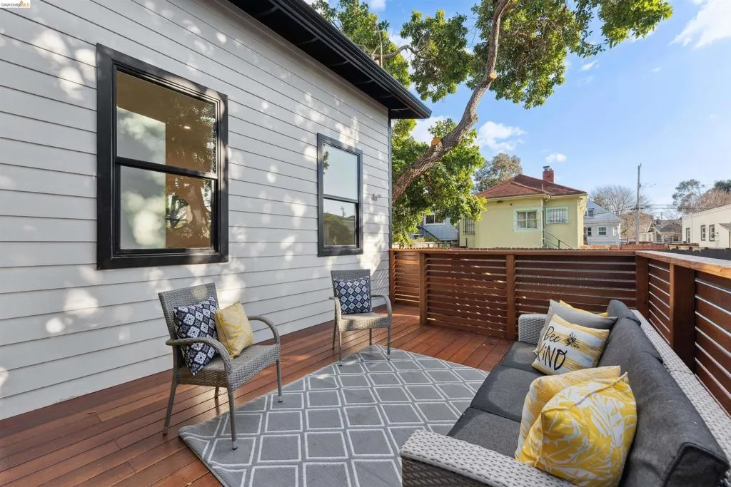 Welcome to this thoughtfully renovated three bedroom three bath residence in the heart of Oakland, where timeless architecture meets modern, effortless living. The home honors its historic roots while introducing a bright, open single level plan designed for today’s lifestyle. The front elevation is defined by a measured rhythm of Edwardian glazing, bringing depth, light, and a refined historic cadence to the street. Natural light fills the interiors, anchored by a generous great room that flows seamlessly into a modern kitchen with refined finishes, well suited for both everyday living and entertaining. Rich hardwood floors, carefully selected fixtures, and quality craftsmanship create a sense of balance, warmth, and quiet elegance throughout. The three bedrooms are comfortably scaled, including two well appointed ensuite retreats. The primary suite features high ceilings that enhance volume and light, creating a calm and elevated sense of space. Each room offers privacy, flexibility, and long term comfort. Outdoors, a fully private and thoughtfully landscaped backyard extends the living experience. A hardwood deck anchors the space and provides an ideal setting for dining, gatherings, or quiet retreat, while layered greenery offers privacy and visual interest.