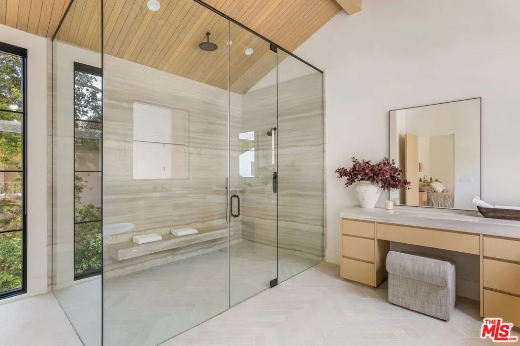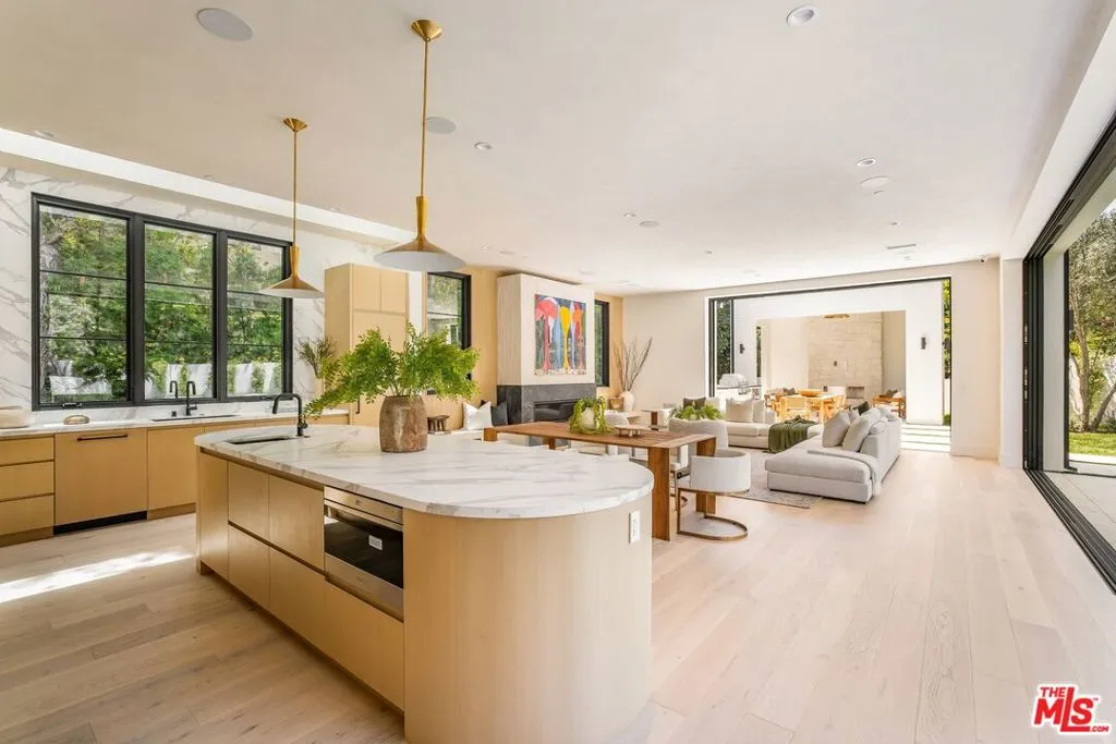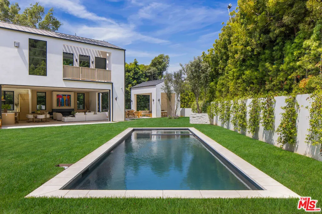 Nestled at the end of a quiet cul-de-sac on a tranquil lane just off the first block of lower Mandeville Canyon, this brand-new construction Modernist Farmhouse blends architectural sophistication with refined, organic design. Set on an expansive 18,000 square foot lot, this estate offers unparalleled privacy and sophistication in one of Brentwood's most coveted neighborhoods. Crafted with meticulous attention to detail, the home's handsome stone cladding and light wood accents seamlessly blend natural textures with contemporary design. A soaring two-story entry with exceptional volume welcomes you into a natural light-filled oasis, thoughtfully designed for both entertaining and everyday living. At the heart of the residence is an expansive great room with artisanal Roman clay ceiling, handsome Black Taj marble slab fireplace, and walls of pocketing Fleetwood glass doors leading to a resort-style backyard with elegant cabana and sparkling pool. Chef's kitchen with Calacatta Aella marble finishes, state-of-the-art Sub-Zero and Wolf appliances, and an open-concept layout that ensures a seamless flow between the great room and formal dining room. Primary suite aerie with vaulted ceiling and elegant spa-inspired bathroom. Three additional bedroom suites up, each with luxurious baths showcasing Misterio marble finishes. Sophisticated downstairs powder room with artful, minimalist raked stucco walls. Captain of Industry office. Spacious state-of-the-art screening room delivers a cinematic experience, while the Control4 smart home automation and built-in surround sound ensure effortless control of lighting, climate, security cameras, and entertainment. Expansive walls bathed in diffused natural light for a serious art collection. A singular, Brentwood estate blending glamorous indoor/outdoor living, comfort, and unparalleled amenities.