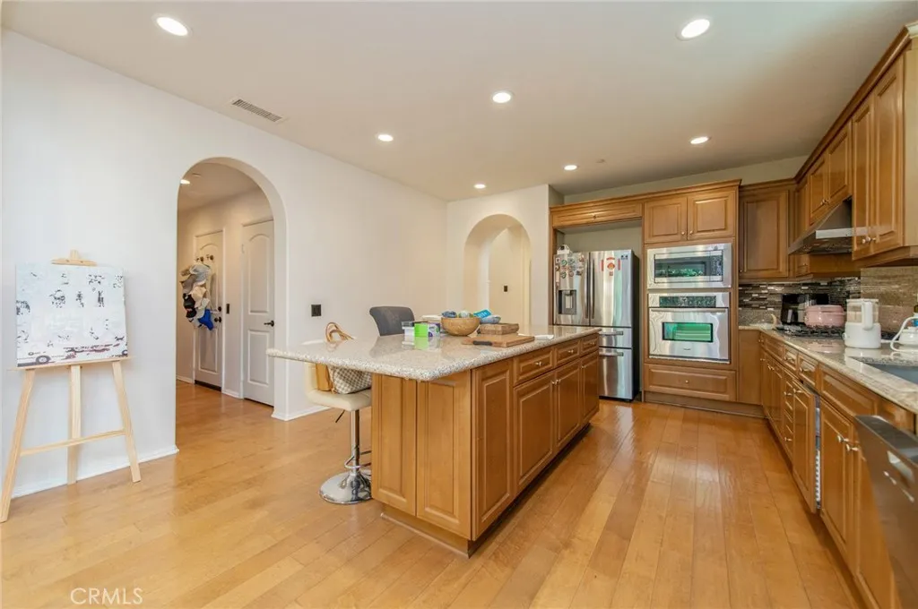 Welcome to 579 Boxwood Lane, a spacious and thoughtfully designed 5-bedroom residence located in the highly sought after Rosedale community of Azusa, offering scenic hillside views and resort style amenities. This well maintained home features an ideal layout with two bedrooms on the main level and three additional bedrooms upstairs, providing flexibility for multi generational living, guests, or a dedicated home office setup. Upon entry, warm wood flooring, recessed lighting, and elegant archways create a welcoming atmosphere. The open concept kitchen is designed for both daily living and entertaining, showcasing an oversized granite island with bar seating, extensive cabinetry, stainless steel appliances, gas cooktop with professional hood, built in microwave, and a spacious pantry. The kitchen flows seamlessly into the dining area, where sliding glass doors open to a private backyard. The backyard offers a covered patio structure, generous concrete hardscape, and a lawn area ideal for outdoor dining, relaxation, or gatherings. The elevated positioning allows for pleasant neighborhood and hillside views. Upstairs, a large loft provides additional living space and is perfectly suited as a media room, game room, or secondary family area. The primary suite serves as a true retreat, featuring dual vanities, a centrally positioned soaking tub, and a beautifully upgraded walk-in shower with marble inspired finishes and frameless glass enclosure. Select bathrooms include modern smart toilet upgrades for added comfort. Additional highlights include epoxy finished garage flooring, ample storage space, and a practical floor plan that balances openness with privacy. As part of the Rosedale master planned community, residents enjoy access to resort style pools, spa, clubhouse, fitness center, parks, and scenic walking trails, all conveniently located near Metro access, major freeways, and shopping.