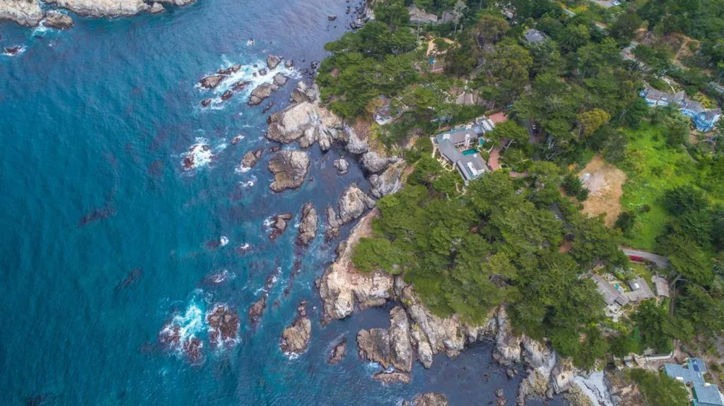 Situated in an ancient Cypress forest and perched on the granite coastal cliffs of the Central Coast, Seacliff is a once-in-a-lifetime aggregation of five contiguous lots on famed Spindrift Road in the Carmel Highlands. Stretching over ~5.35 acres with almost 1,000 feet of private oceanfront coastline, this completely unique compound offers a variety of rare and rugged ocean vistas and private outdoor living spaces. The grand Lodge is an 8 bedroom, 12,441 sq ft mansion, featuring an unforgettable library with gold-leaf domed ceiling. The two fully-appointed cottages both have stunning living rooms and bespoke kitchens, and two more guest cottages offer a unique and cozy one-bedroom, luxury cabin experience. The center courtyard of the Lodge features a waterfall pool and hot tub leading into the gym. Meandering paths weave through the breathtaking oceanside gardens, numerous meditation areas, and three coastal access stairways that bring you down to the Pacific's edge. 150,000 pounds of mossy boulders, large floating flagstone steps, and multiple seaward viewing posts, anchored by the cottages 6 enormous, rustic fireplaces, give the property its primary bohemian insignia and making Seacliff one of the most dramatic oceanfront properties in the world.