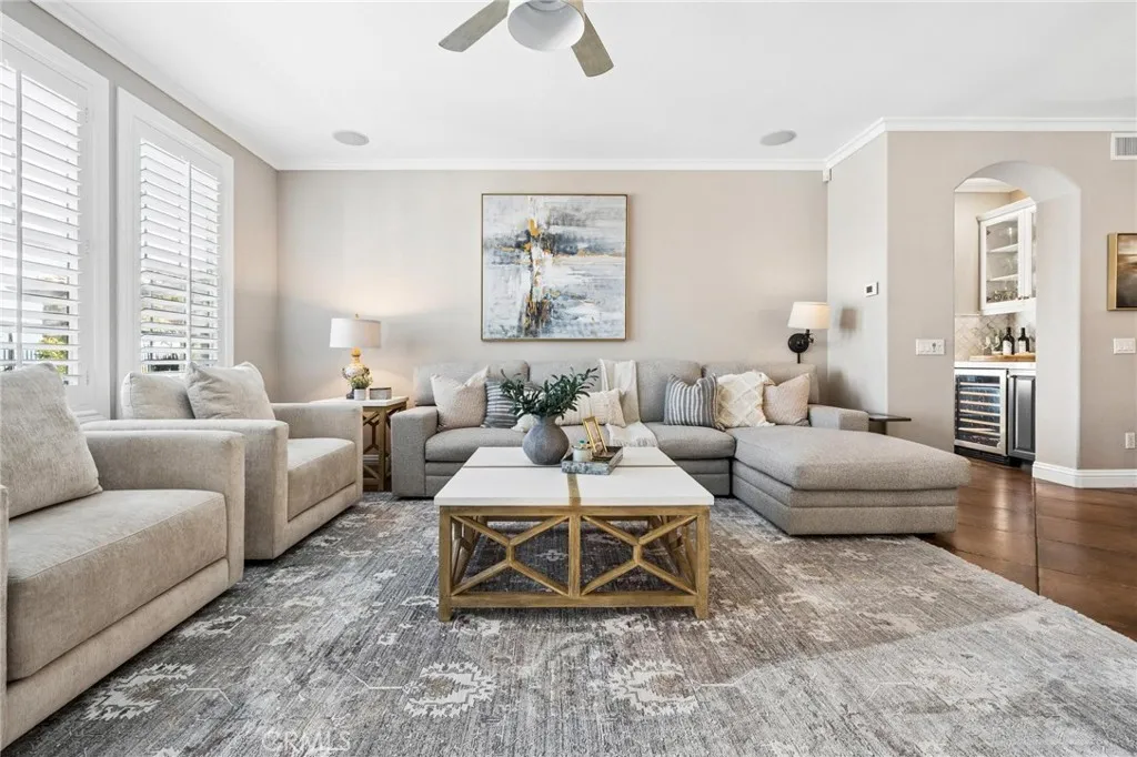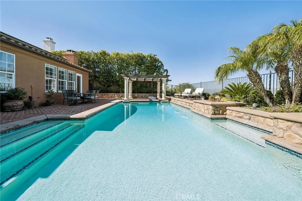 Get ready for a customized pool and view home at the top of Stevenson Ranch with a location like no other! Truly a one-of-a-kind property with upgrades and features both functional and jaw-droppingly gorgeous! It's one thing to enjoy the privacy and sunsets of a 180-degree panoramic view of Santa Clarita, it’s even better when it comes with a floorplan and custom improvements you rarely see. Even in neighborhoods as popular as "Torcello". As you approach the gated courtyard with fountain, you can sense you are in for something special...and you are! From the custom front door your eyes are drawn out the sliders to the pool and beyond. A striking first impression! To the right are 3 downstairs bedrooms, including the primary with its own views of the yard. For those desiring single story living (and rarely finding it) you never have to go up the stairs to the 2 additional bedrooms and huge loft. To the left is a spacious family room and kitchen which has been recently remodeled with quartz counters, beautiful island with a cascading waterfall edge, awesome backsplash, built-in appliances and a custom glass walled wine cellar. Another hint of all that has been put into this amazing property. Wood and tile floors throughout and the stone hardscape - front and back - is both practical and impressive. Outside is what you came for - pebble tech pool, separate covered spa, amazing stone gazebo with TV, heaters and fireplace. As the owner said, "I’ll never see something like this again." Sunken BBQ cook station too, all with complete privacy. The 3-car split garage is fully finished with epoxy and cabinets and the single car garage (WITH AC!) can be a gym or office as it has been both. All 5 bedrooms are good-sized with large closets, all with organizers and the loft is huge including a closet for storage. There are no Mello Roos taxes, you are close to Richard Rioux Park and amazing schools, but you will truly feel like you are in your own world in this incredible home. WOW!