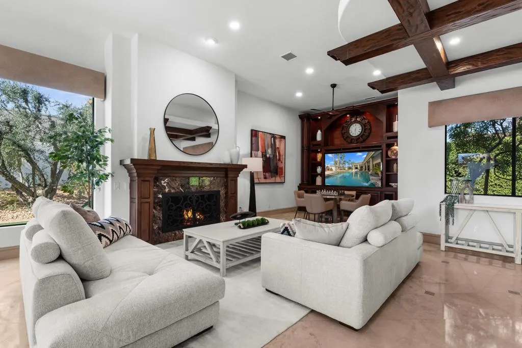 Seller financing available on agreeable terms! Newly refreshed, this contemporary mediterranean residence is gracefully situated on over half an acre within the exclusive gated custom home enclave of Lions Gate Estates in La Quinta. A recent outdoor transformation introduces a soft white exterior palette, desert contemporary landscaping, and artful exterior lighting, elevating the home's architectural presence while framing panoramic mountain views and creating a resort caliber setting from sun-filled afternoons to evenings under the stars. Interiors reflect scale and refinement, with custom built-ins throughout, a formal living and dining room, and an inviting great room featuring a fireplace and wet bar, perfect for hosting with ease. A temperature controlled wine cellar and chef's kitchen with granite slab countertops, premium appliances, and generous gathering space further underscore the home's entertaining appeal. Designed to balance architectural elegance with everyday livability, the home unfolds across four-bedroom suites and four-and-a-half baths, including a private detached casita ideal for guests. The primary suite is a private sanctuary, complete with its own fireplace, dual walk-in closets, a soaking tub, and an adjoining exercise room. At the heart of the property, a Pebble Tec saltwater pool and spa, enhanced by an outdoor misting system, anchor the grounds and sets the tone for relaxed desert living. Covered patios, an outdoor fireplace, built-in BBQ, automated awnings, and thoughtfully curated lighting complete the elevated outdoor atmosphere. Additional amenities include a sauna and an air-conditioned three-car garage. Offered furnished per inventory. This estate presents a rare opportunity to experience desert living at its finest.