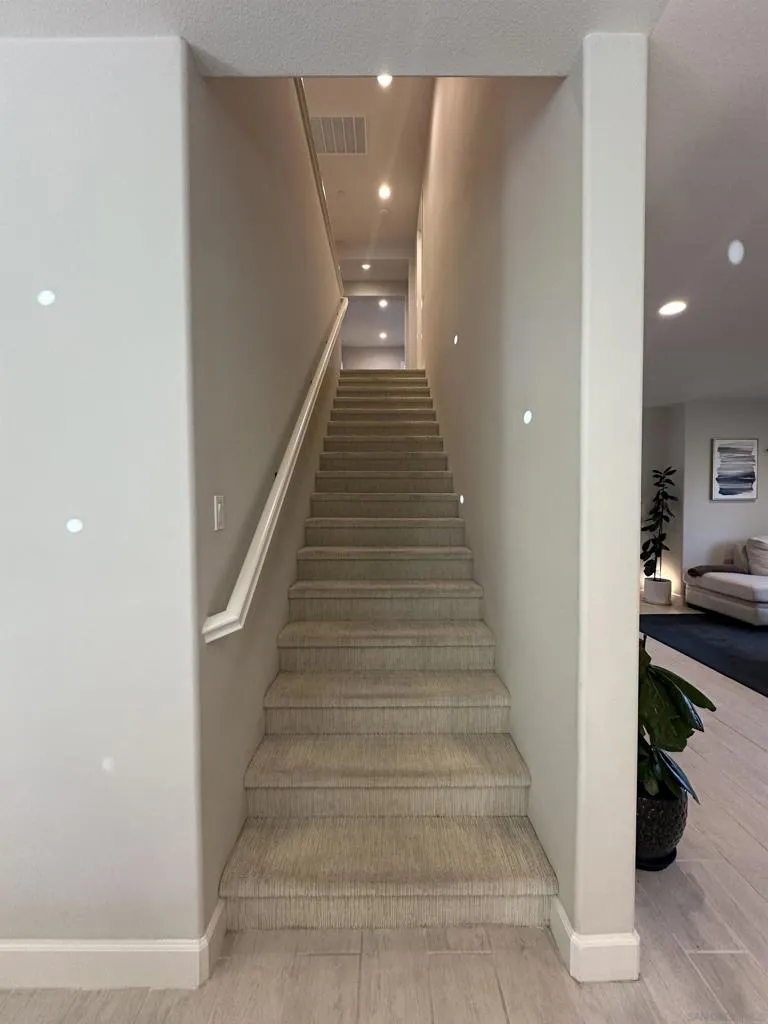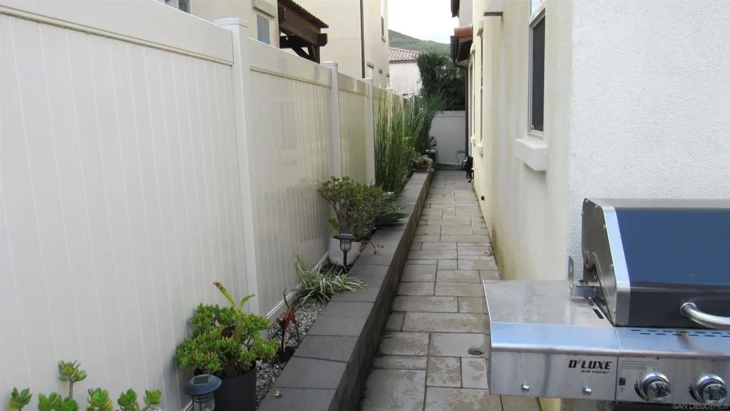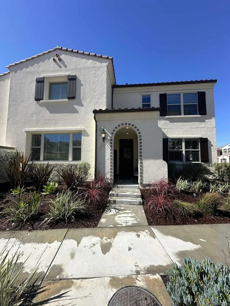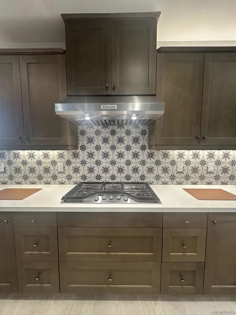 Introducing a rare, modern, upscale residence behind the gates of Vientos at Rancho Tesoro, blending elevated design, comfort, and lifestyle. This highly upgraded, open-concept home features premium finishes, custom paint, upgraded baseboards, and designer ceiling fans. The chef-inspired kitchen features KitchenAid stainless-steel appliances, Caesarstone countertops, a decorative tile backsplash, stained driftwood shaker cabinetry with a pull-out pantry, a 5-burner gas cooktop, a built-in oven/microwave, a commercial-style hood, and custom floating shelves. Porcelain tile flooring, double-padded Berber carpet, Hunter Douglas Hybrid shutters, Provenance woven shades, and insulated walls enhance privacy. Downstairs, a bedroom with a pocket door creates a private en suite with a custom tile shower and a mirrored wardrobe. Paid solar with a backup battery and an epoxy-finished 2-car garage with overhead storage. Enjoy community amenities such as a pool, playground, BBQ area, and a private outdoor lounge with an industrial ceiling fan, perfect for morning coffee, gardening, or relaxing in your jacuzzi. Nearby, highly rated schools, shops, restaurants, grocery stores, fitness studios, and cafés are easily accessible via SR-78 and I-15, connecting to Carlsbad, Encinitas, Escondido, and beyond. Over 50% of the community is open space with 18 miles of trails, making outdoor activities part of daily life.