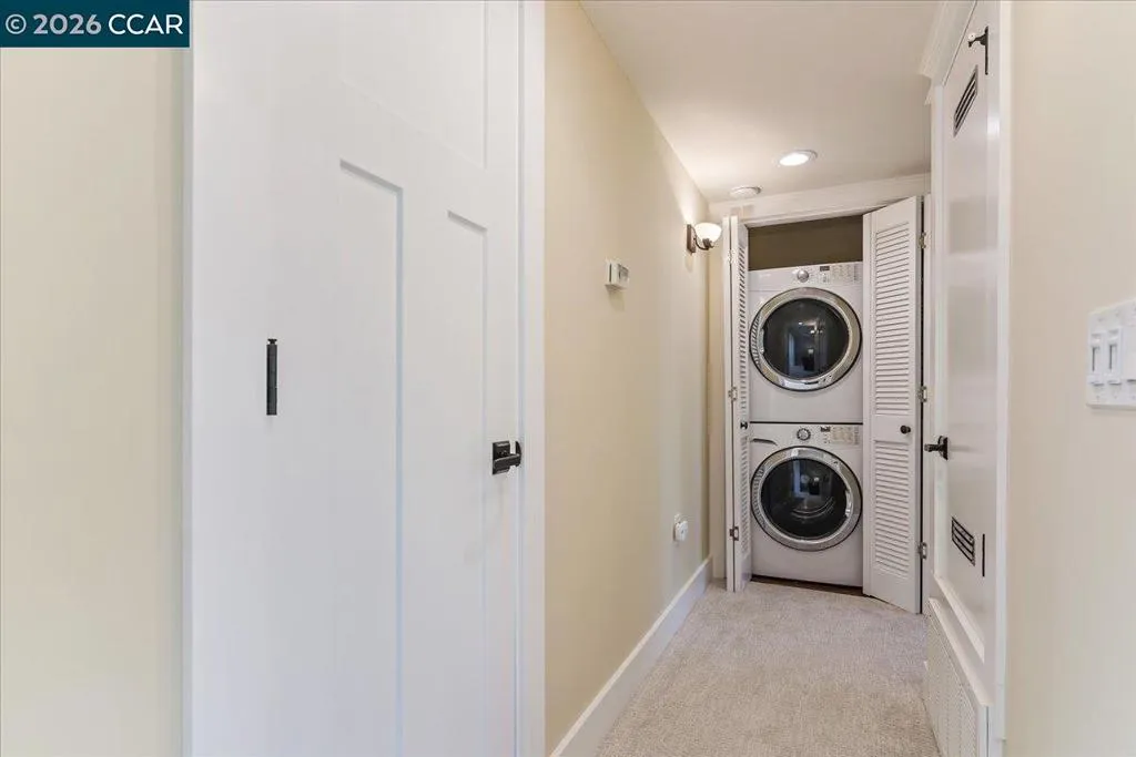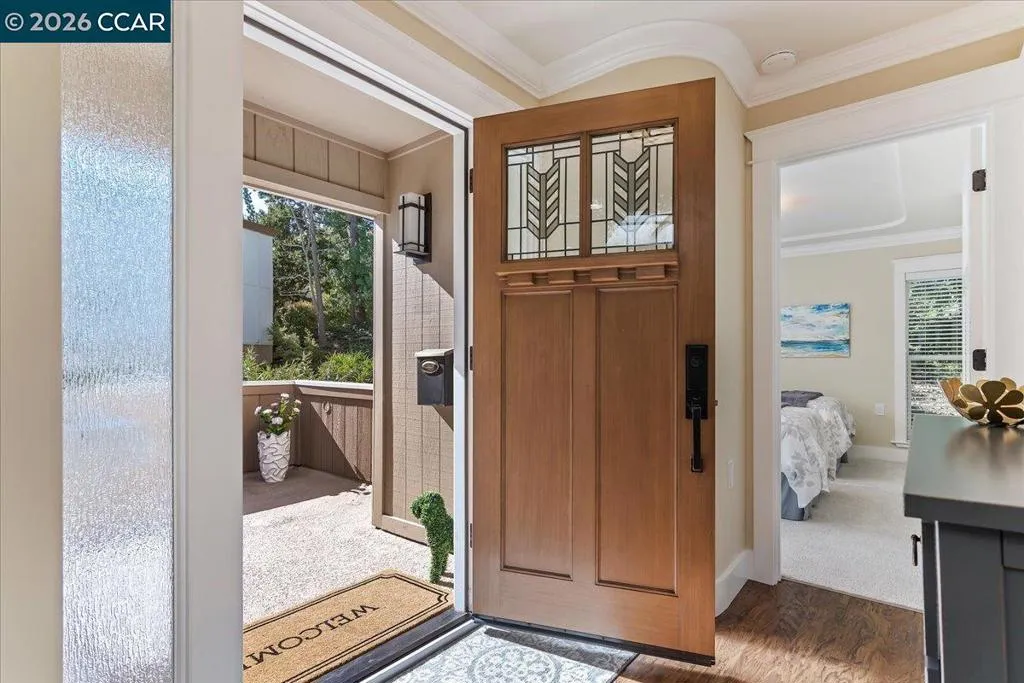 Beautifully reimagined Monterey model 2BR/2BA end unit filled with natural light and thoughtful upgrades throughout. Seamless reconfiguration enhances flow and functionality. Remodeled kitchen with custom cabinetry and stainless steel appliances. Updated bathrooms with modern finishes, including a bench in the primary shower. Crown molding and custom Smith & Noble window coverings throughout. Dining area features a modern coffered ceiling and custom cabinet wall with display lighting. Primary suite offers a tray ceiling and walk-in closet. Wired for surround sound with built-in speakers. Enjoy a peaceful, tree-surrounded back deck. A must-see home.