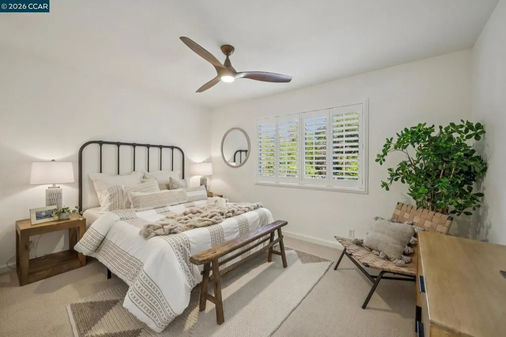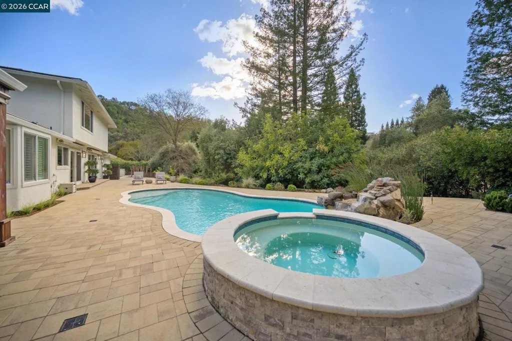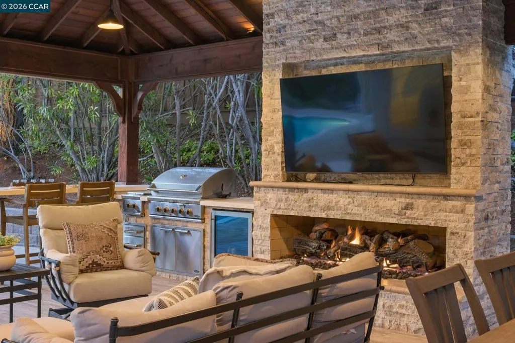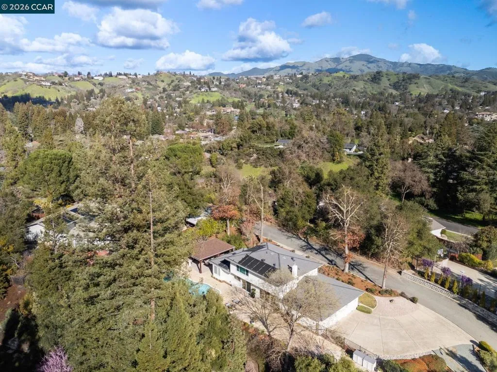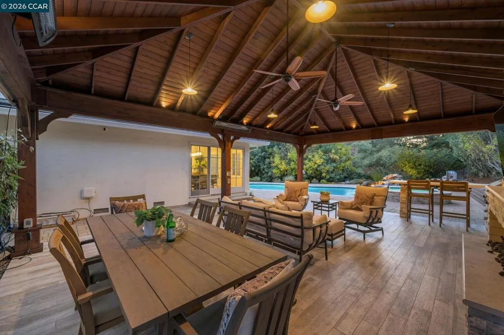 Set on a private, tranquil lane in Alamo, this light-filled 5BD/3BA home sits on .5 acres and offers privacy, space, and exceptional indoor-outdoor living with over $500,000 in upgrades. Enjoy a charming front porch with a seating area and Velux skylights that enhance the home’s natural light. The updated kitchen features backyard views, new quartz countertops, and stainless steel appliances. Desirable layout with a full bedroom and full bathroom on the main level. Resort-style yard with pool and spa plus a 660 sqft luxury pavilion that lives like an outdoor great room. Built with engineered steel and Western cedar, it features a 6' gas fireplace, two Bromic heaters, wireless motorized shades, and integrated lighting. Outdoor kitchen and bar include DCS appliances and a mounted 75" TV. Additional features include a 3-car garage, hardwood floors on the main level, new carpet, ample storage, pool solar, new roof, new AC, and an EV charger. Ideally located near top-rated SRV schools, Round Hill Country Club, parks/trails, the Iron Horse Trail, and local amenities. Views: Ridge
