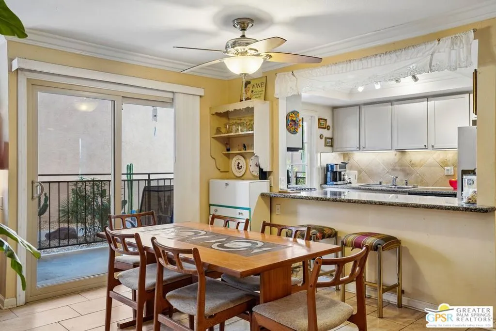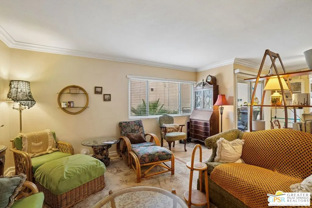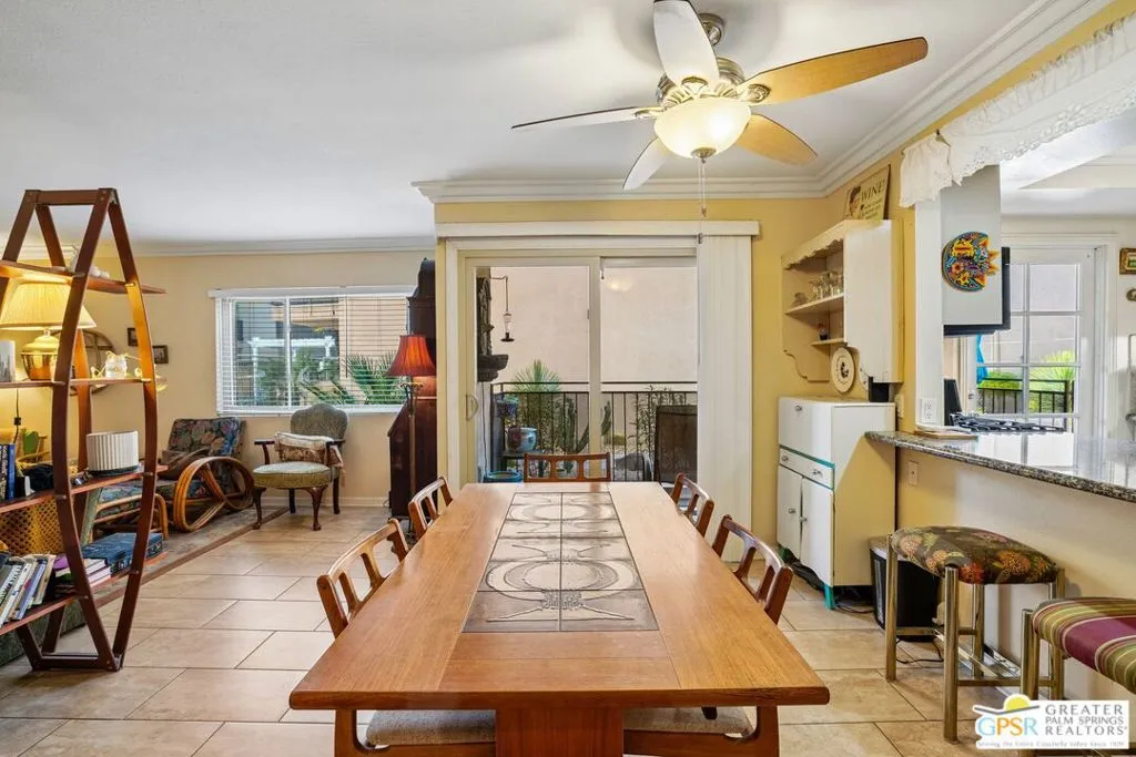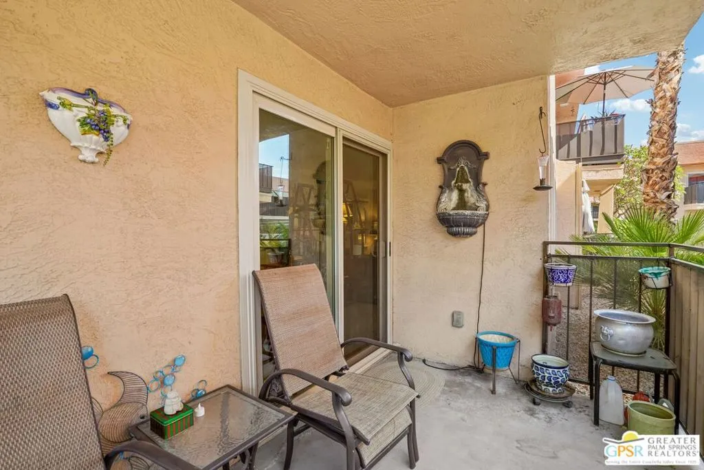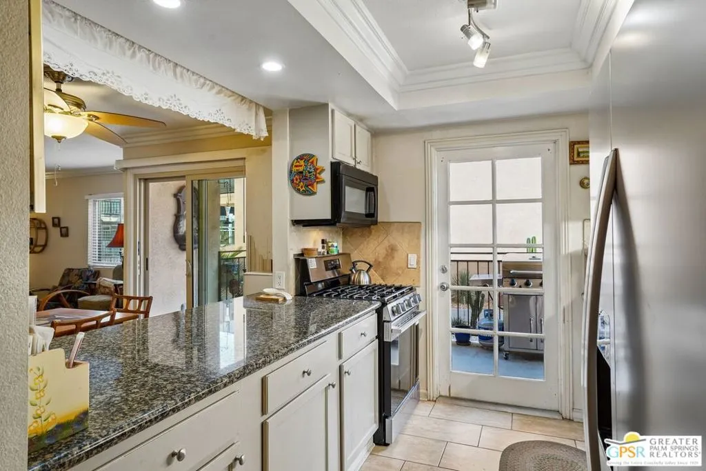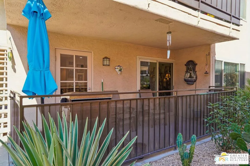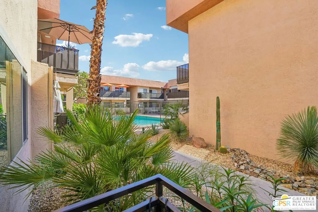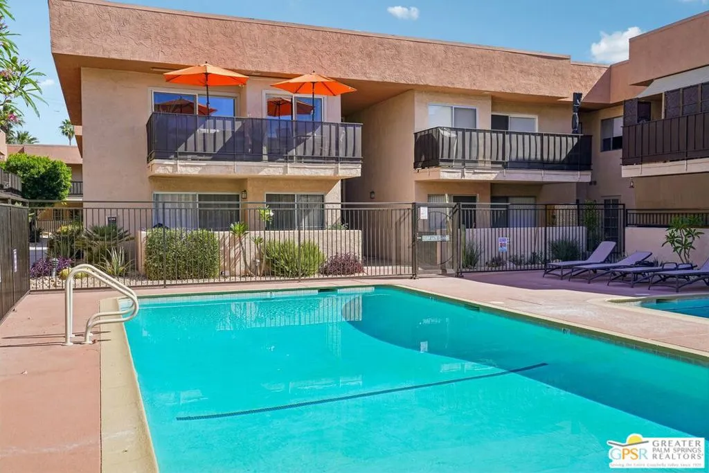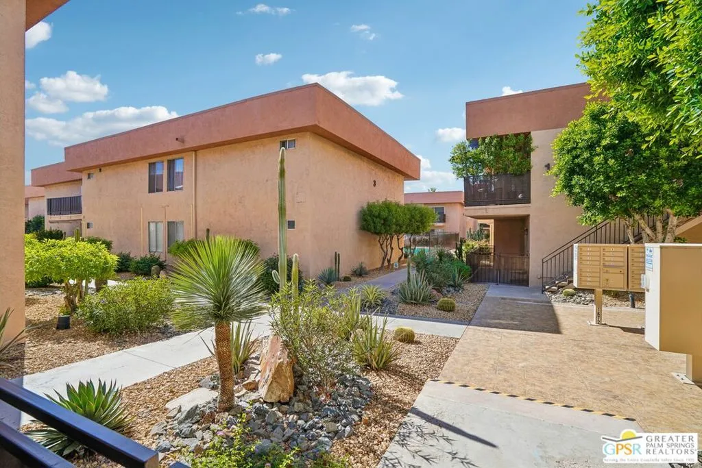 Ground level end unit located at Americana Gardens in central Palm Springs on land you own with low monthly homeowners dues. This two-bedroom, two-bath home has recently-installed tile flooring throughout, crown moldings, and has been fitted with all new dual-pane, sound-dampening windows and sliding glass doors. The Kitchen has granite countertops, with a breakfast bar, and all major appliances, including a refrigerator, dishwasher, range, and built-in microwave. The Master Bedroom features a generous walk-in closet, and the unit includes its own laundry area with washer and dryer. Striking west-facing mountain views from the bedroom windows. Outside, there is a fence-enclosed patio with a view to one of three sparkling swimming pools, each with a spa. Ownership in Americana Gardens also includes a community fitness room. Quick and easy access to downtown Palm Springs, the Convention Center, the Spa Resort and Casino, shopping, dining, medical and professional services.
