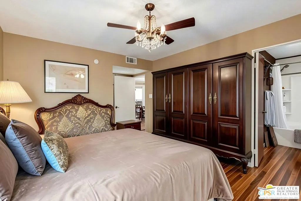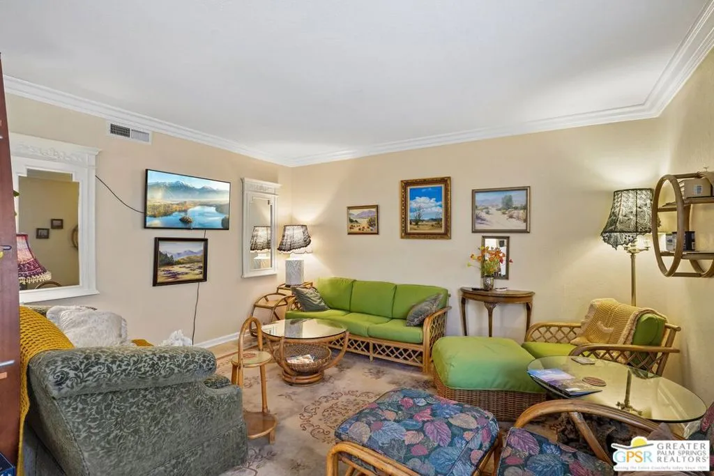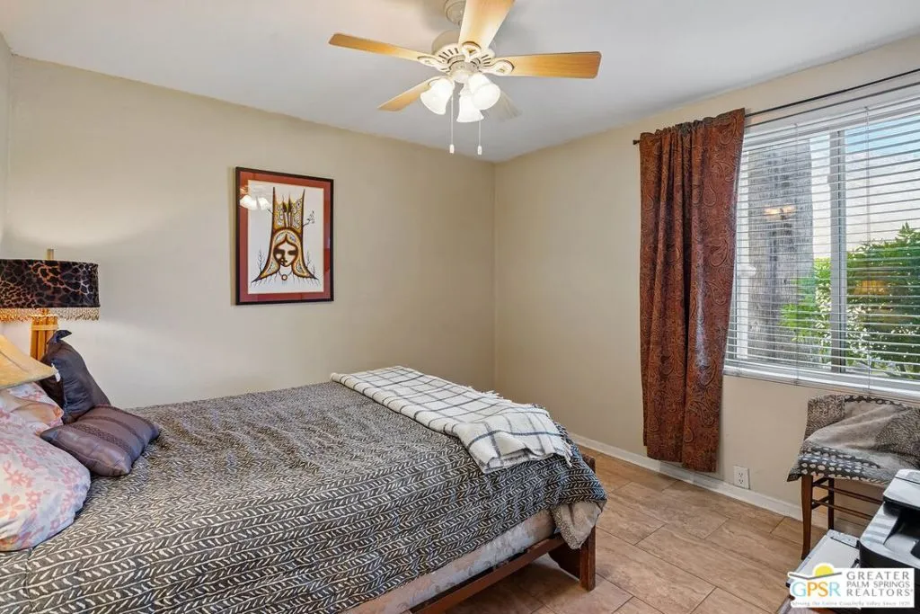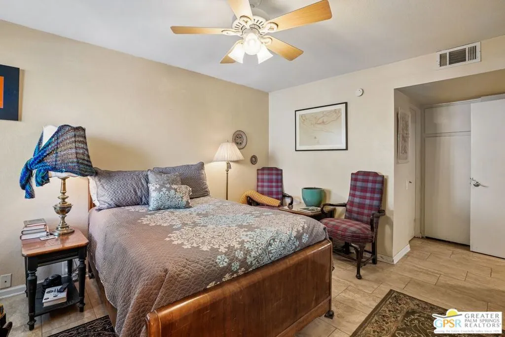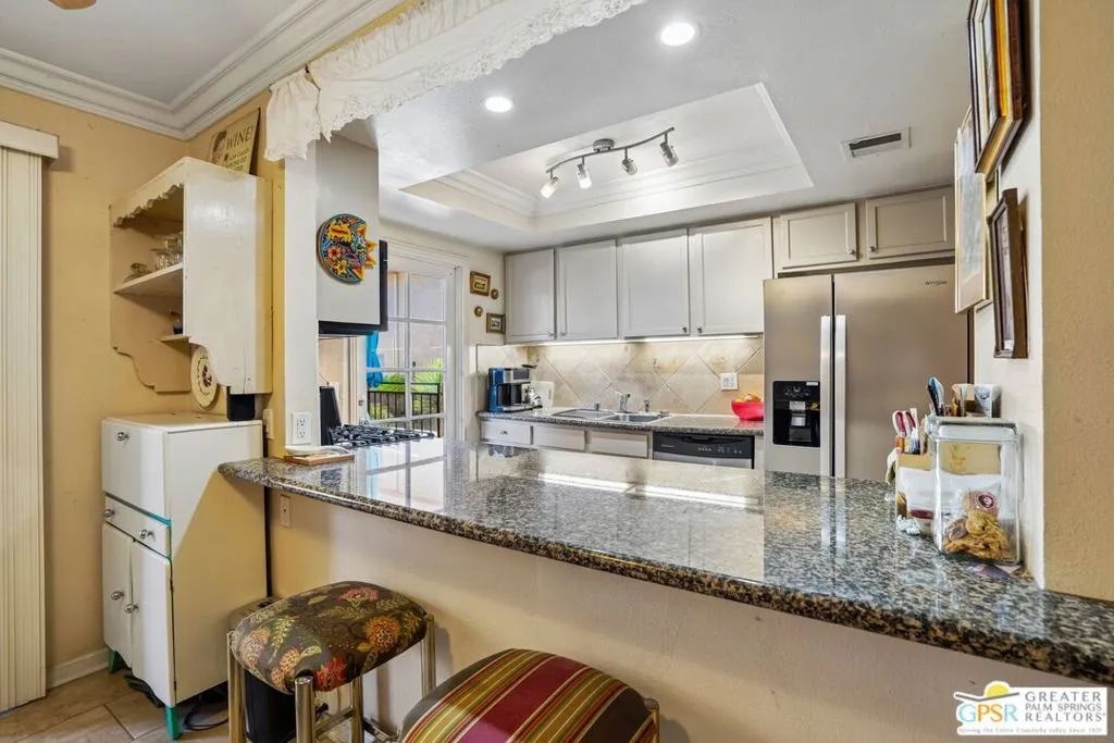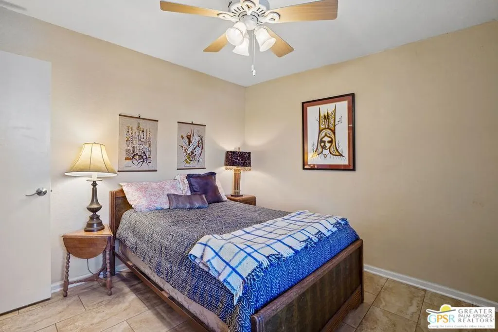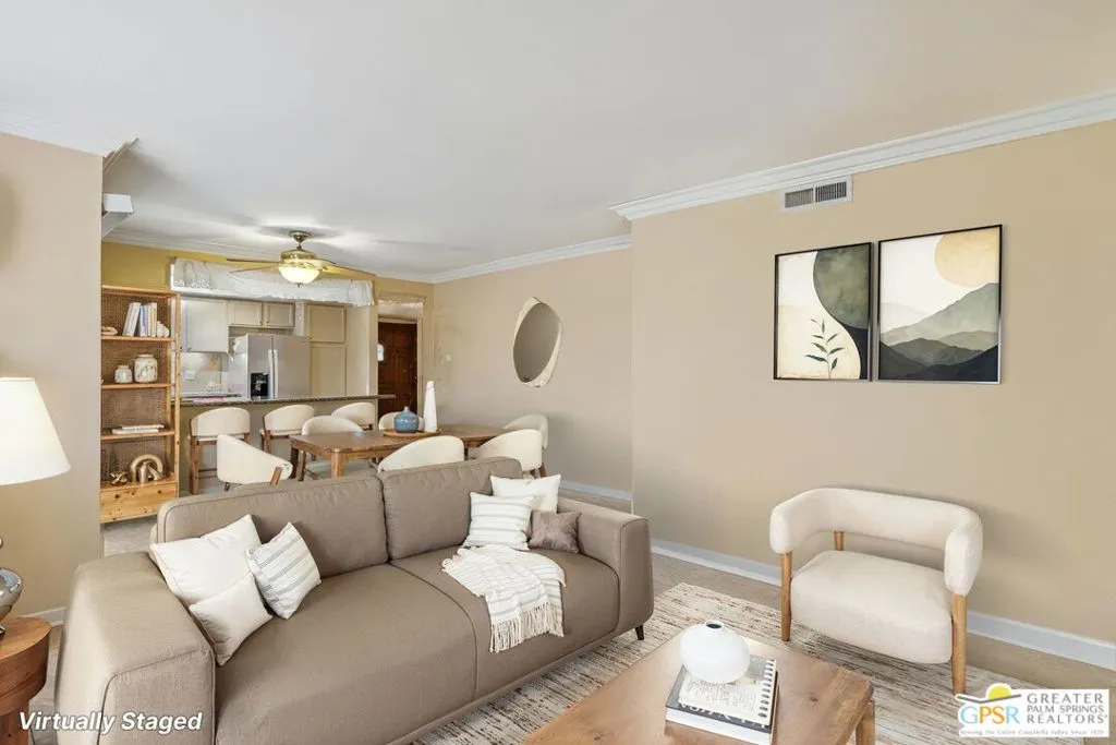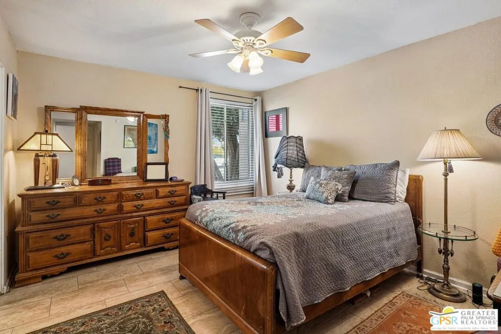 Ground level end unit located at Americana Gardens in central Palm Springs on land you own with low monthly homeowners dues. This two-bedroom, two-bath home has recently-installed tile flooring throughout, crown moldings, and has been fitted with all new dual-pane, sound-dampening windows and sliding glass doors. The Kitchen has granite countertops, with a breakfast bar, and all major appliances, including a refrigerator, dishwasher, range, and built-in microwave. The Master Bedroom features a generous walk-in closet, and the unit includes its own laundry area with washer and dryer. Striking west-facing mountain views from the bedroom windows. Outside, there is a fence-enclosed patio with a view to one of three sparkling swimming pools, each with a spa. Ownership in Americana Gardens also includes a community fitness room. Quick and easy access to downtown Palm Springs, the Convention Center, the Spa Resort and Casino, shopping, dining, medical and professional services.