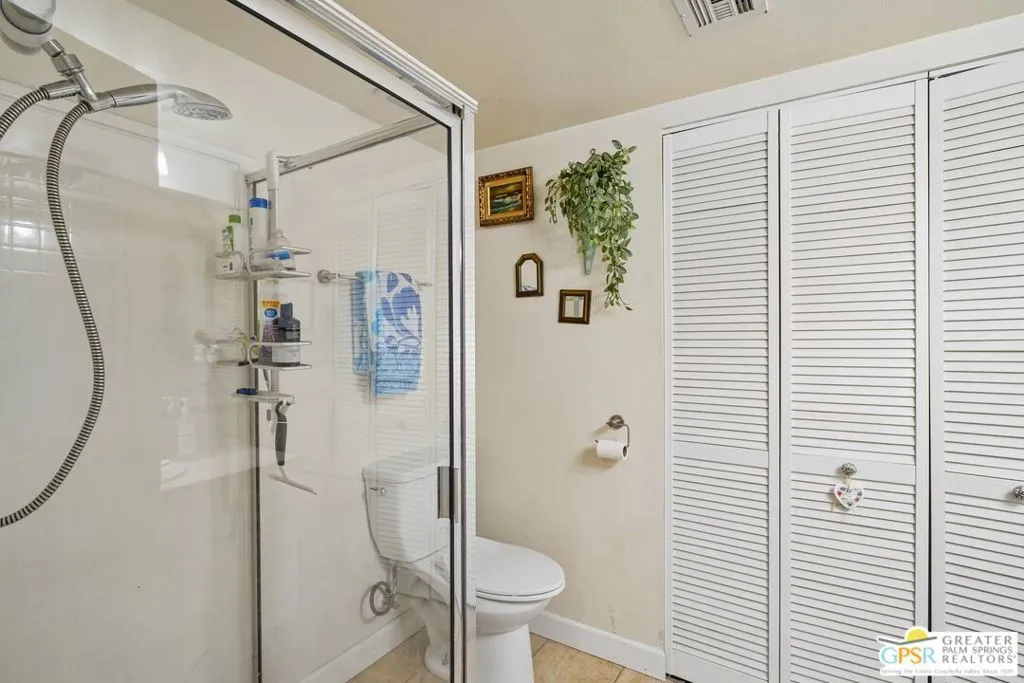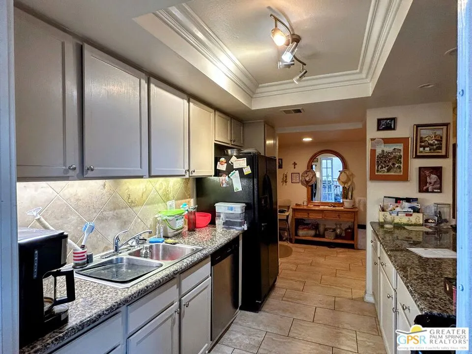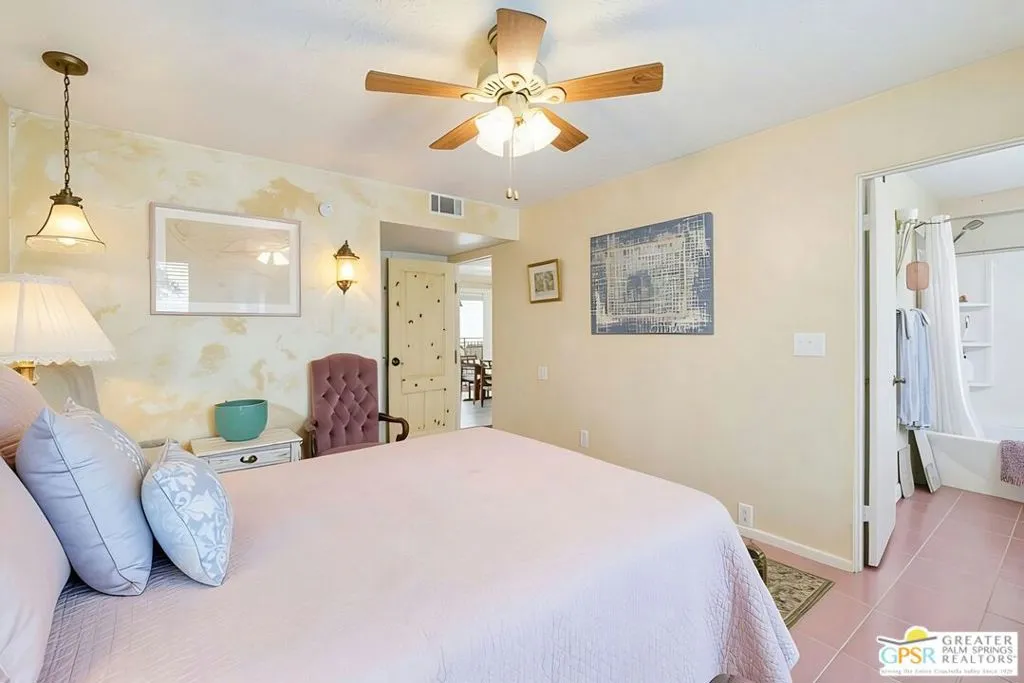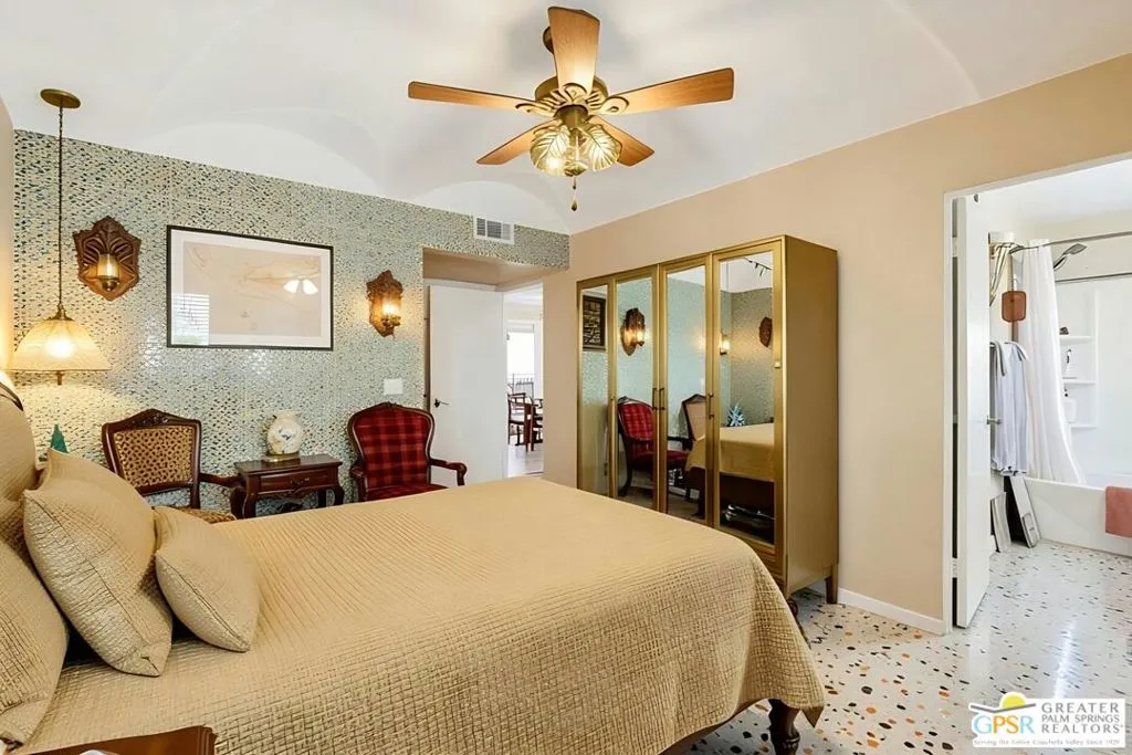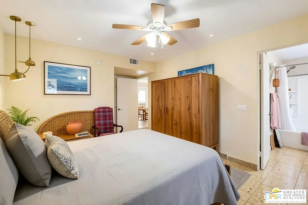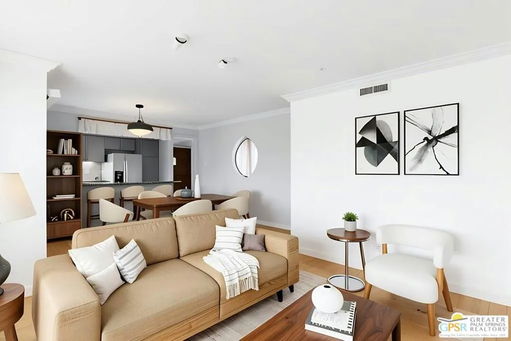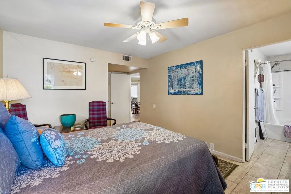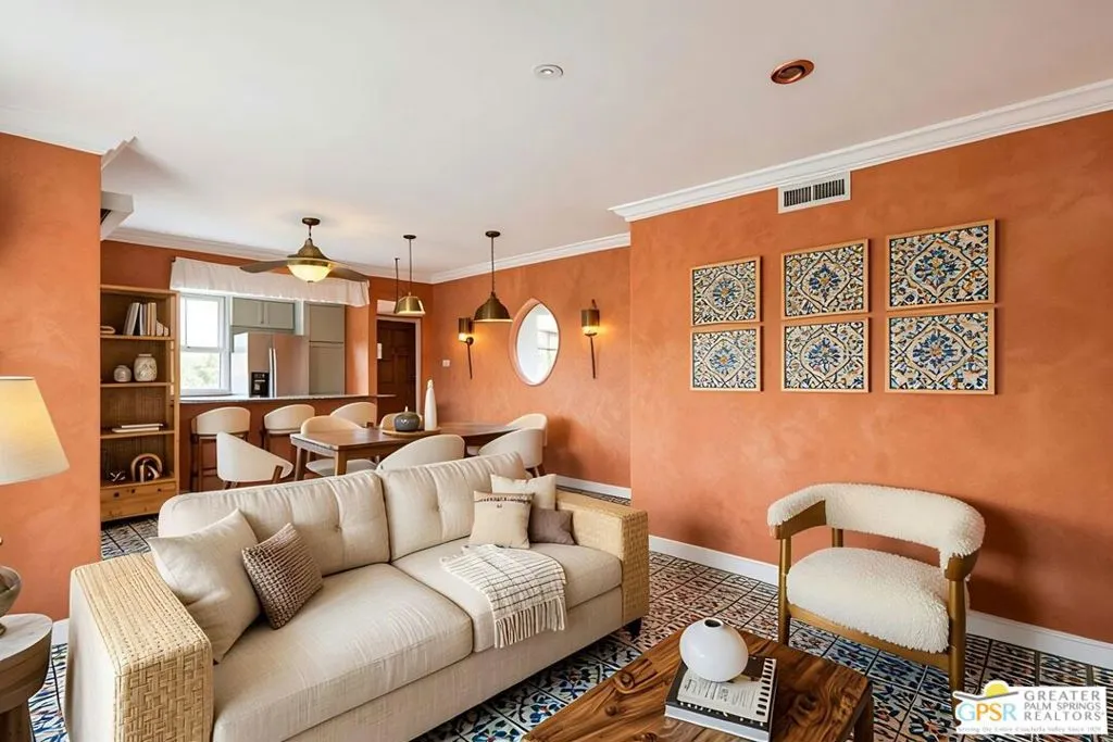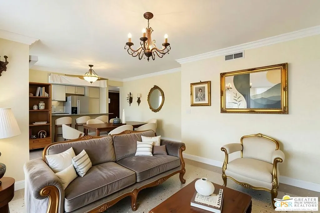 Ground level end unit located at Americana Gardens in central Palm Springs on land you own with low monthly homeowners dues. This two-bedroom, two-bath home has recently-installed tile flooring throughout, crown moldings, and has been fitted with all new dual-pane, sound-dampening windows and sliding glass doors. The Kitchen has granite countertops, with a breakfast bar, and all major appliances, including a refrigerator, dishwasher, range, and built-in microwave. The Master Bedroom features a generous walk-in closet, and the unit includes its own laundry area with washer and dryer. Striking west-facing mountain views from the bedroom windows. Outside, there is a fence-enclosed patio with a view to one of three sparkling swimming pools, each with a spa. Ownership in Americana Gardens also includes a community fitness room. Quick and easy access to downtown Palm Springs, the Convention Center, the Spa Resort and Casino, shopping, dining, medical and professional services.