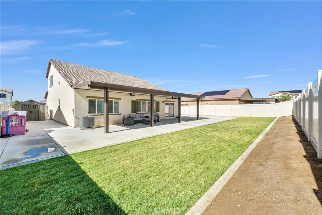 Welcome to this beautifully upgraded 5-bedroom, 3-bathroom home offering 2,537 sq ft of modern living space and a 3-car garage. Designed with an open-concept floor plan, this home seamlessly blends comfort and functionality. The main level features a spacious primary suite with a private ensuite bathroom, an additional guest bedroom, a full bathroom, and a convenient downstairs laundry room, ideal for multigenerational living or hosting guests. Upstairs, you’ll find a generous loft perfect for a media room, or play area, along with three additional bedrooms (including one with a walk-in closet) and a full bathroom. This home is equipped with premium Energy Efficiency appliances, HVAC, Tankless Water Heater, Garage equipped with solar vehicle charging capabilities, and SMART home features, including front door locks, smart-controlled air conditioning system, sprinkler system, garage doors, Deako smart lighting throughout, etc. The beautifully landscaped front yard offers great curb appeal, while the backyard is designed for entertaining with an Alumawood patio cover complete with built-in lighting and ceiling fans, perfect for relaxing or hosting gatherings year-round. This modern home truly has it all—style, space, and smart functionality. ***Fully Owned and Paid Off Solar Panels***