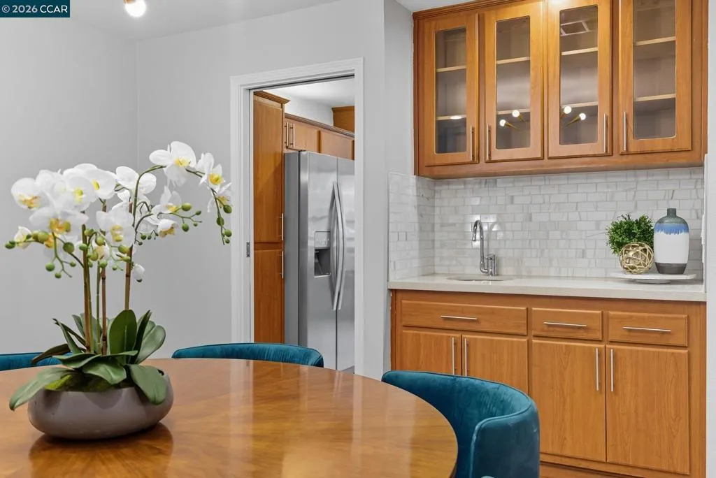 Stylish top-floor, single-level condo in the desirable San Miguel HOA just steps from Broadway Plaza and the Iron Horse Trail. Offering vaulted ceilings and hardwood floors, this 2 bedroom, 2.5 bath home combines modern updates with a mid-century vibe. With dramatic ceiling height and a striking slate fireplace, the family room is filled with natural light from French doors that open to a private deck. An adjoining dining area with wet bar creates the perfect space for entertaining, while the eat-in kitchen showcases quartz counters, a marble tile backsplash, a coffee bar station, and a walk-in pantry. The expansive primary suite includes a bonus space for a home office, a private deck, and a luxurious bathroom with dual sinks, an oversized shower, and abundant built-in storage. A second bedroom with vaulted ceilings is complete with a nearby full bath. A stylish half bath adds convenience for guests. Additional highlights include 2 elevators, an in-unit washer/dryer, two assigned parking spaces in the gated garage, and access to the community pool. Daily conveniences are close at hand, with Safeway just a block away, along with shopping, dining, and the Iron Horse Trail. Lifestyle living at its best in the heart of Walnut Creek. Please note, this unit can be a rental!