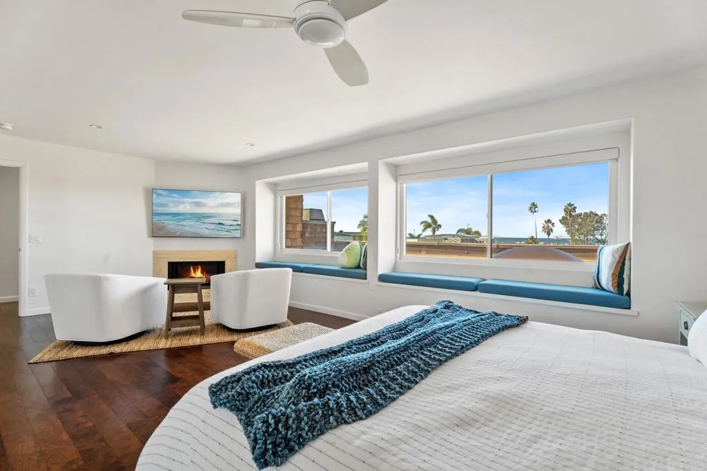 Some homes feel like a vacation the moment you walk in. This is one of them. Nestled in the coveted Sea Point community of Del Mar, this beautifully updated 3+ bedroom, 2 bath townhome spans 1,886 square feet, where ocean views, coastal trails, and Torrey Pines State Beach are all within easy reach. The heart of the home is the ocean-view kitchen, designed for both daily living and easy entertaining. Granite countertops, stainless steel appliances, generous cabinetry, and warm wood floors set a refined tone. Step onto the balcony and the payoff is immediate: sweeping views of the Pacific, Torrey Pines Reserve, and the kind of sunsets you'll never take for granted The entry level offers two bedrooms and a full bath, each opening directly to a private enclosed patio, creating a seamless connection between inside and out, perfect for guests or flexible living arrangements. The entire top floor belongs to the primary suite. A fireplace anchors the ocean-view sitting area, while the spa-inspired bath features an oversized shower, a walk-in closet, and custom built-ins, a true retreat above it all. A bonus room on the lower level, accessible from the laundry room and two-car garage, adapts easily to a home office, gym, media room, or overflow guest space. The garage itself is finished with epoxy floors and built-in storage, and convenient guest parking sits just steps away. Outside, the enclosed front patio is made for slow mornings and easy evenings, your own private perch to relax, entertain, and fire up the grill. Sea Point residents enjoy two pools, tennis courts, and a lushly landscaped four-acre park complete with a walking trail, sand volleyball court, and playground, a rare amenity package in one of Del Mar's most sought-after coastal enclaves. Just beyond the community, the beach, local cafes, and scenic hiking trails are all an easy stroll away. This is coastal living at its most effortless, ready for the weekend, the summer, or forever. Furnishings are available if desired, making it easy to move right in and start enjoying from day one.