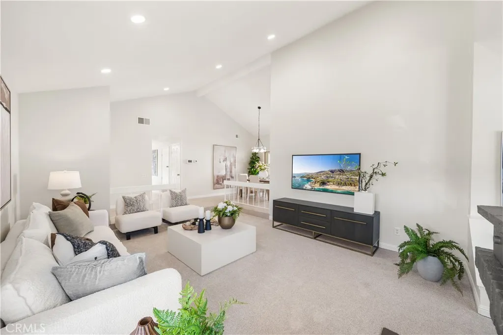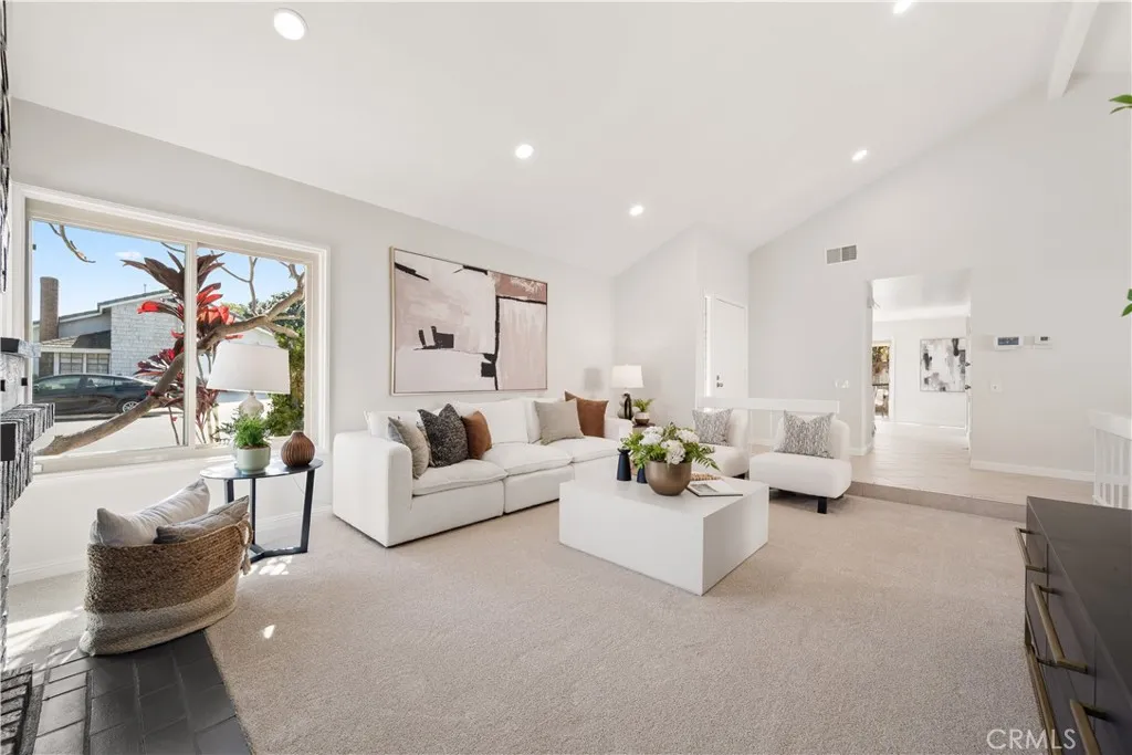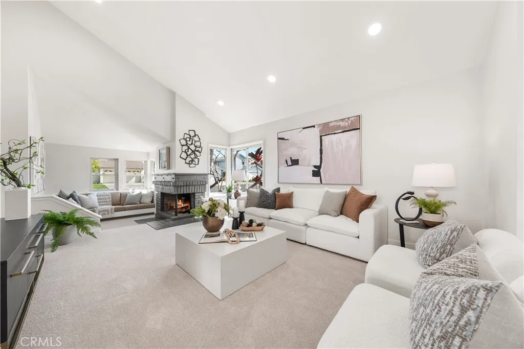The living room and dining area both showcase vaulted ceilings, creating an impressive sense of volume and openness that enhances the home’s airy, expansive feel. Abundant windows throughout flood the interior with natural light, while brand-new carpeting adds a fresh, move-in-ready touch and elevates the overall comfort of the home. The spacious living room is anchored by a cozy fireplace and complemented by a charming built-in window seat — a perfect sunlit nook for relaxing or enjoying a quiet moment.