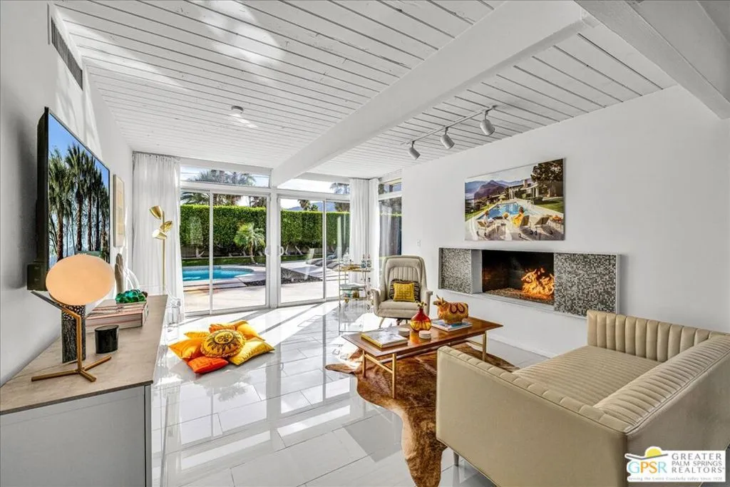 A "Palmer & Krisel" Original. Nestled in the historic and iconic Racquet Club Estates, this Mid-Century stunner designed by Palmer & Krisel and built by Alexander Construction Co. perfectly captures the innovative spirit of desert modernism. This neighborhood is a true reminder of the importance of design, famous for its five distinct rooflines and architectural pedigree highlighted by open floor plans, atriums, and breezeways. Inside, the signature post-and-beam construction is flooded with California sunshine via breathtaking walls of glass and strategically placed clerestory windows that frame the incredible San Jacinto mountain views. While retaining its 1959 soul, this residence has been meticulously updated for the 21st century to blend vintage charm with modern luxury. The unique, restored floating iron and tile fireplace serves as a stunning focal point for cool desert nights, complemented by glossy tile floors. The kitchen features Caesarstone counters, custom cabinetry, and sleek stainless steel appliances. Even the bathrooms have been thoughtfully coordinated with modern mosaic accent tiles that feel authentically Palm Springs. Practical updates like OWNED solar, an EV charger in the garage, updated plumbing, and dual-pane windows ensure this classic home functions with contemporary efficiency. Designed for the quintessential indoor-outdoor living experience, the spacious south-facing backyard is a private resort and the ultimate Palm Springs lifestyle. A gorgeous swimming pool invites you to float for hours, while a jetted spa helps you de-stress under the starry desert nights. The outdoor space is an entertainer's dream, featuring a custom sunshade canopy and a covered patio defined by a vibrant artist-curated mural. Whether you're sipping cocktails by the mural wall or rinsing off in the tiled outdoor shower, every inch is framed by beautiful landscaping and striking views. Located just blocks from the chic downtown area and all things cool Palm Springs has to offer. This home is a magnet for architecture fans seeking a sophisticated second home or a full-time residence. Welcome to Racquet Club Estates, stop dreaming and start living the life you've always imagined.