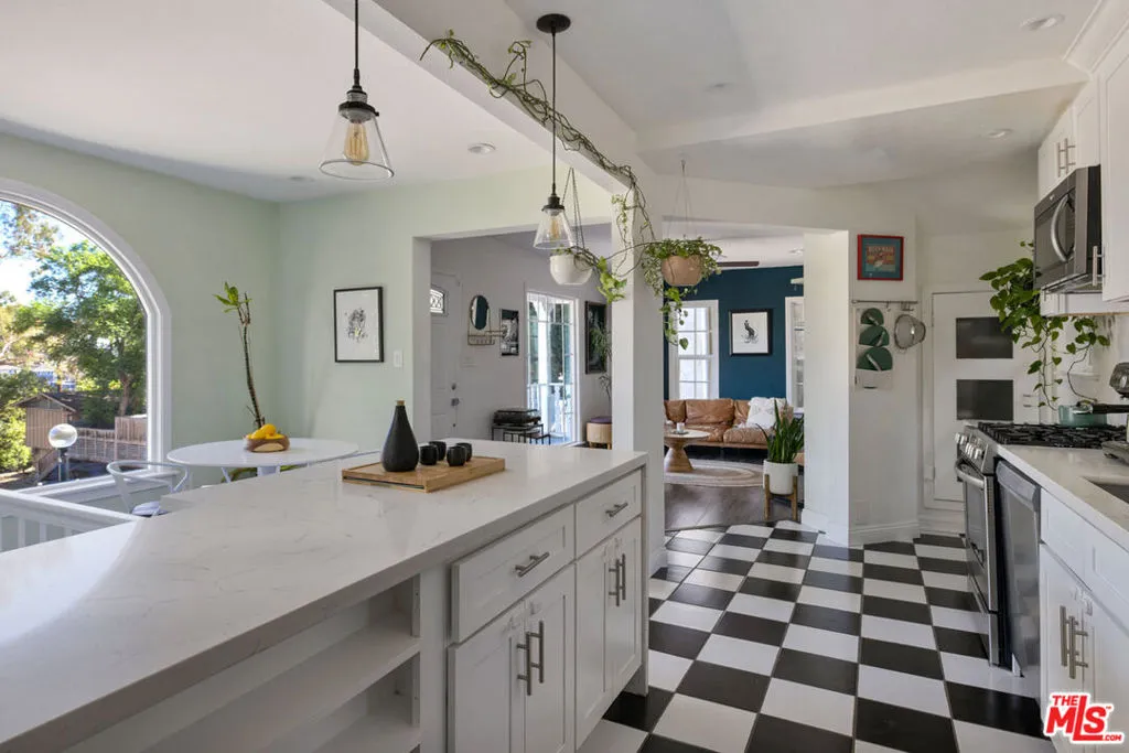 Silver Lake living feels exquisite in this 1930 Spanish, reimagined with modern sensibility and enjoying sweeping hillside views. The tri-level layout balances original charm and smart updates, featuring bright, airy rooms with effortless flow. In the living room, a large picture window frames the hills in golden light; the dining room centers on a grand arched window, a perfect backdrop for gatherings. The open kitchen is finished with waterfall quartz counters, stainless appliances, counter seating, and abundant storage. Three bedrooms and two updated baths provide versatility, including a lower-level suite with private entrance, full bath, and laundry, ideal for guests or creative work.Lush outdoor space expands across multiple terraces: a deck above the garage for sunset cocktails, a rustic stone patio for relaxing, and a serene garden retreat.From this street-to-street lot, enjoy proximity to the Reservoir, Meadow, Silver Lake Wine, Whole Foods, and local favorites along Glendale Boulevard.