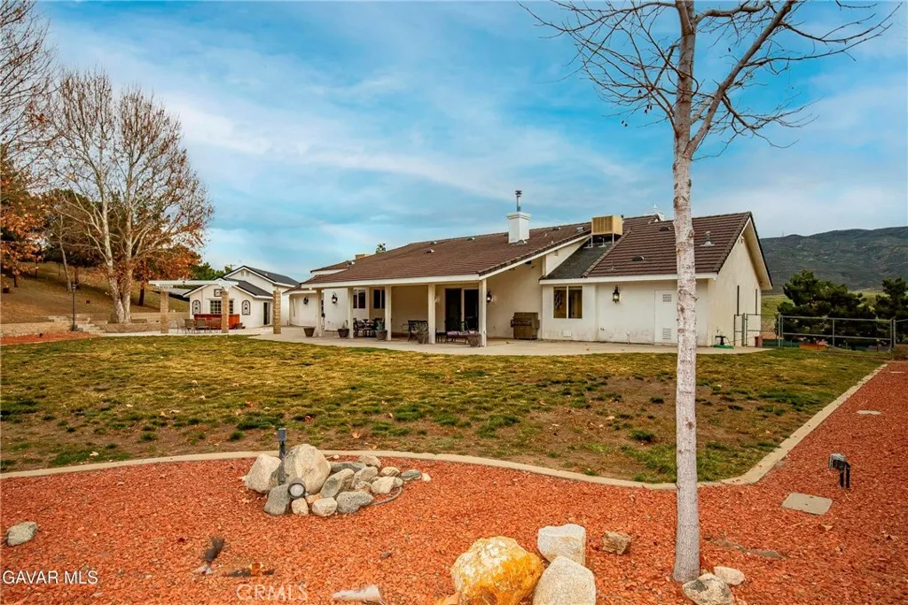 GORGEOUS SINGLE STORY CUSTOM HOME IN CHARMING LEONA VALLEY! Don't miss this Private Oasis on 2.5 Acres of all useable Property. A Private Location yet 15 minutes to Palmdale & the Freeway & 30 minutes to Santa Clarita. AMAZING VIEWS & HIGH END FINISH! This Impressive Home features a Covered Porch from which to enjoy the View across the front of the house. You will be impressed from the moment you enter thru the Custom Door with Matching Side Lights. There is Wide Crown Molding, Wood Casings/Sills & High Ceilings thruout. The Formal Living Room with Cozy Fireplace and Formal Dining are great for entertaining. And there is a Huge Family Room with Builtins & a Woodstove. The Lovely Chef's Kitchen has Custom Cherry Cabinets, Granite Countertops, Stainless Appliances including Double Ovens & Refrigerator stays. There are lots of Pantry Cabinets & an Office Nook. The Master has a Walkin Closet and an Elegant Master Bath with Dual Sinks, Spa Tub & Separate Shower. The Laundry Room has a Sewing/Desk built in. An Exercise Room with closet could be 4th Bedroom. There is a Detached Private Office also. The Covered Patio across Back of House is great for the Family & Entertaining. The Spa stays. You'll love the Lovely Mature Landscaping. 150 Mature Trees create a Parklike Feel. The Attached 4 Car Garage is 1800sf and extra deep with 2 of doors 9ft. Plus there is a 48ft long,1600sf RV Garage with 50amp Hookup. There are 2 RV Dumps. You'll appreciate the 36 paid for Solar Panels. The 200 amp Panel. The Private Well plus AVEK hookup for low cost water. 2 Water Storage Tanks. (2)40ft Conex storage containers are on slab & set up for equipment/tool storage & 4 other enclosed storage spaces. Property is fully fenced with Electric Rolling Entry Gate with Keypad & Remote Entry Feature plus 2 other Gates. There is Extensive Cement Work--about 13,000sf! Plus Security Lights. You'll fall in love with this home and the Tranquil, Private Location with its Great, FRIENDLY SMALL TOWN FEEL!