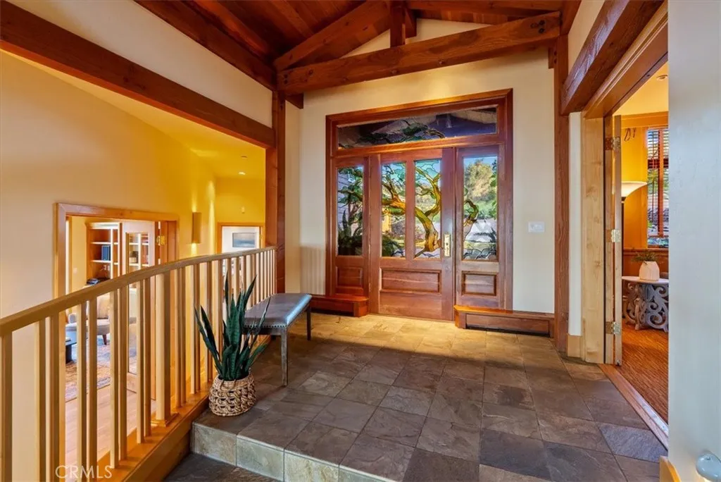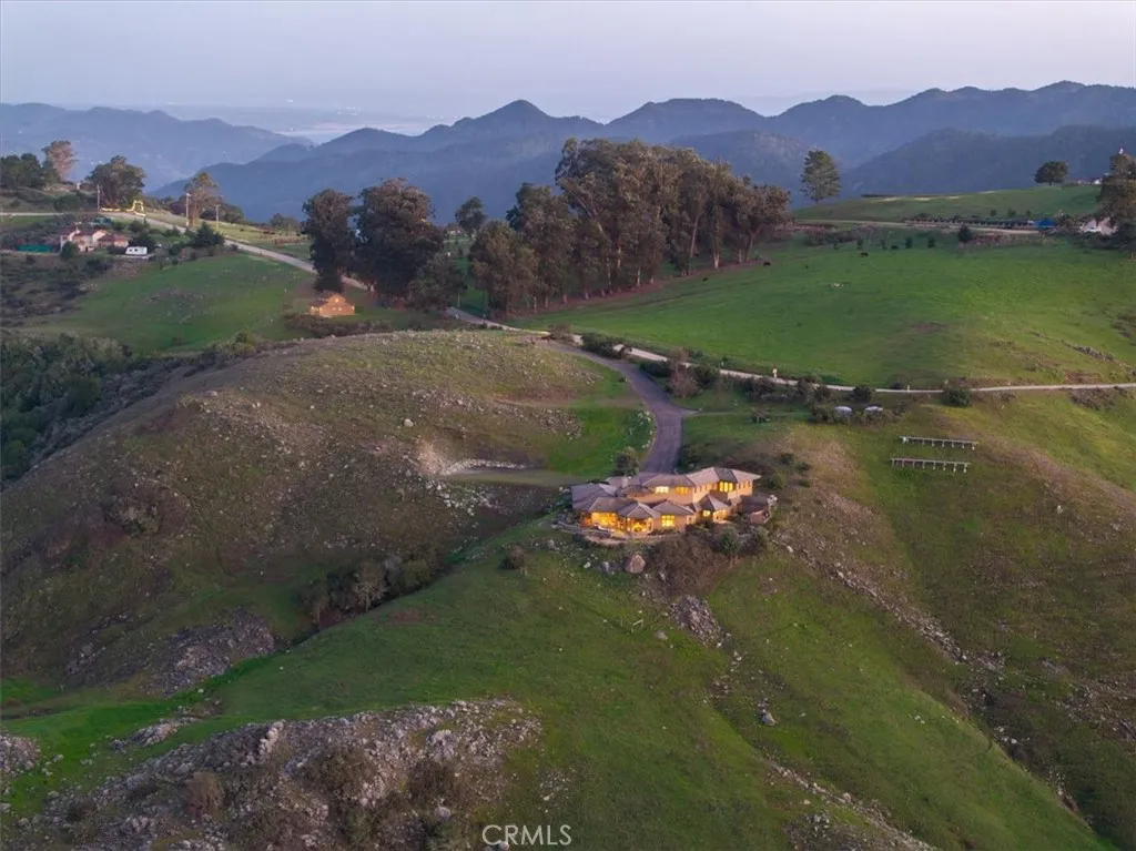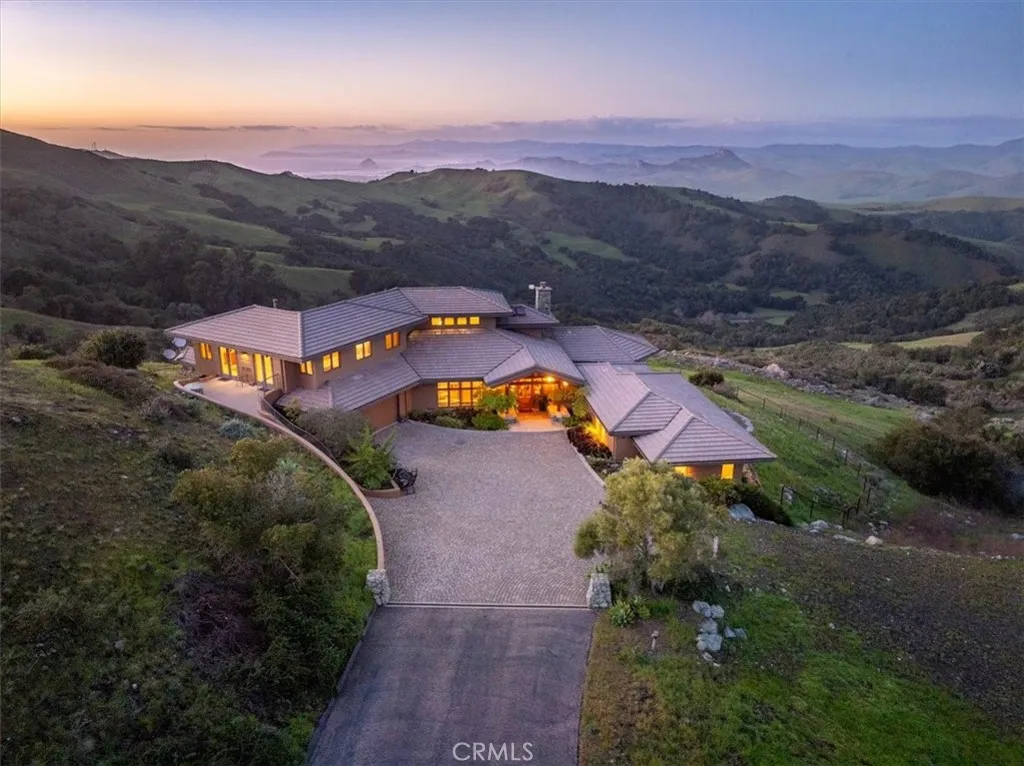 Set high above the landscape in Prefumo Canyon, this extraordinary 56± acre private estate offers commanding, unobstructed views of the Pacific Ocean, Morro Rock, the Seven Sisters, Irish Hills, and the city lights of San Luis Obispo—one of the Central Coast’s most iconic vantage points. Despite its peaceful seclusion, the property is located approximately 5.5 miles from downtown San Luis Obispo, about 20 minutes to Avila Beach, and within easy reach of Morro Bay, Montaña de Oro State Park, wineries, shopping, schools, and the regional airport. The custom-built main residence (2004) is thoughtfully designed to embrace its setting, featuring vaulted tongue-and-groove cedar ceilings, walls of glass, skylights, and seamless indoor-outdoor flow. The flexible floor plan includes four bedrooms, three bathrooms, a media room, office, and bonus room or optional fifth bedroom, all arranged to maximize privacy and views. The great room is anchored by a sculptural serpentine stone wall built from on-site stone, a gas fireplace, wraparound windows, and French doors opening to panoramic patios. The kitchen and dining areas offer vaulted beam ceilings, a generous center island, expansive picture windows, and direct access to outdoor entertaining spaces. The main-level primary suite, privately positioned in its own wing, features exposed beam ceilings, patio access, and a spa-inspired bath with a travertine steam shower and soaking tub oriented toward the horizon. A detached cabin, fully separated from the main residence, provides a full kitchen, bedroom, bathroom, living and dining areas, laundry, and dedicated storage/workshop space—ideal for guests, extended stays, or multigenerational living. The land invites exploration with private hiking, abundant wildlife, and ever-changing natural scenery. The property is extensively engineered for comfort and resilience, offering multiple water sources, filtration and storage systems, owned solar with battery backup, a propane-powered generator, fire-resistant construction, and infrastructure designed for reliable year-round living.