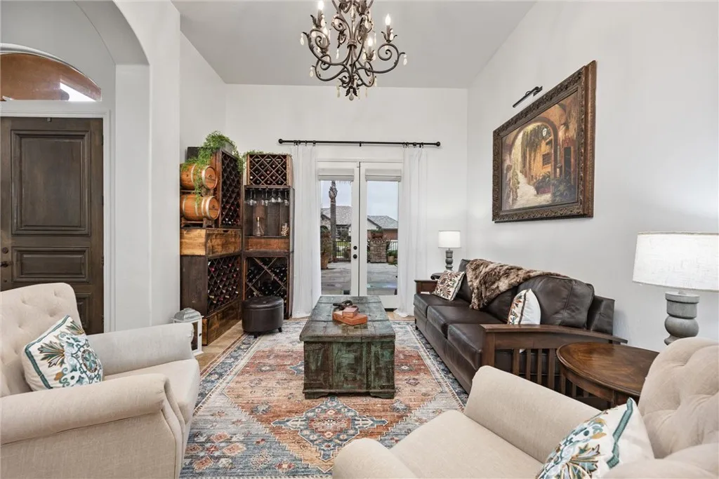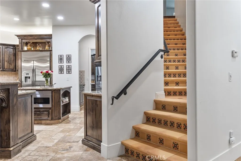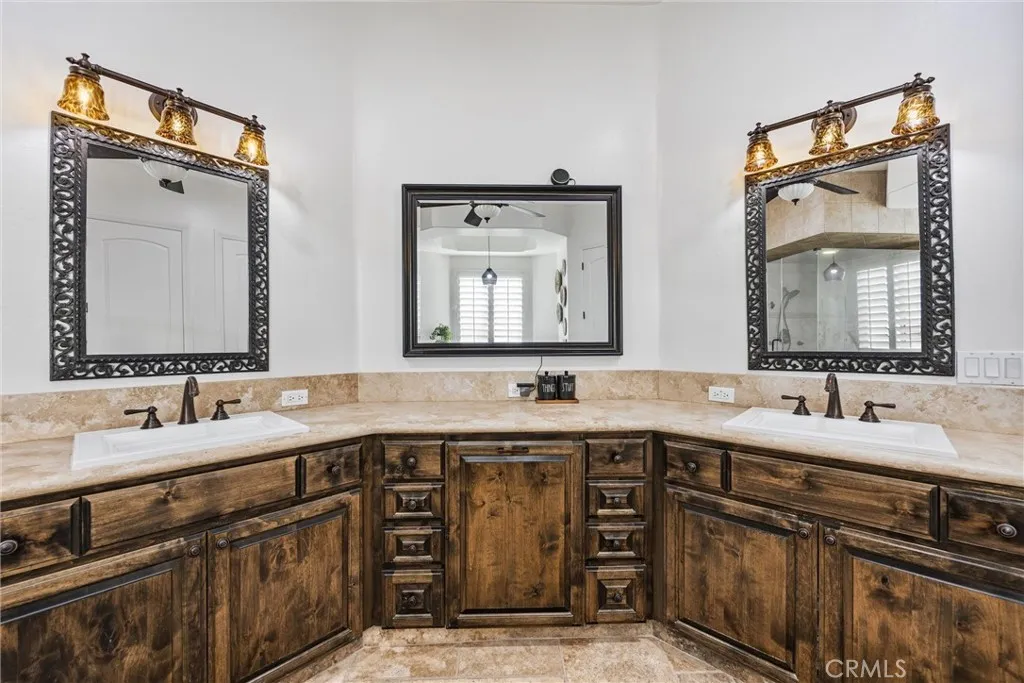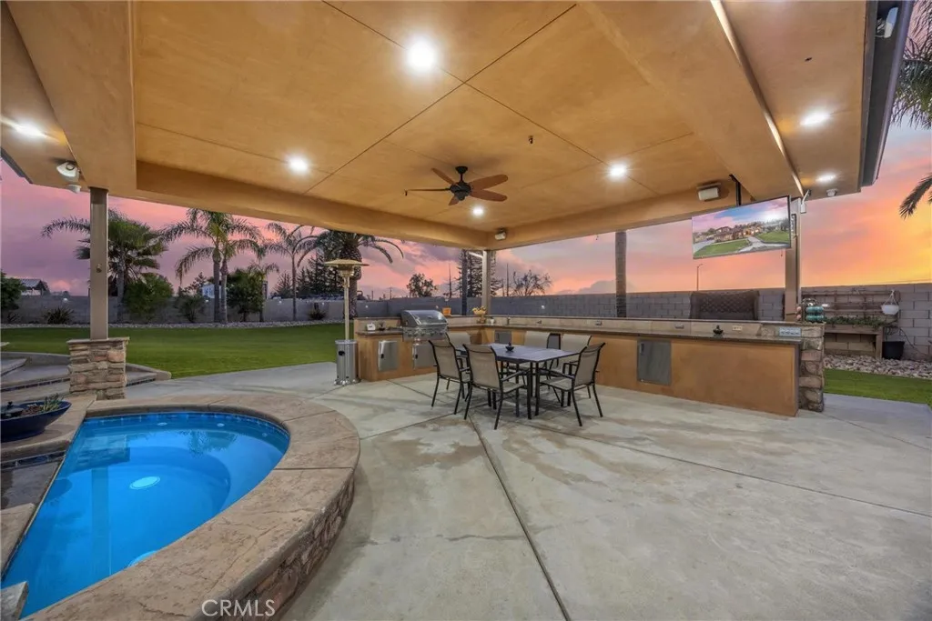 Experience luxury at its finest in this stunning 7 BR, 6.5 BA estate approx 5,460 sq. ft. of refined living space, massive RV shop, plus a permitted 886 sq. ft. sunroom. This home is designed for both grand entertaining & comfortable everyday living. This property sits on a beautifully landscaped 1 acre lot. Inside the main home, there is high end travertine flooring throughout the entire house, adding timeless elegance & durability. Step outside to a resort style backyard complete with a sparkling pool, fire pit, and an outdoor kitchen with covered seating area. The yard is designed for low maintenance luxury, featuring extensive pet friendly turf (approx. 10,000 sq. ft. per seller). Additional highlights include owned solar and 3 car garage. The RV garage/shop is currently used as a gym with a guest house located above. The shop is highly versatile & can easily be converted into a large event or entertainment area. This home is the perfect blend of luxury & functionality.