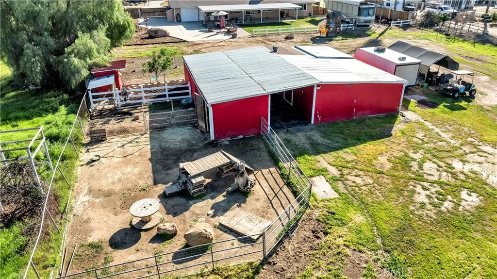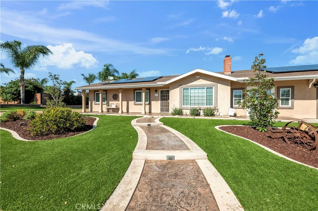 Welcome to this beautifully upgraded single-story home with PAID SOLAR in the highly sought-after J-BAR RANCH COMMUNITY — a rare 1.26-acre HORSE PROPERTY offering comfort, style, & exceptional versatility. This spacious residence features 3 bedrooms PLUS a bonus room & 2 bathrooms, thoughtfully updated throughout. Recent improvements include new laminate flooring, crown molding, fresh interior paint, a new roof with fascia & gutters & a new HVAC system w/updated ducting & insulation. Energy efficiency is enhanced w/paid-for solar, new double-pane windows & new French doors that fill the home w/natural light. The remodeled kitchen is a true centerpiece, showcasing Quartzite countertops, stainless steel appliances, under-cabinet accent lighting & a center island perfect for entertaining. A permanent custom dining table w/a matching Quartzite tabletop creates a cohesive & elegant dining space. The bonus room is ideal for gatherings & features a custom bar complete w/a Quartzite counter & sink. The spacious living room offers warmth & charm w/a wood-burning fireplace & custom mantle — the perfect place to relax & unwind. Partially remodeled bathrooms include new toilets, beautifully tiled showers & new shower door. The Primary bathroom features dual shower fixtures for a luxurious spa-like experience. Also features an oversized, insulated 2-car garage w/additional roll up door that leads to the backyard . Step outside to enjoy the the fully covered back patio, low-maintenance landscaping, enhanced by custom color-stamped walkways. The property also offers dual RV access w/double gates & a large RV carport with hookups — ideal for recreational vehicles, trailers, or guests. Equestrian & hobby amenities abound, including 100% flat, useable lot, a breezeway barn w/three stalls, tack room & a large storage/shop area equipped with water & power. Additional features include a hen house, livestock paddock areas, direct access to the community bridle trails & ample room to build an arena or expand w/additional pastures. This exceptional property combines modern upgrades, rural functionality, refined comfort, low taxes & NO H.O.A — all within a premier community setting.