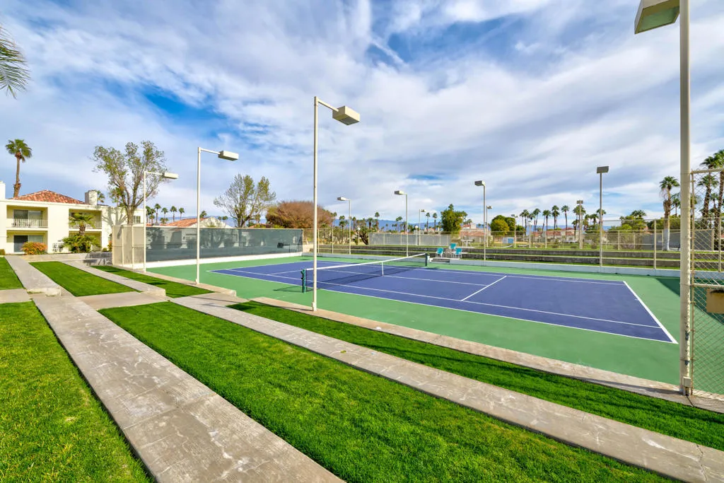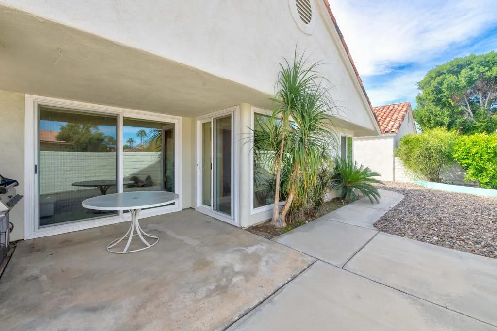Reduced.....Located across from the world renown Indian Wells Tennis Gardens, this is resort living in the heart of the desert. This 3 bedroom/2 bath 1536 s.f. detached home with private yard is located in a quiet area of gated Desert Breezes. Kitchen has granite countertops and darkly finished wood cabinets. There is an area in the kitchen for casual dining. Additionally, there is a separate formal dining room as well. The primary suite is a private retreat with dual closets, double sinks and shower and commode area. This bedroom also hosts a small patio area for sipping on your morning coffee or enjoying the sun. There are 2 other bedrooms ... one of which would make a nice office or den. There is a hallway bathroom with tub/shower enclosure. Washer and dryer are located in the garage.Newer a/c unit.Desert Breezes is a very desirable community with 6 pools and 5 spas, tennis/pickleball courts and a clubhouse with a gym. The monthly HOA dues of $435 covers trash, common areas. Every few years the homes are painted so that all are uniform in color in the community. Desert Breezes is close to all amenities-- shopping, dining, schools and churches. Don't miss out on visiting this TURNKEY FURNISHED HOME!