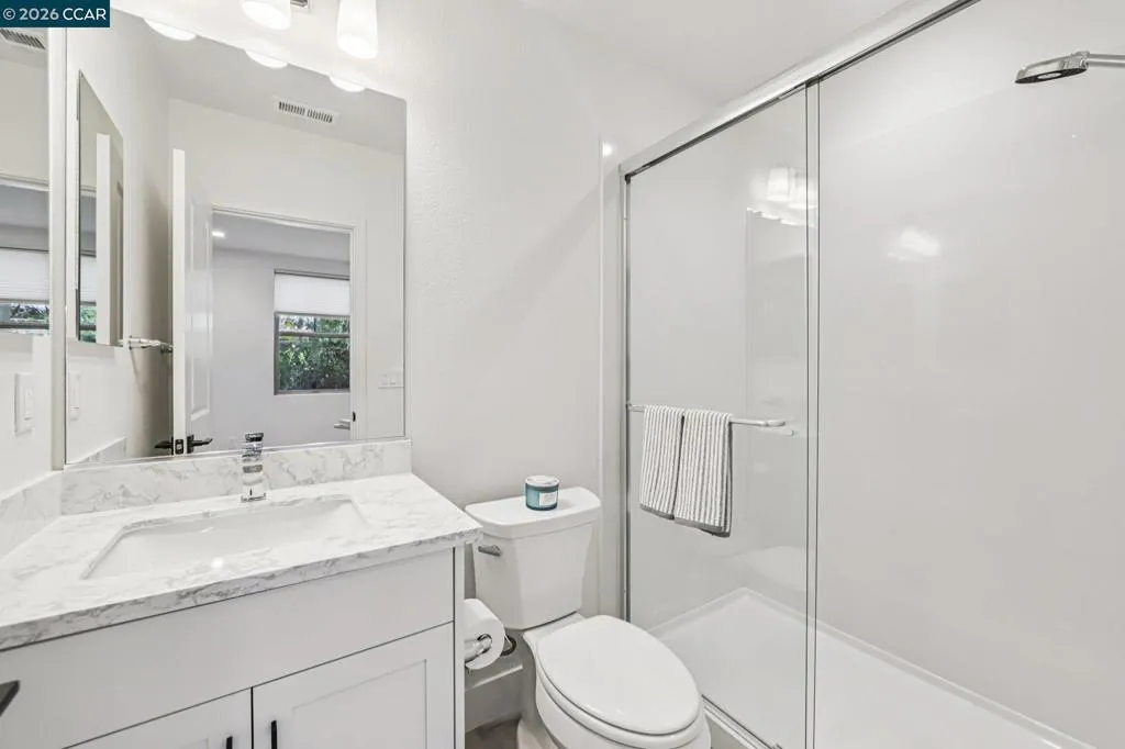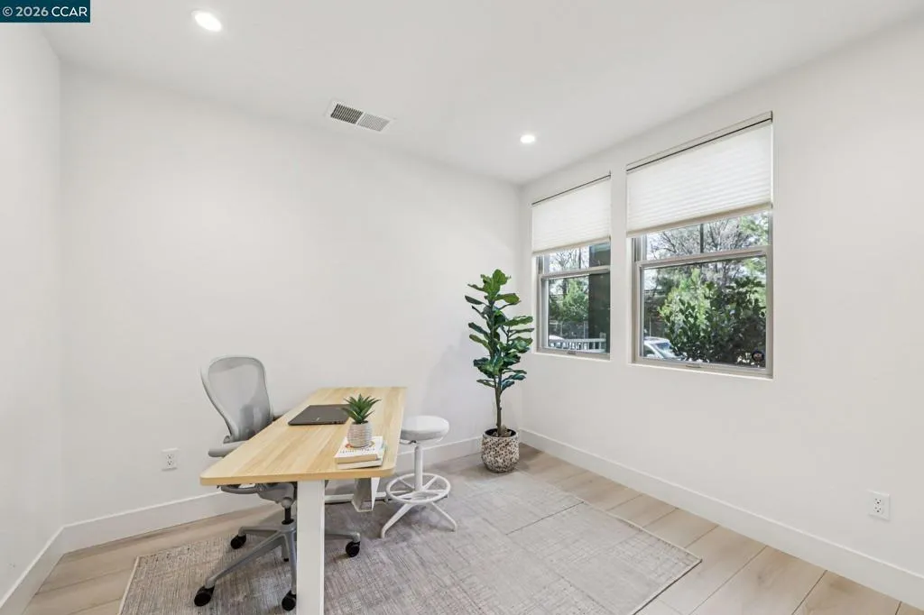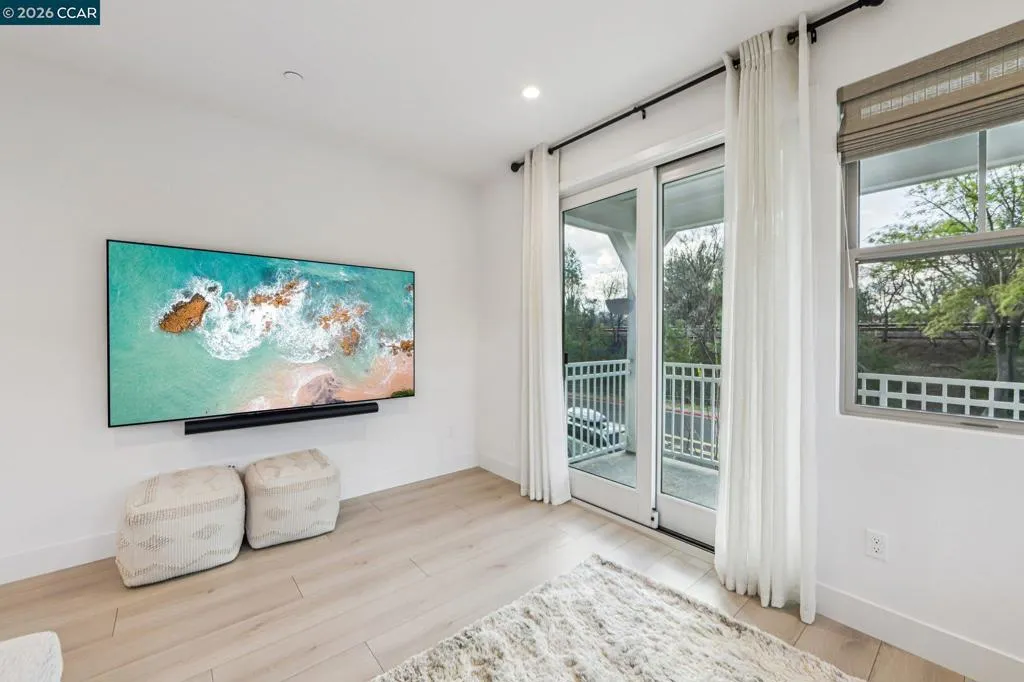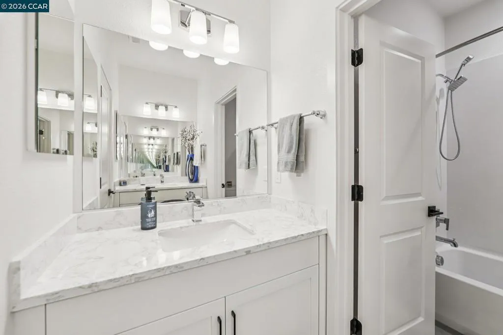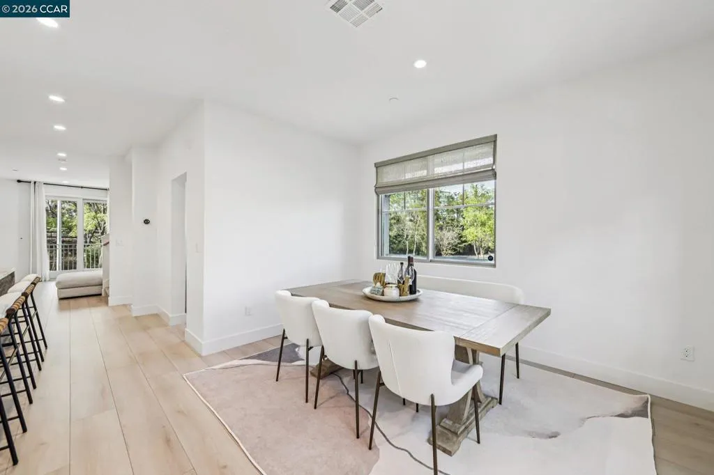 Practically new and beautifully upgraded, this light-filled townhouse-style condominium offers thoughtfully designed living across three levels. As a desirable end unit, it enjoys added privacy, a street-facing location with convenient guest parking, and sits directly next to the community dog park. The entry level features a private bedroom with ensuite bath and direct access to the attached two-car garage, ideal for guests, multigenerational living, or a home office. The main level showcases a stunning kitchen with a waterfall marble island, custom pantry shelving, abundant recessed lighting, and seamless flow into the living and dining areas. A charming office nook, stylish powder bath, and private deck complete the space. Upstairs offers a spacious primary suite, two additional bedrooms, a full bath with double vanity, and a convenient laundry room. Upgrades include owned solar, additional lighting, high-quality window coverings, custom closet shelving in 2 of the rooms, upgraded walk in closets—too many upgrades to mention. Located in the sought-after SummerHill community just one block from BART, with easy freeway access and close to Bay Club. A must-see