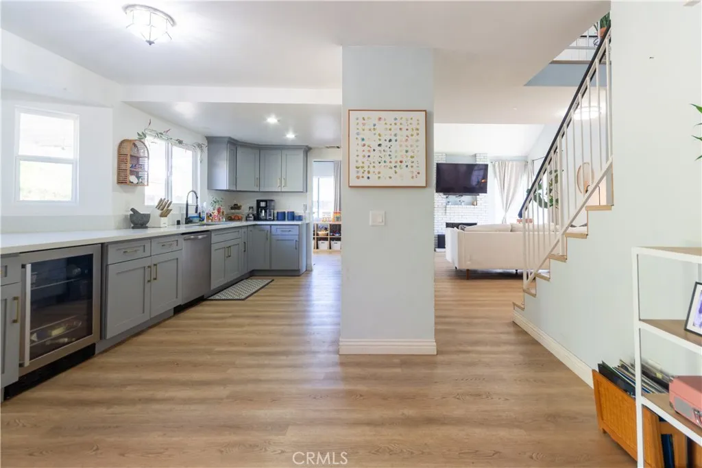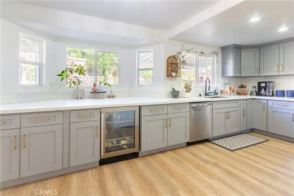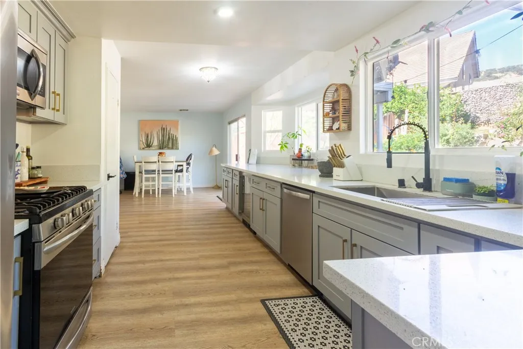 This beautifully maintained 3-bedroom, 2.5-bath home offers approximately 1,786 square feet of thoughtfully updated living space paired with an exceptional outdoor setting. The main living areas showcase upgraded luxury vinyl plank flooring, creating a cohesive and modern feel throughout. The remodeled kitchen is designed with shaker-style cabinetry, quartz countertops, updated hardware, stainless steel appliances, and generous prep space—perfectly balancing style and functionality. A whole-house water softener system and WiFi-controlled front and rear irrigation system add everyday convenience and efficiency. Expansive windows invite abundant natural light while framing serene backyard views, enhancing the open and welcoming atmosphere. The backyard is truly a standout feature, showcasing a mature collection of fruit trees including Navel oranges, tangerine, kumquat, Meyer lemon, Bearss lime, Lisbon lemons, pomegranate, guava, avocado, banana, fig, and pear—offering both visual beauty and year-round harvest potential. Additional highlights include leased solar for energy efficiency and no HOA. Ideally located near local schools, shopping, parks, and convenient commuter access, this home presents an exceptional opportunity in the heart of Lake Elsinore.