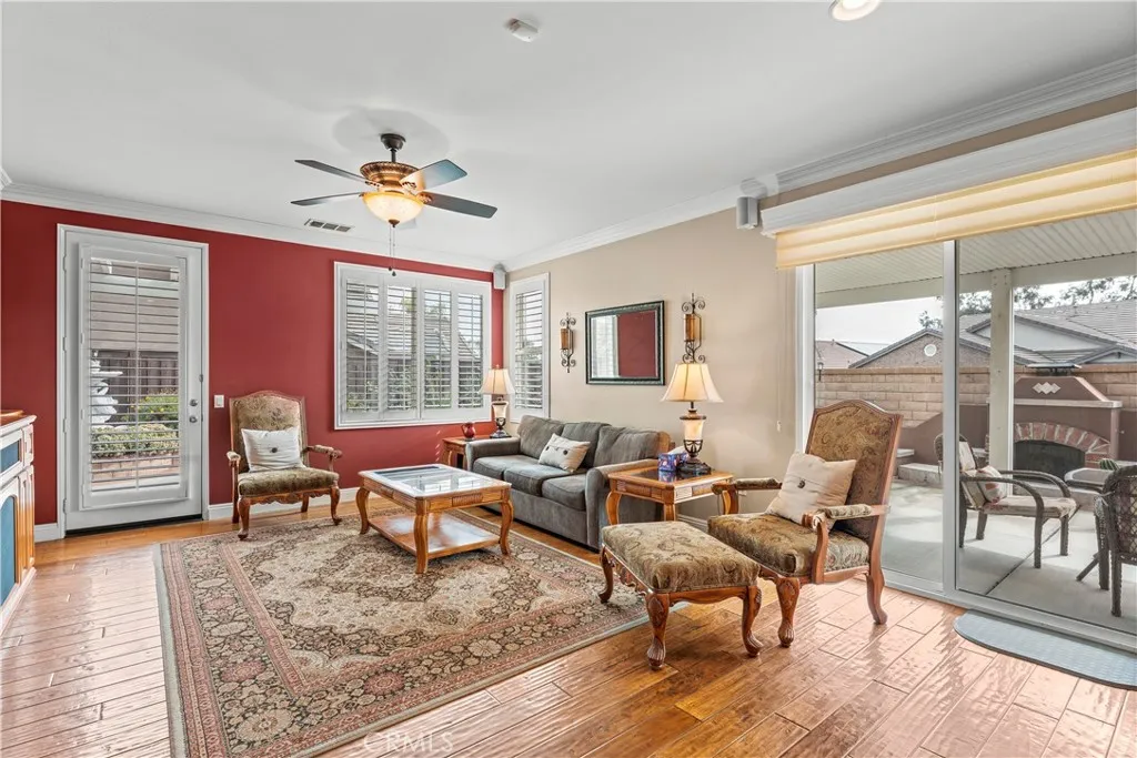 - Elegant finishes throughout: wood floors, plantation shutters, crown molding, and ceiling fans in every room