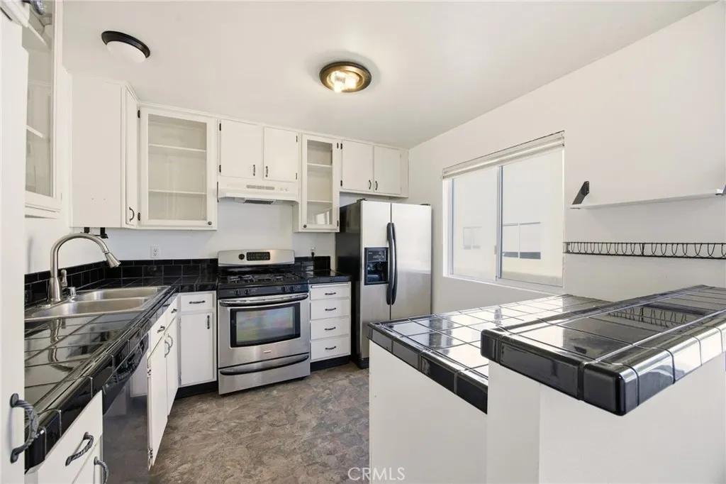 The kitchen includes black tile countertops, linoleum flooring, and stainless steel appliances, providing a solid foundation for future updates tailored to your taste. The spacious primary bedroom offers a walk in closet with generous storage, and the private patio creates a welcoming outdoor space ideal for relaxing or entertaining.