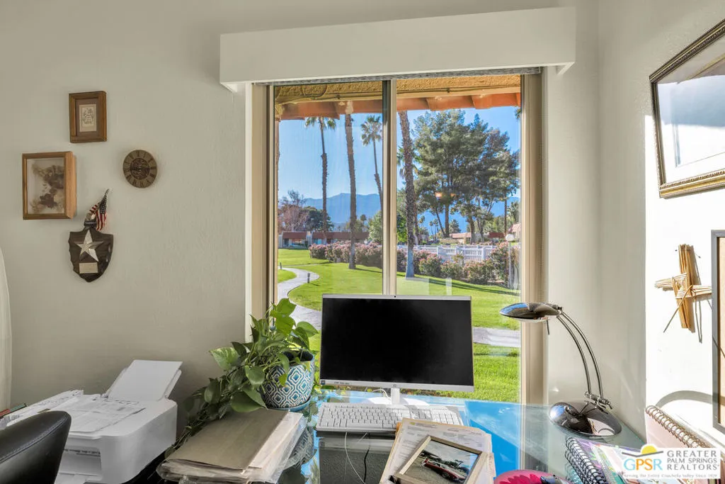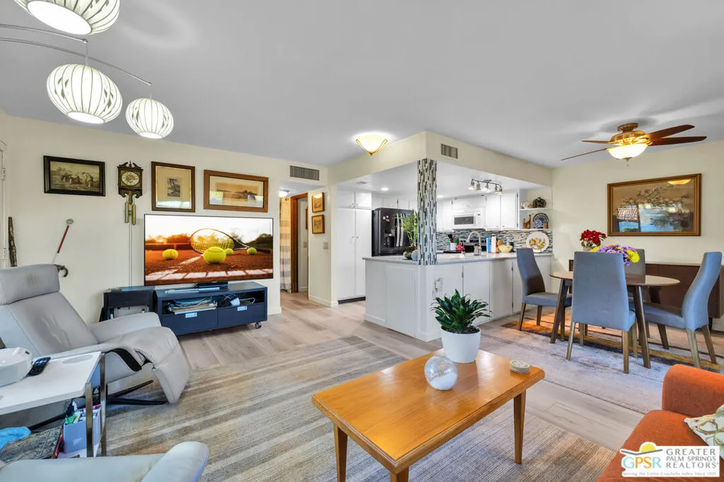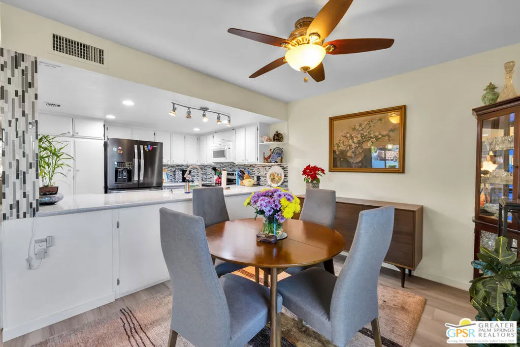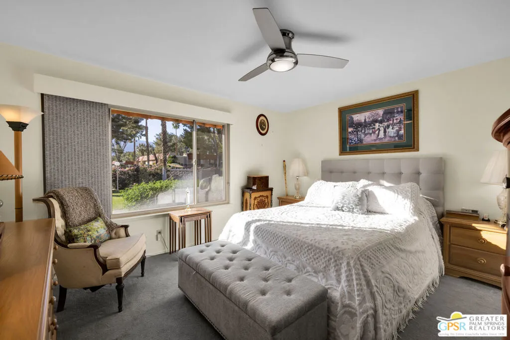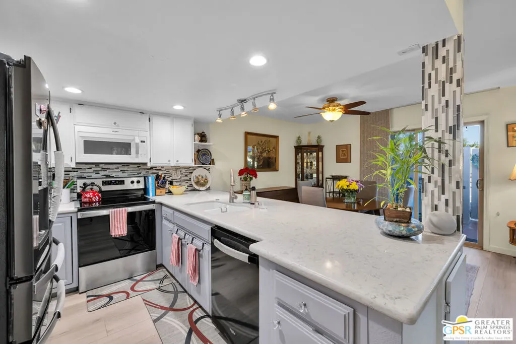 Discover one of the finest examples of modern desert living in the Mountain View Villas community in Rancho Mirage. This beautifully updated 3-bedroom, 2-bath condo has been nicely remodeled over recent years, and it is ready for immediate move-in. Key upgrades and features include: newer roof and dual pane energy-efficient windows with Hunter Douglas shades, hardwired ceiling fans for year-round comfort, solid-core interior doors, remodeled kitchen with elegant quartz countertops, durable luxury vinyl plank flooring and plush carpet in bedrooms, tankless instant hot water heater, newer appliances, two-car attached carport for convenient parking, and an expansive private enclosed patio that contains a large additional storage room. This fee-simple condo means you own the land. Resort-style community amenities include a well-maintained, gated oasis with five swimming pools, tennis courts (including pickleball), a spacious clubhouse, and acres of serene green space and walking paths. With easy access to both ends of the Coachella Valley, you're minutes from shopping, dining, golf, and the vibrant Palm Springs lifestyle. Ideal for full-time residents or seasonal escapes. Schedule your private tour today and experience the Mountain View Villas lifestyle firsthand!
